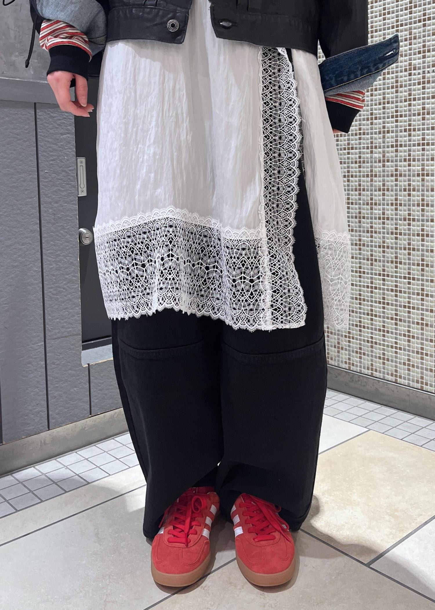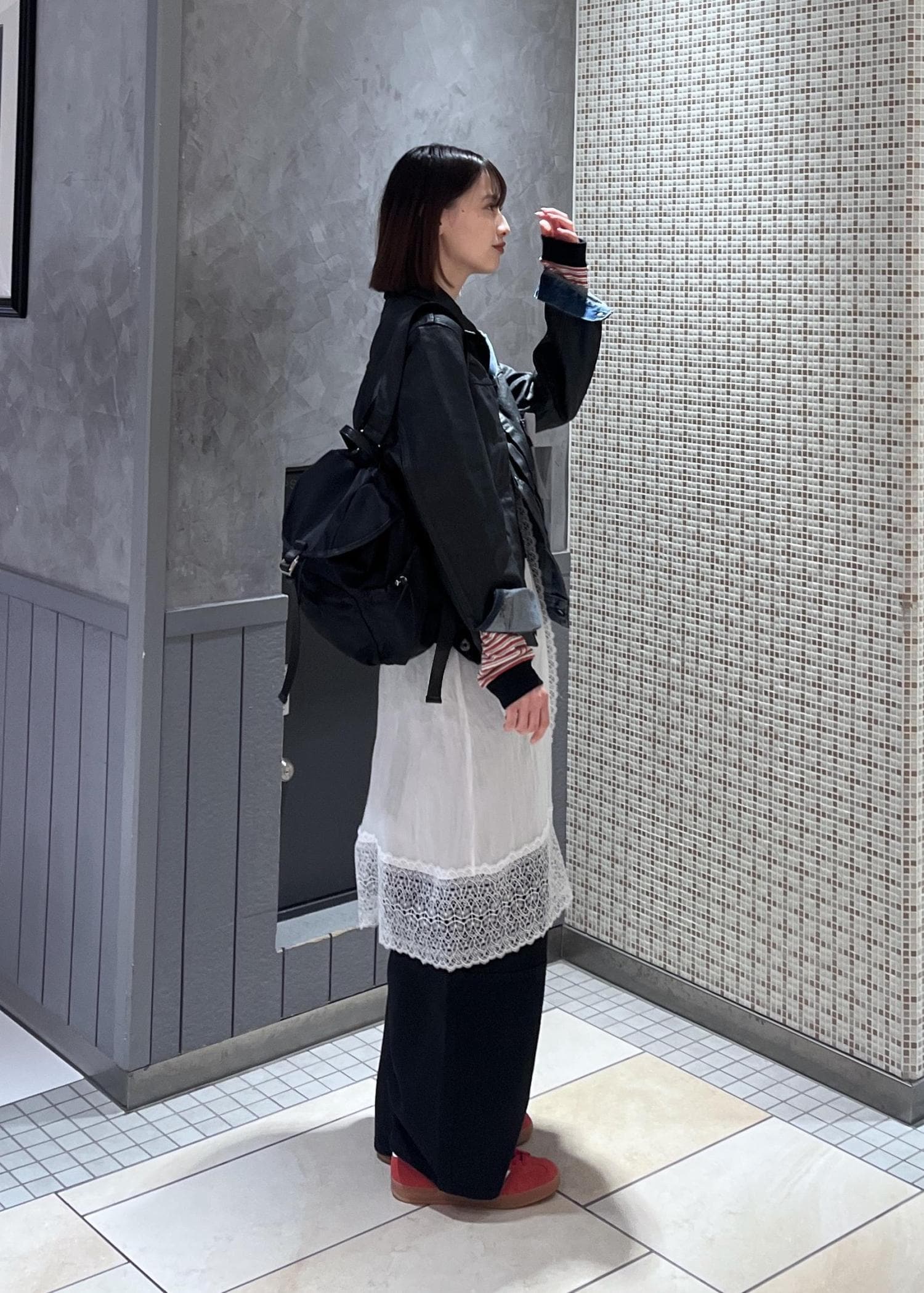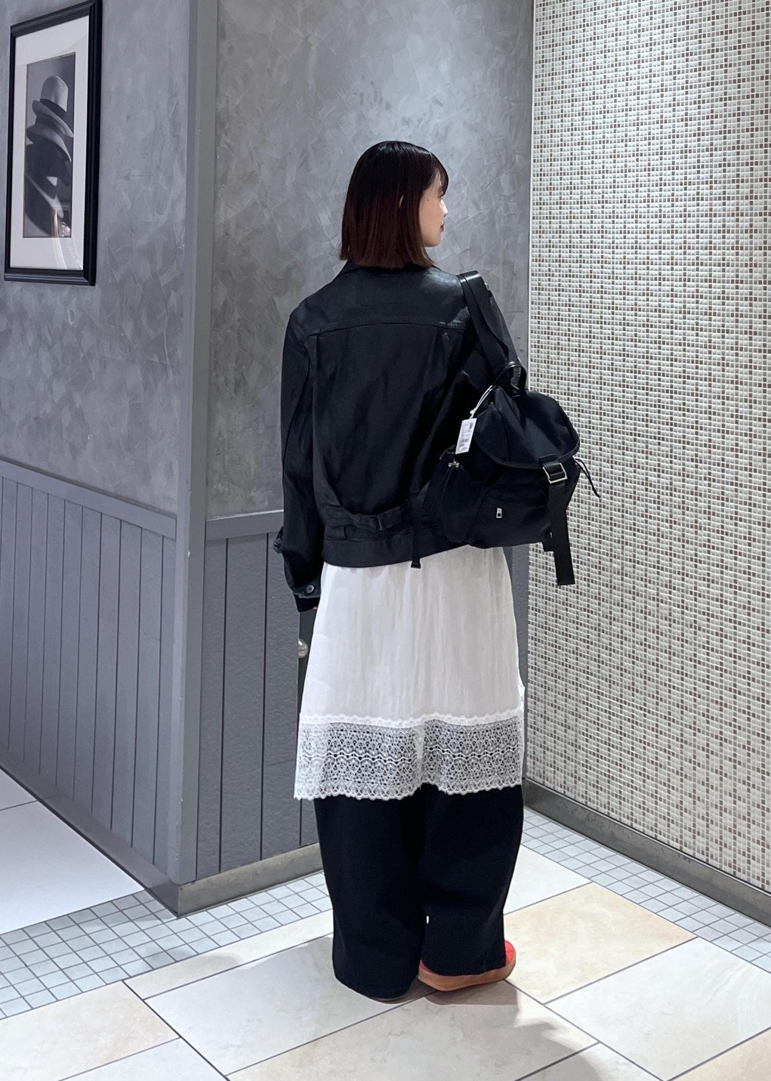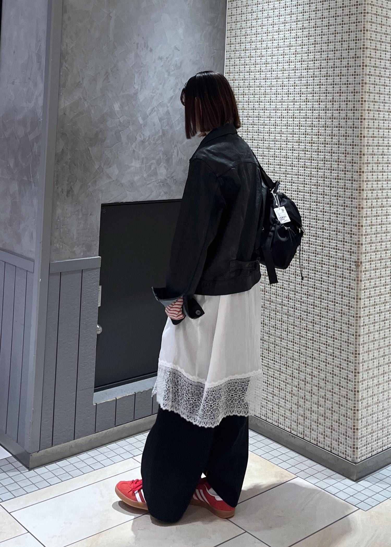 ブラックのPUコーティングされているのでとても雰囲気が出てかっこいいです!メンズライクでシックな雰囲気になり過ぎないようレースやボーダーTeeで女性らしさを出しました。