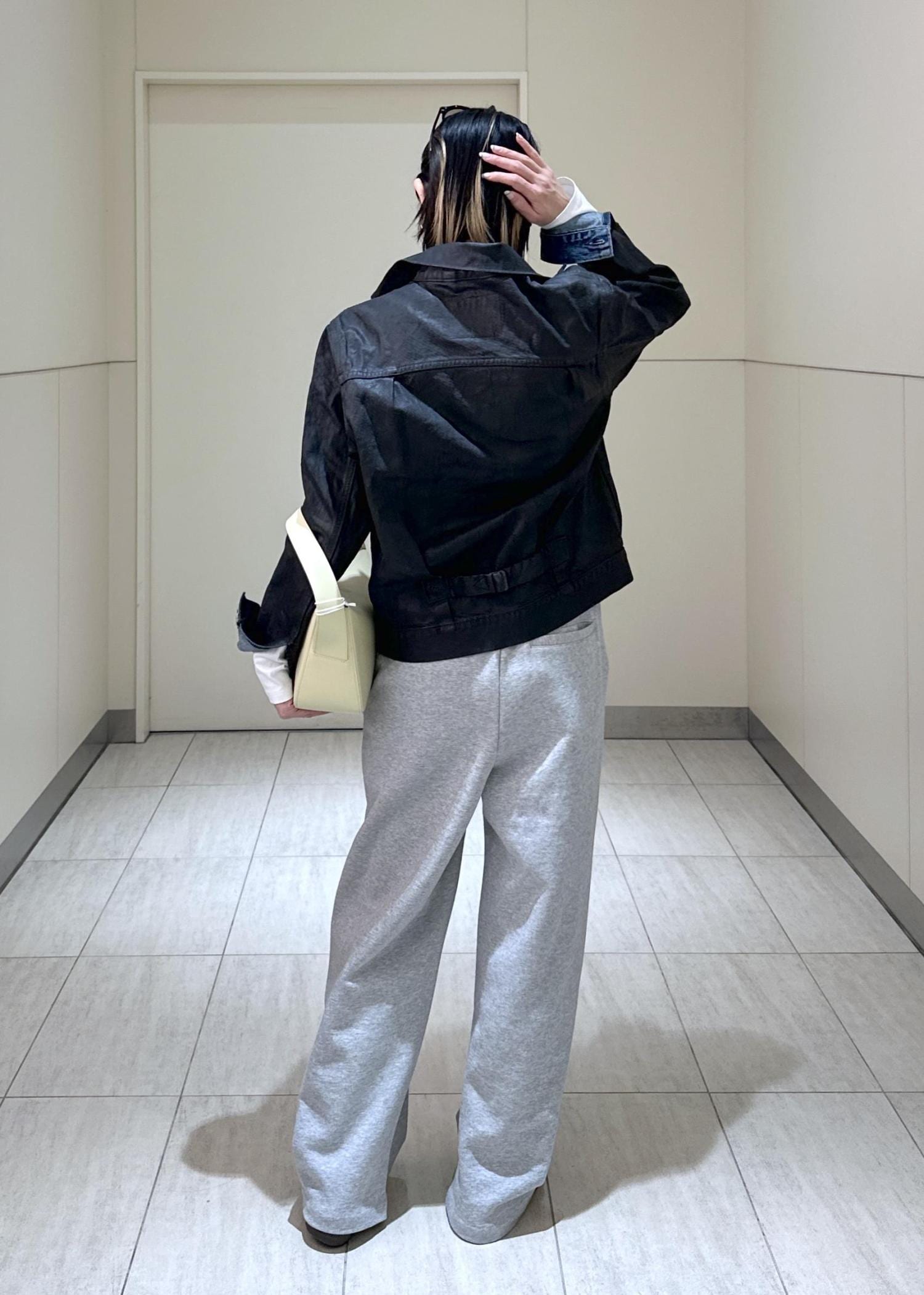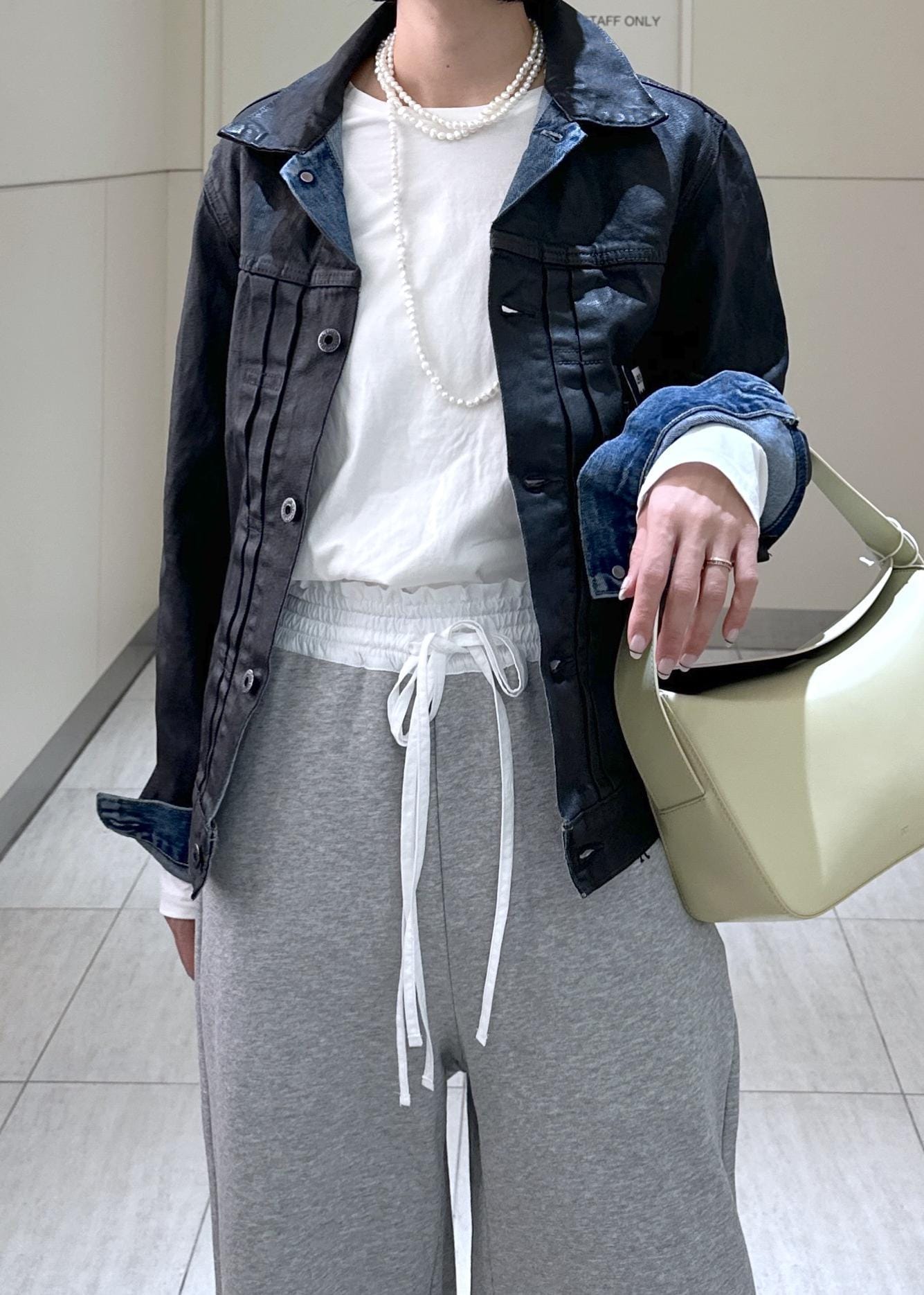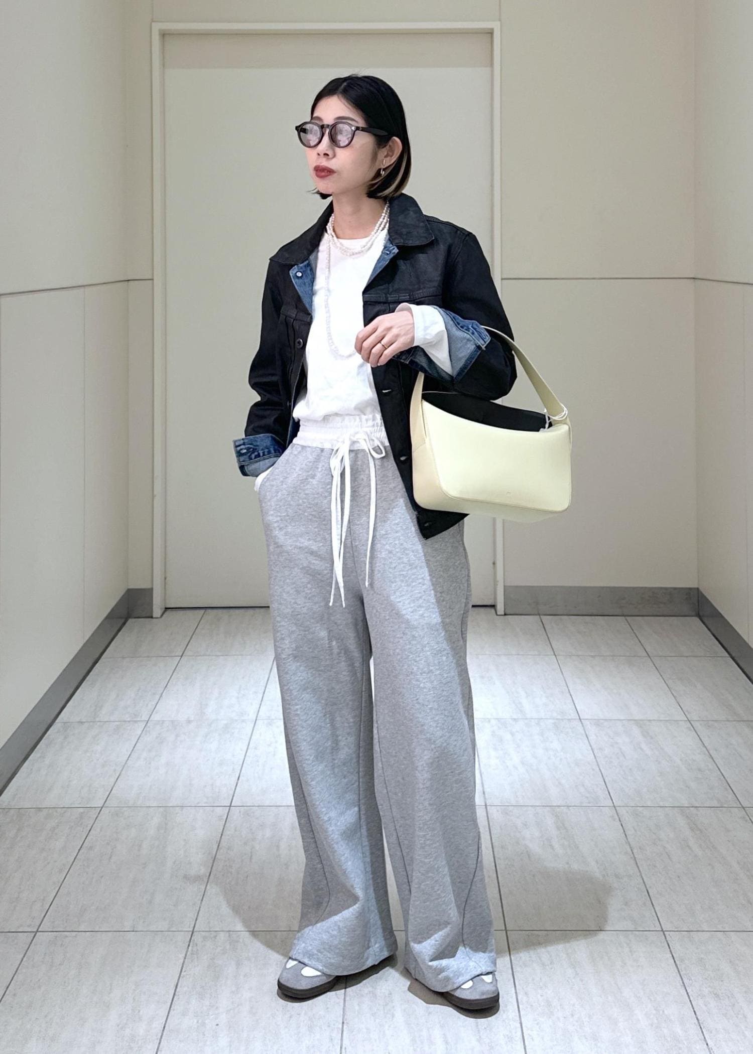かなりカッコイイムードのデニムジャケットなので、中はスウェットパンツにカットソーでラフに。パールを添えて少し女性らしさをプラスしました◎