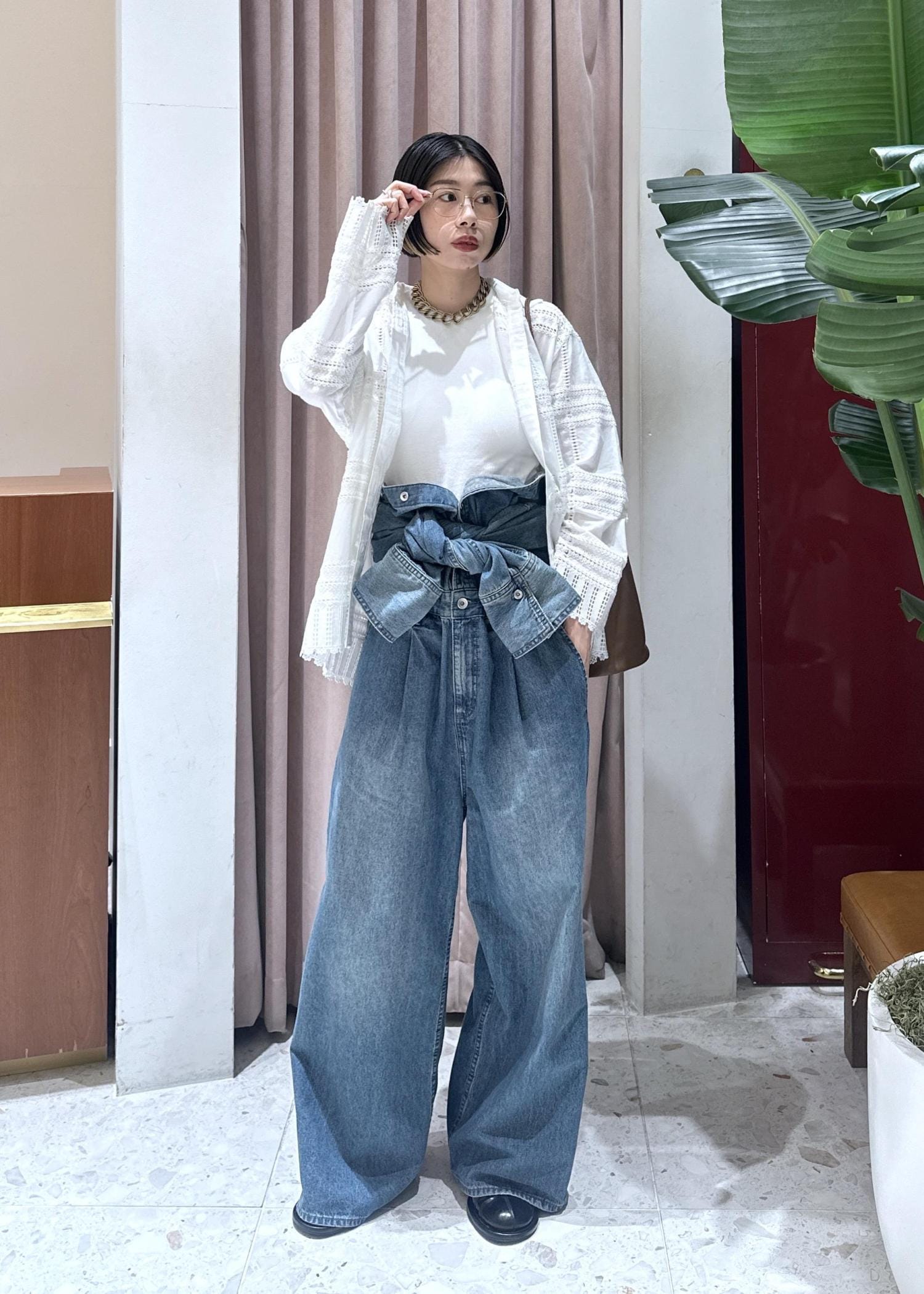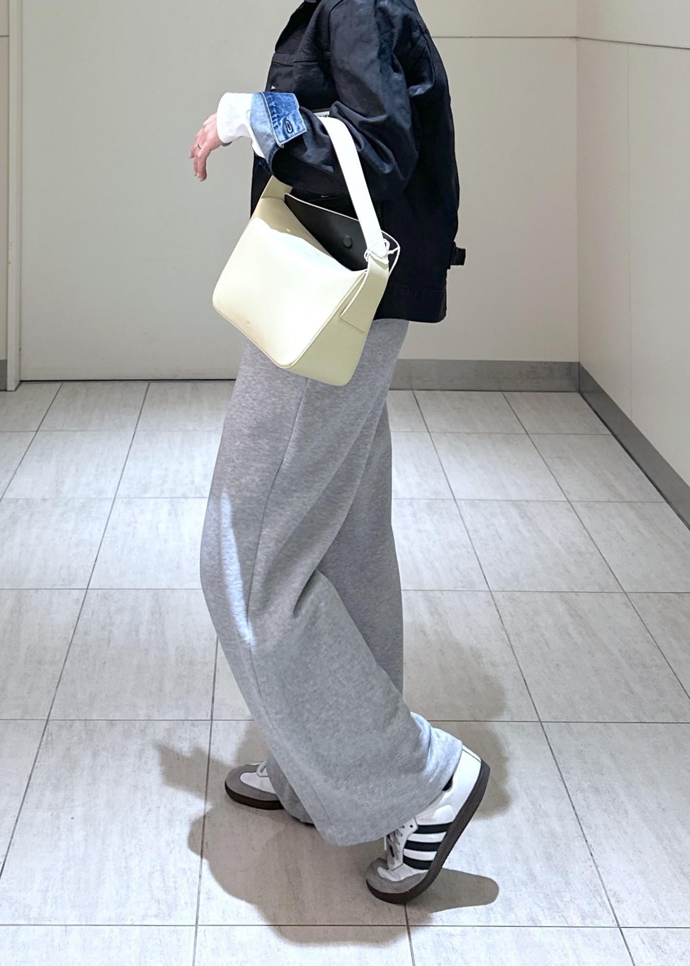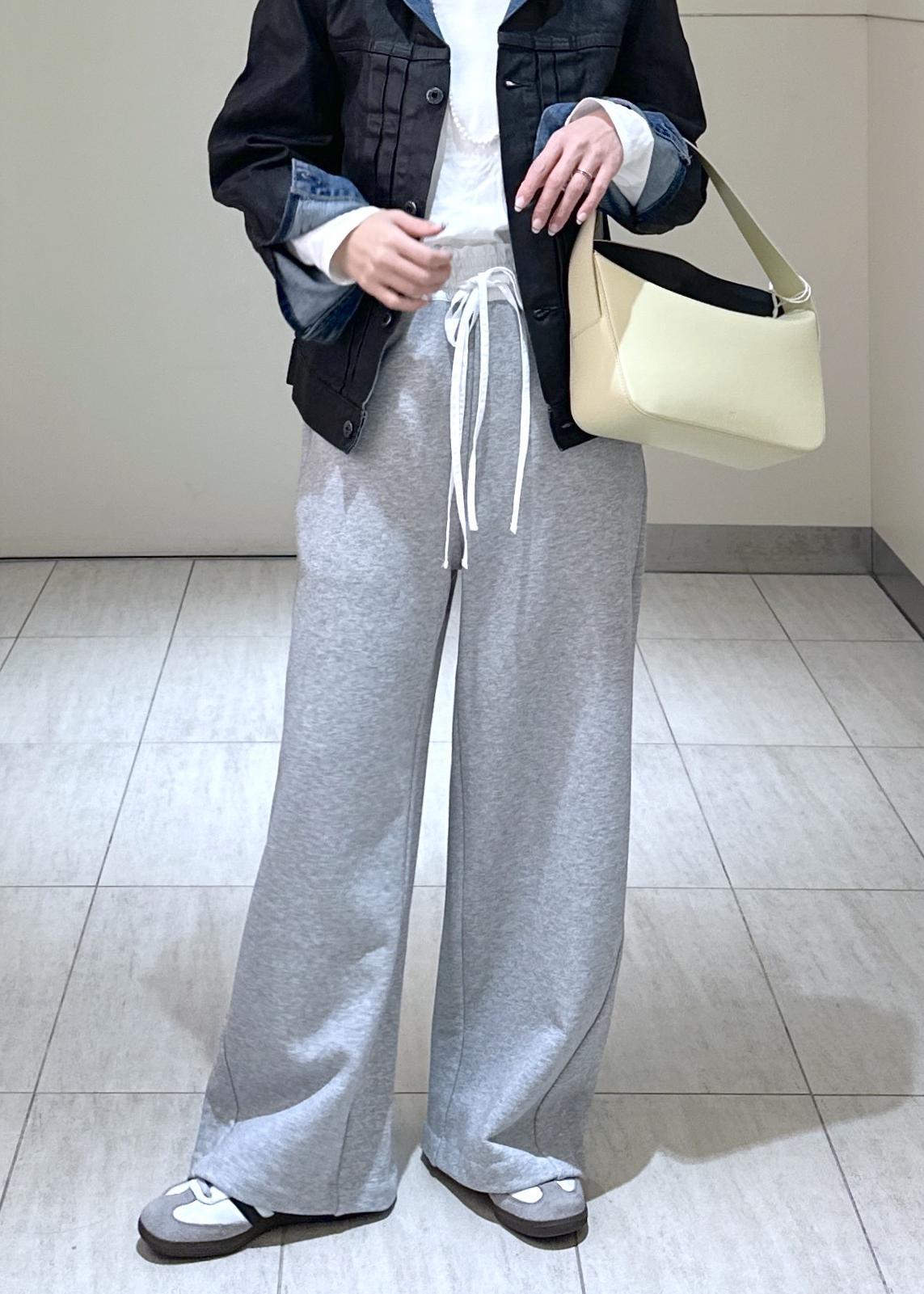 かなりカッコイイムードのデニムジャケットなので、中はスウェットパンツにカットソーでラフに。パールを添えて少し女性らしさをプラスしました◎