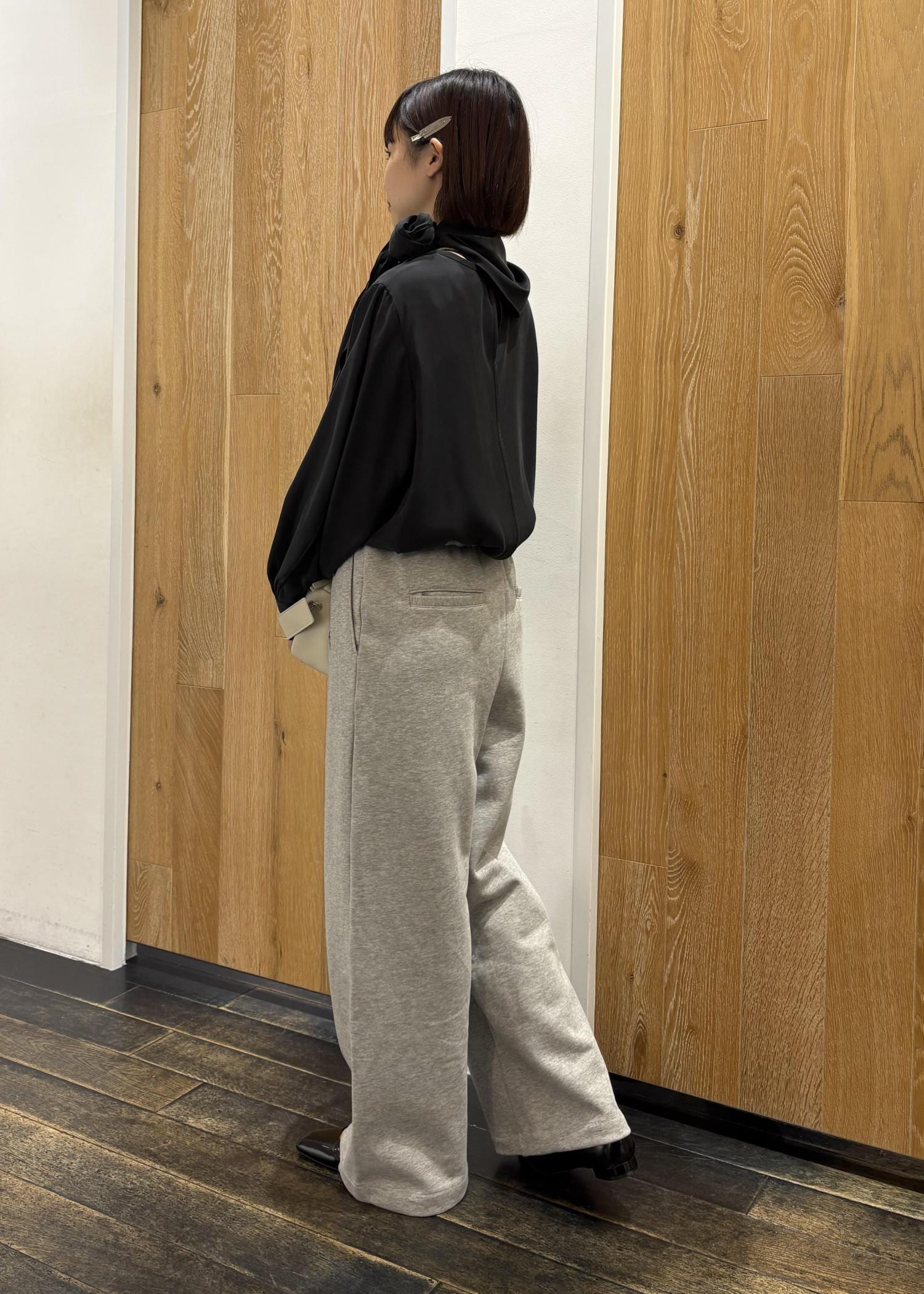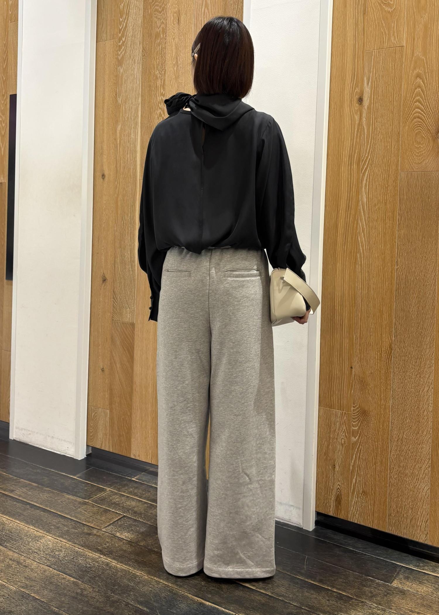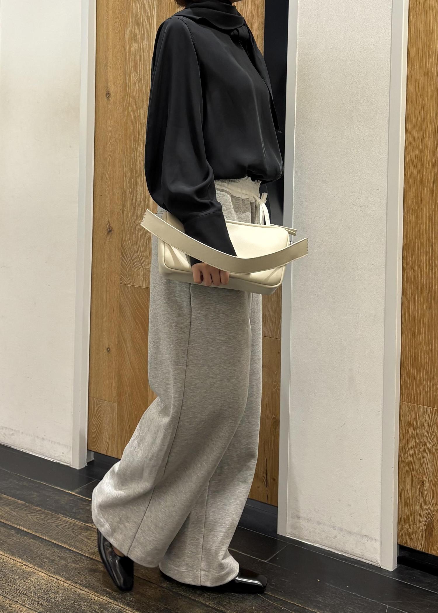 ブラウスにスウェットパンツを合わせることで、きれいめになりすぎず、程よくカジュアルに着られるのがポイントです。