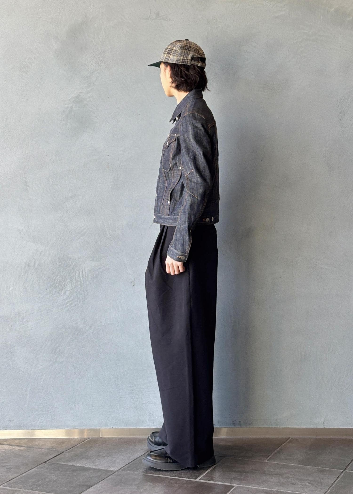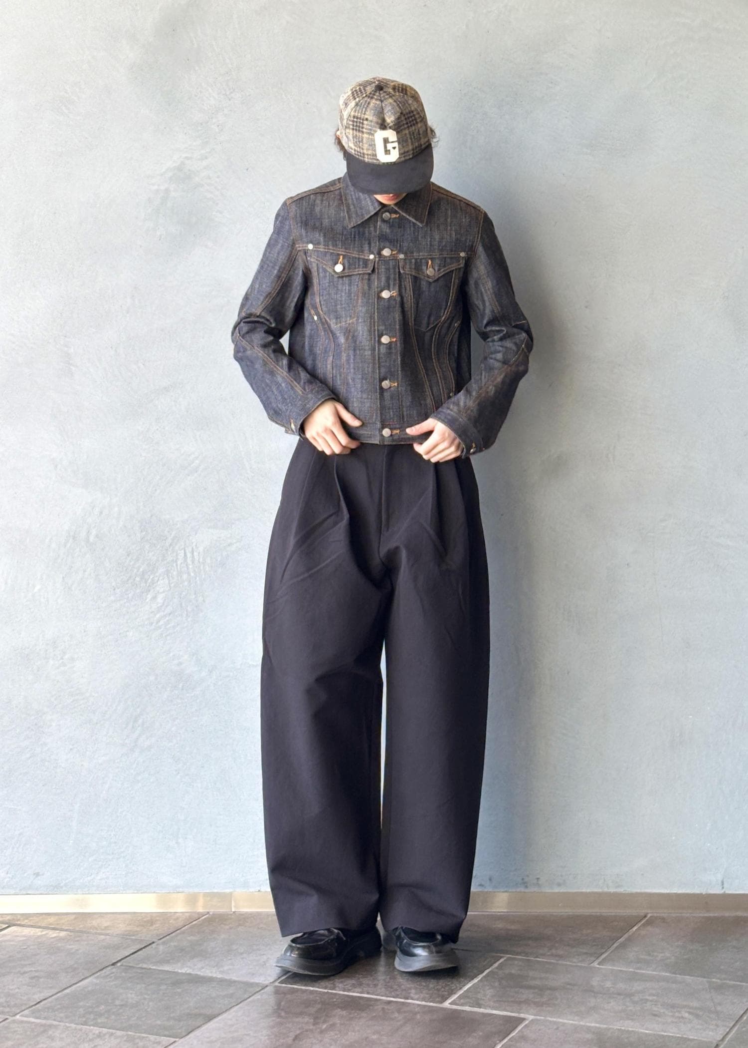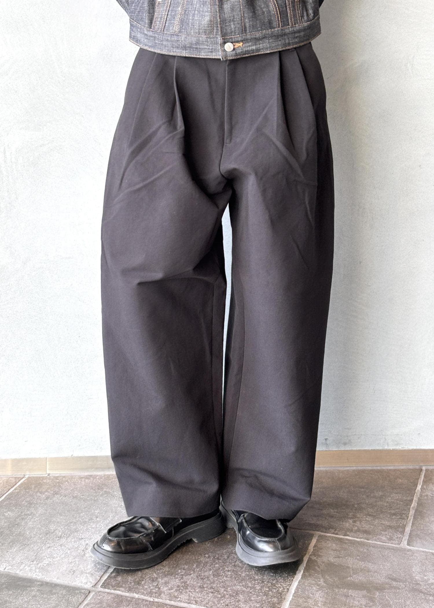 今回メインのNVRFRGTのリジットGジャンにオリジナルの激太の黒ワイドコットンスラックスで今っぽさをプラス。