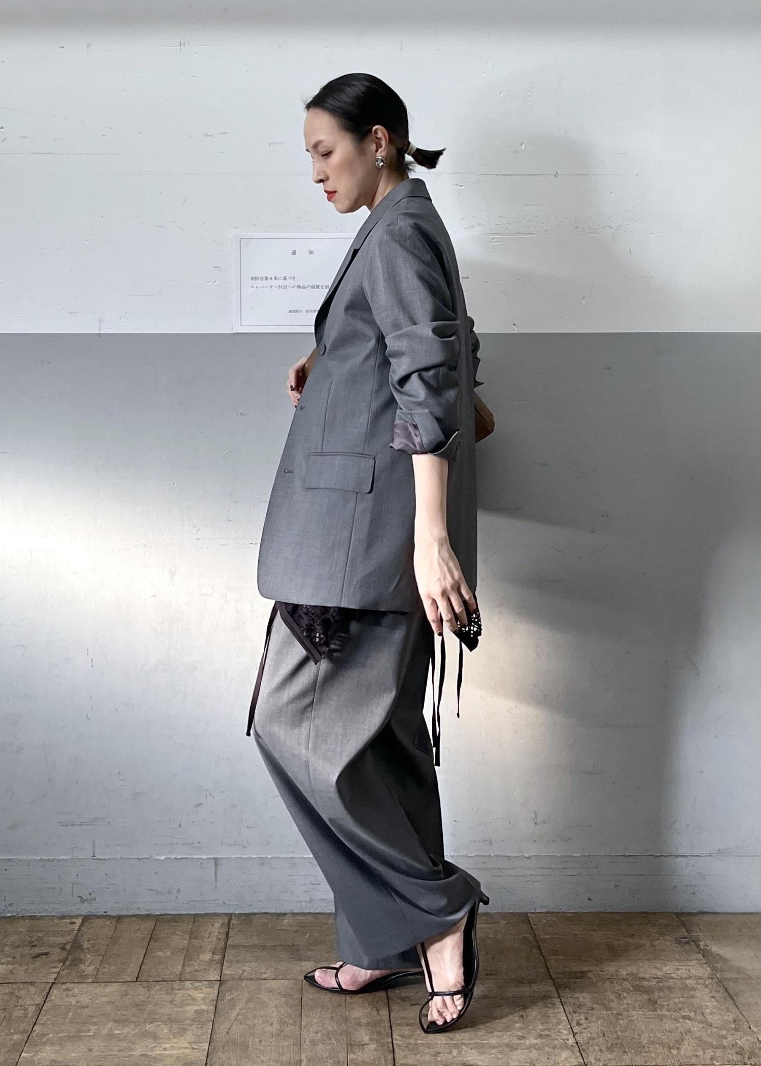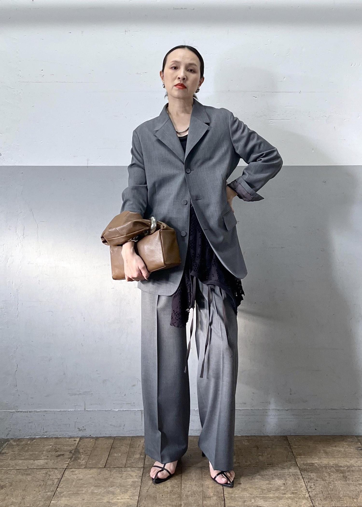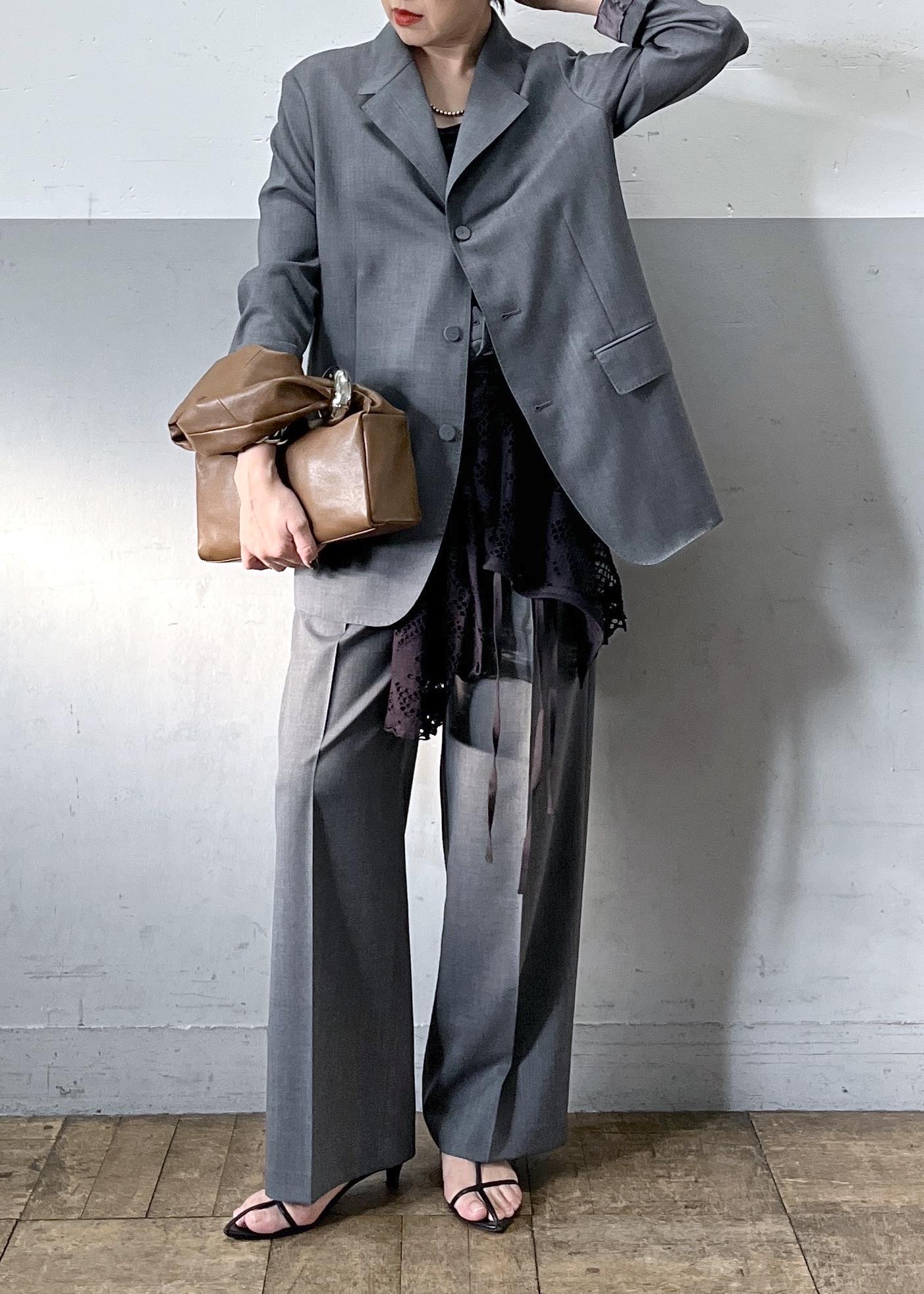 グレーのセットアップに、腰巻きしたレースカーディガンをアクセントにプラス。きちんと感のあるセットアップに抜けと女性らしさを加えた、大人の遊び心あるスタイリングです。