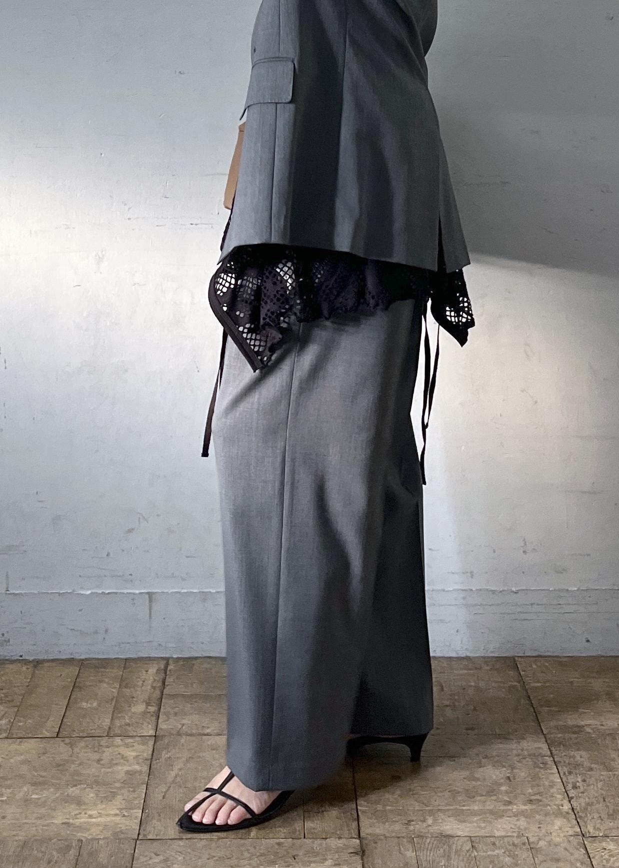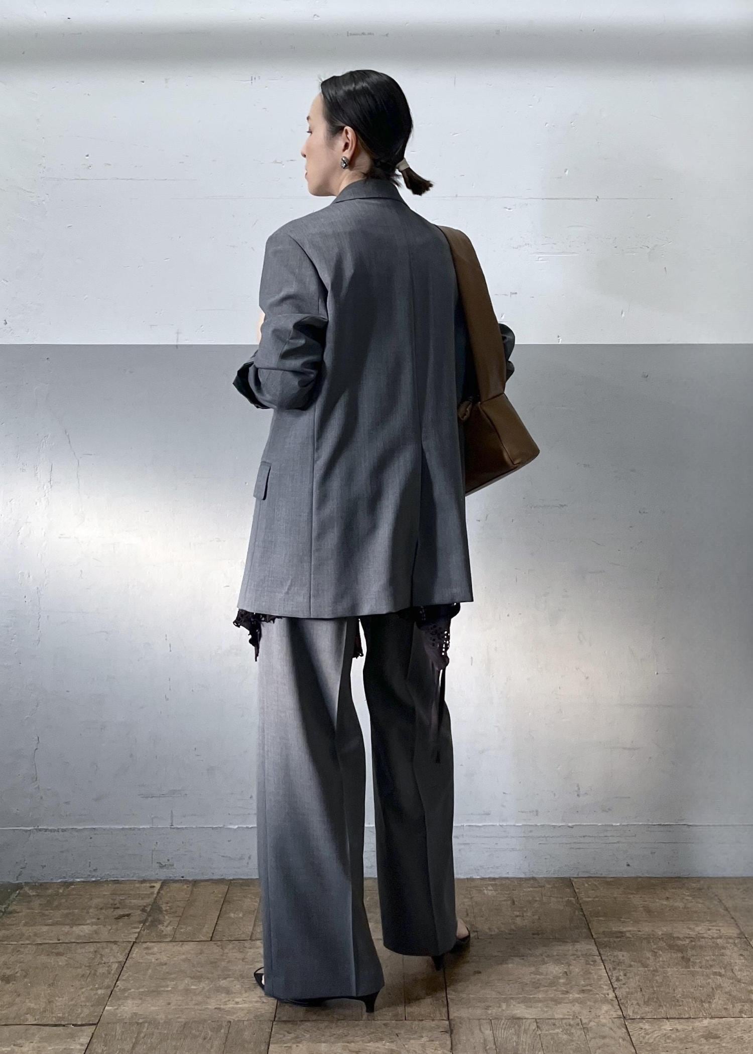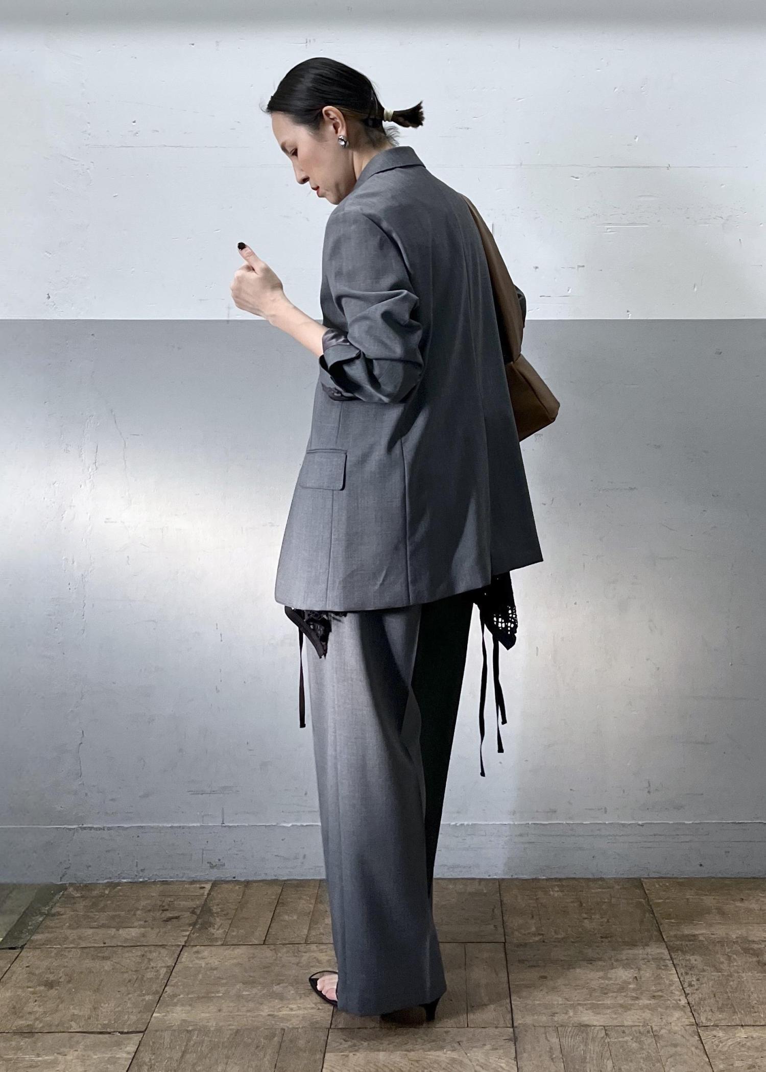 グレーのセットアップに、腰巻きしたレースカーディガンをアクセントにプラス。きちんと感のあるセットアップに抜けと女性らしさを加えた、大人の遊び心あるスタイリングです。
