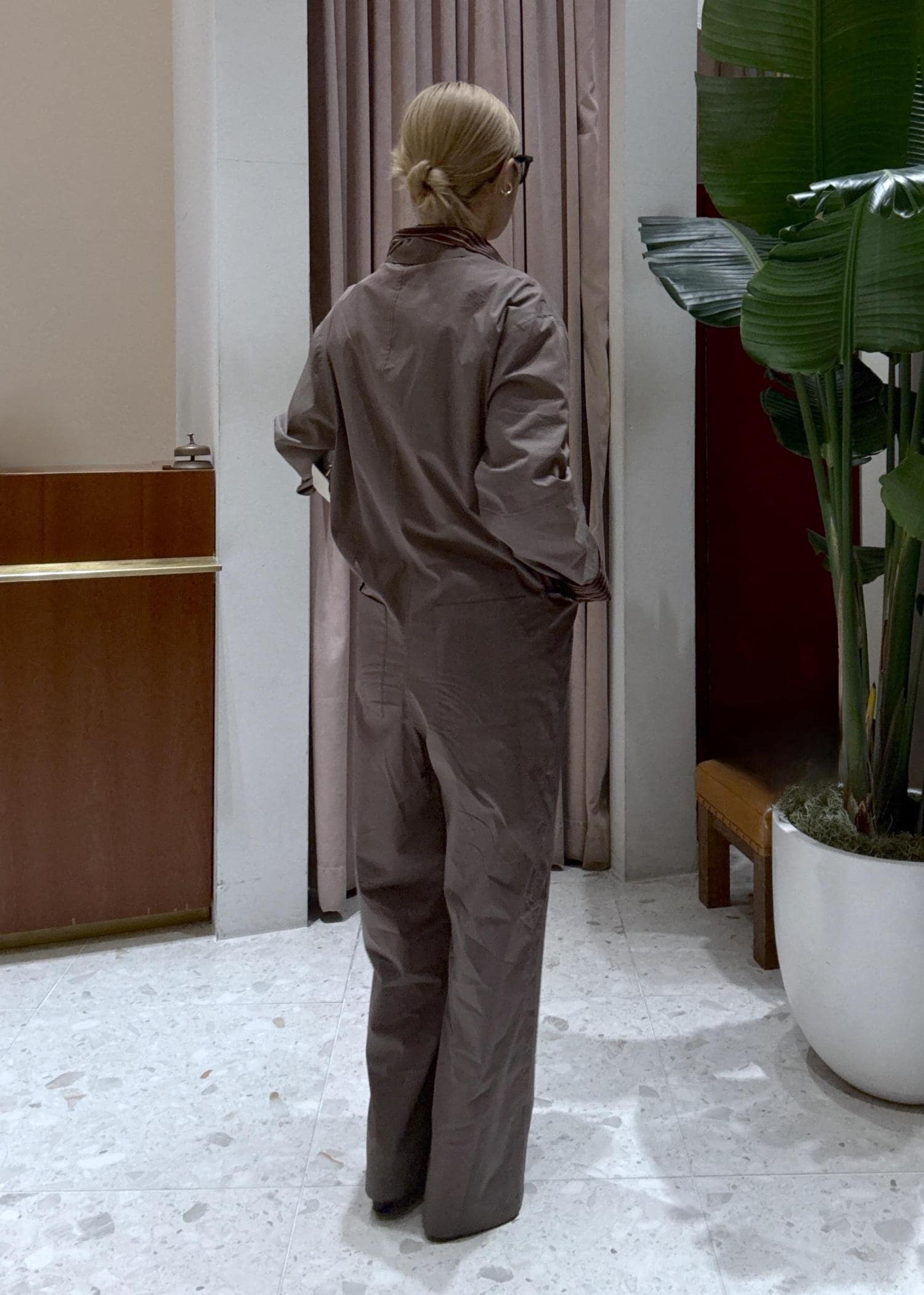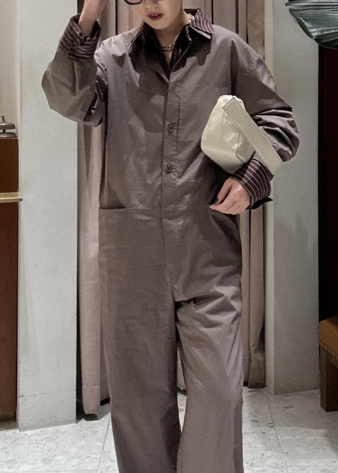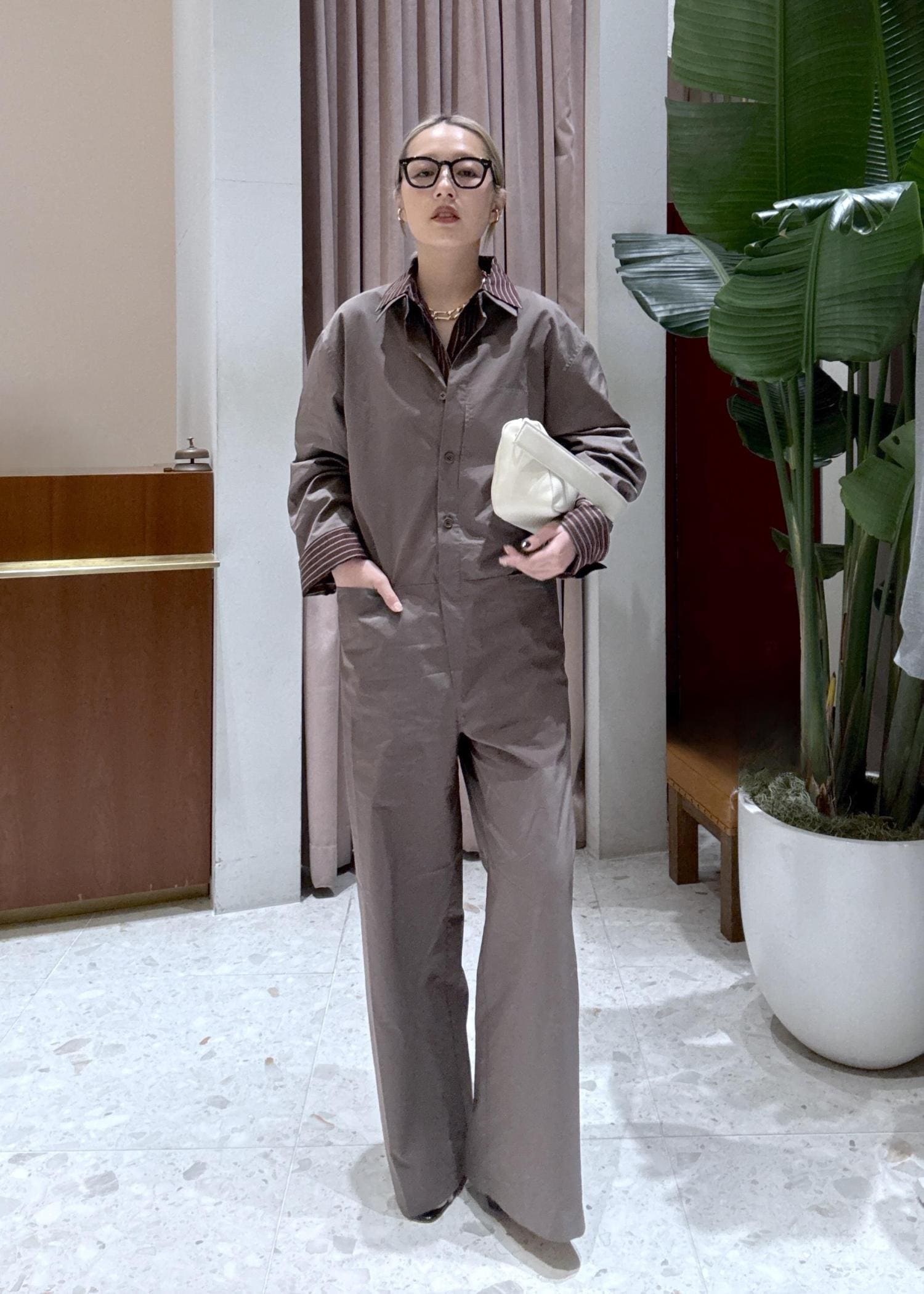 ミニマルなロンパースにシャツをインして、少しだけきちんと感をプラス。