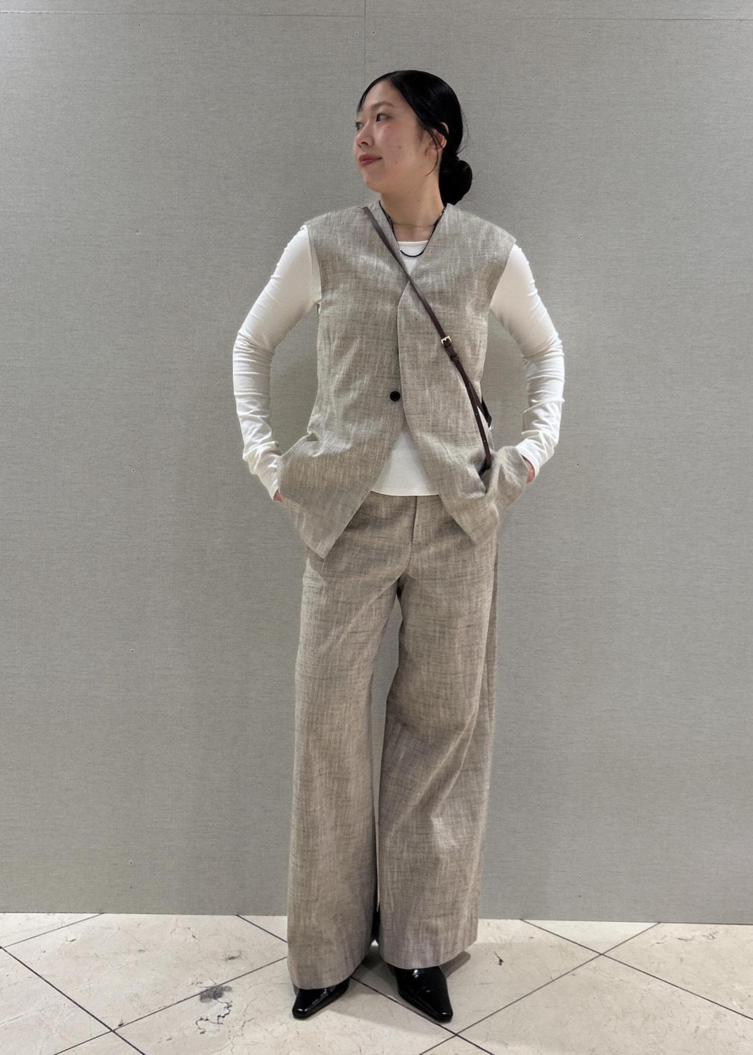 EMOELLE【EMOELLE】シルクネップスラックスベージュ / 38¥26,400レビュードライなサラッとして、ハリのある綺麗なシルエットなスラックスです。ハイウエスト過ぎず、長く使って頂けるデザインです◎