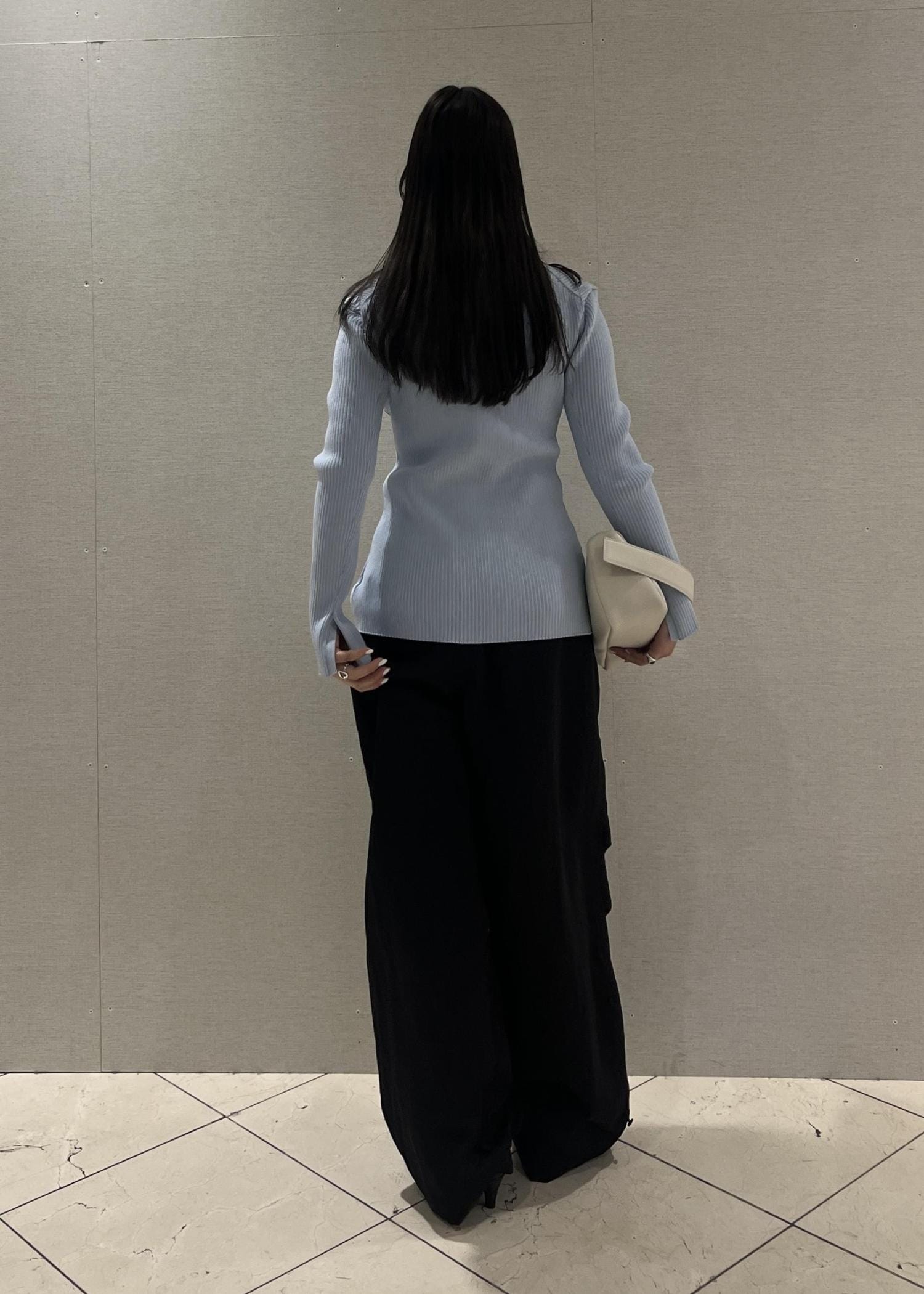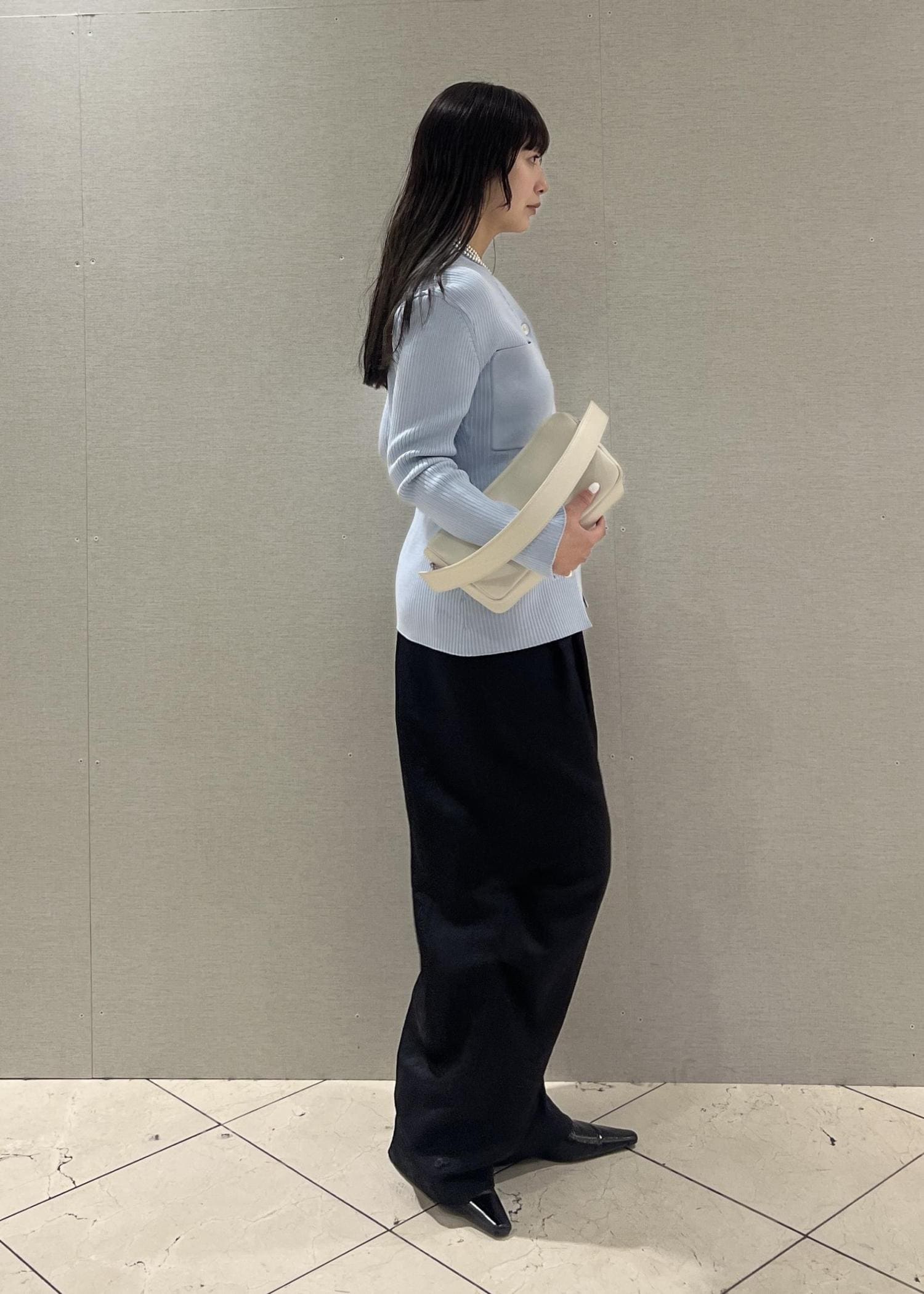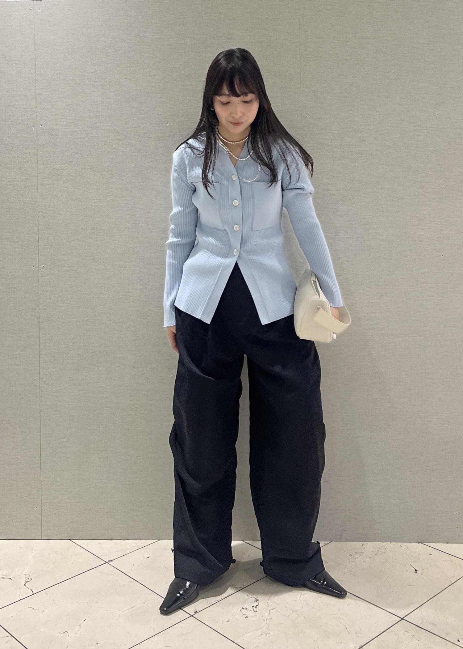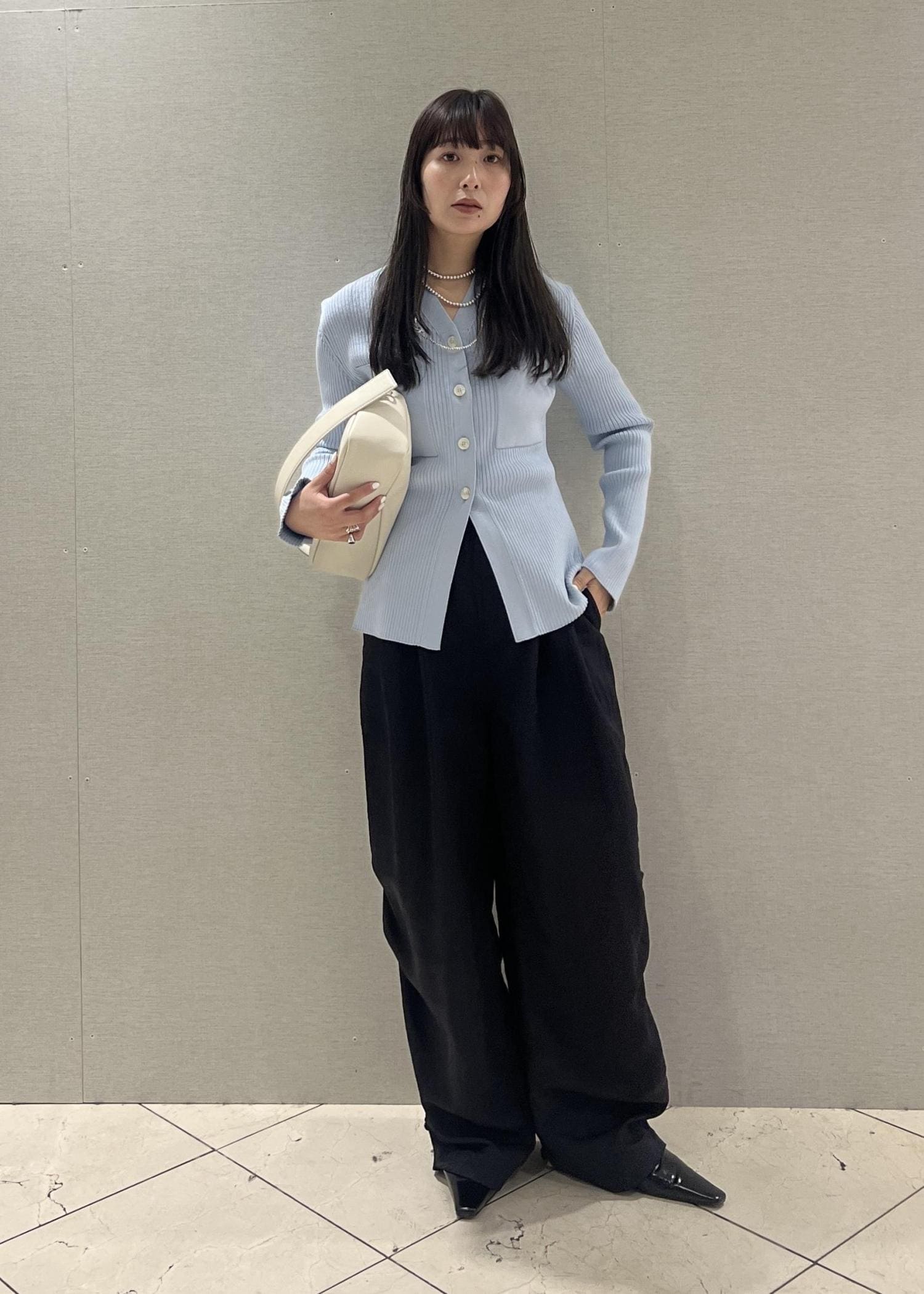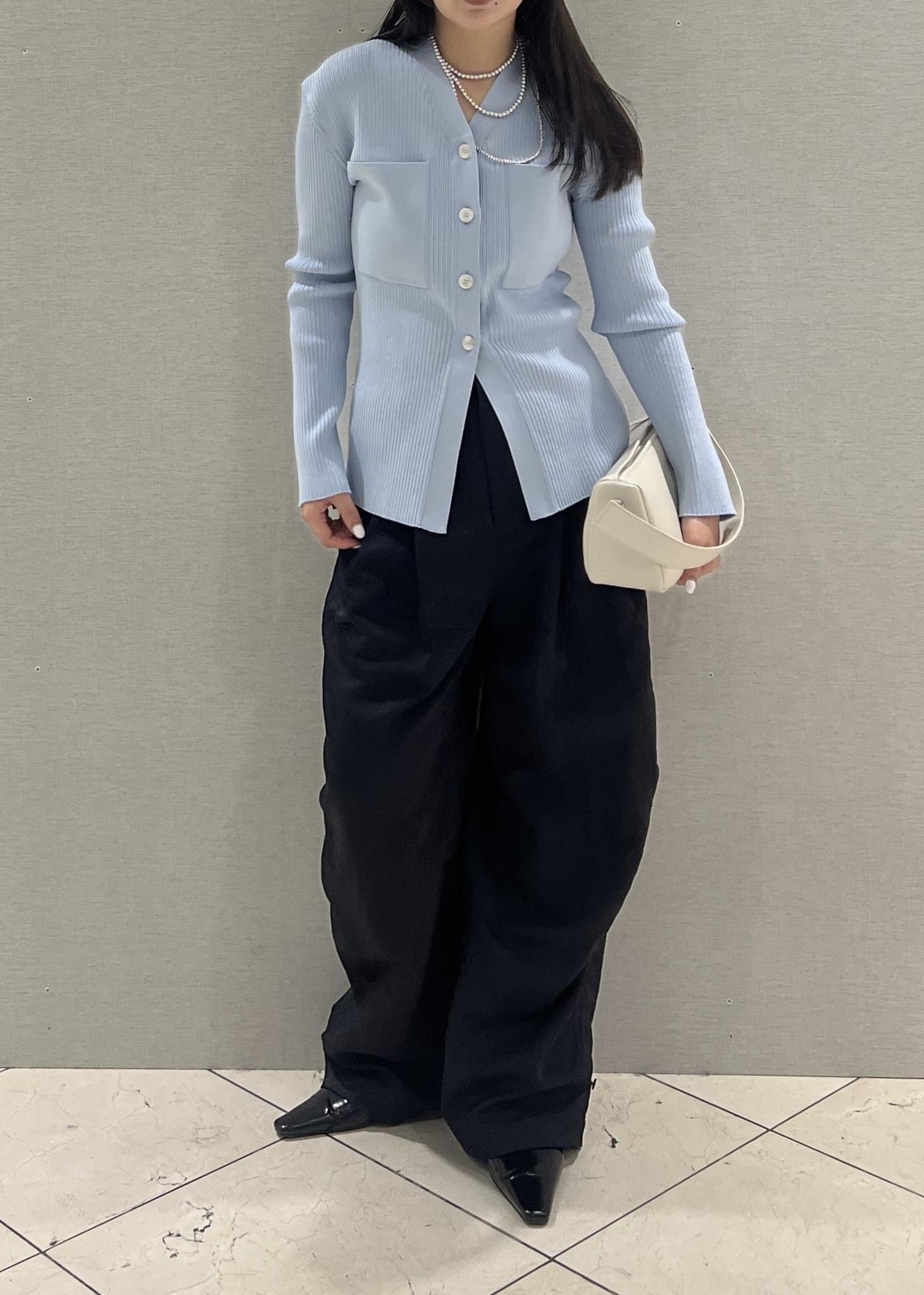 サックスブルーのカーディガンがとても綺麗ですよね!