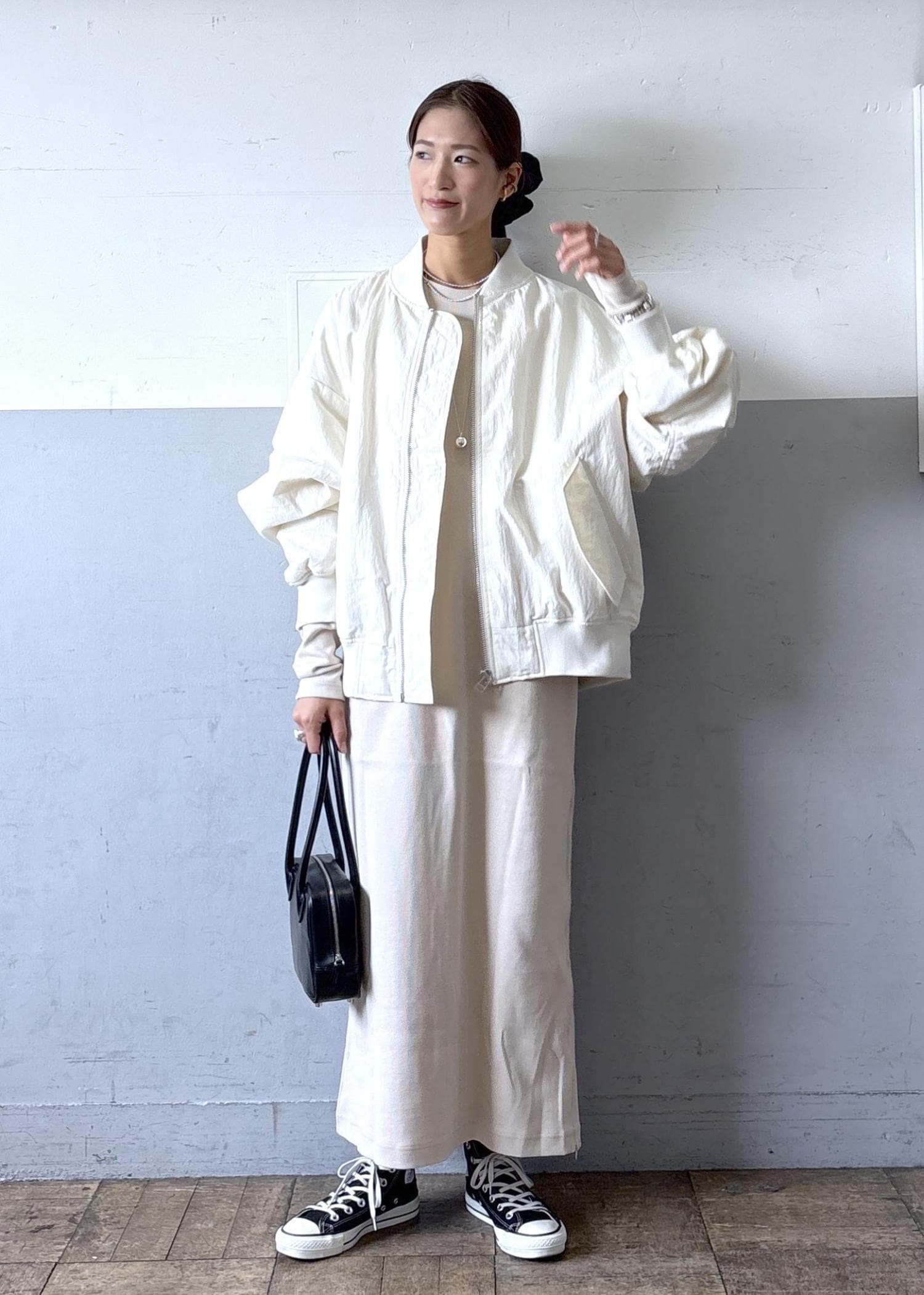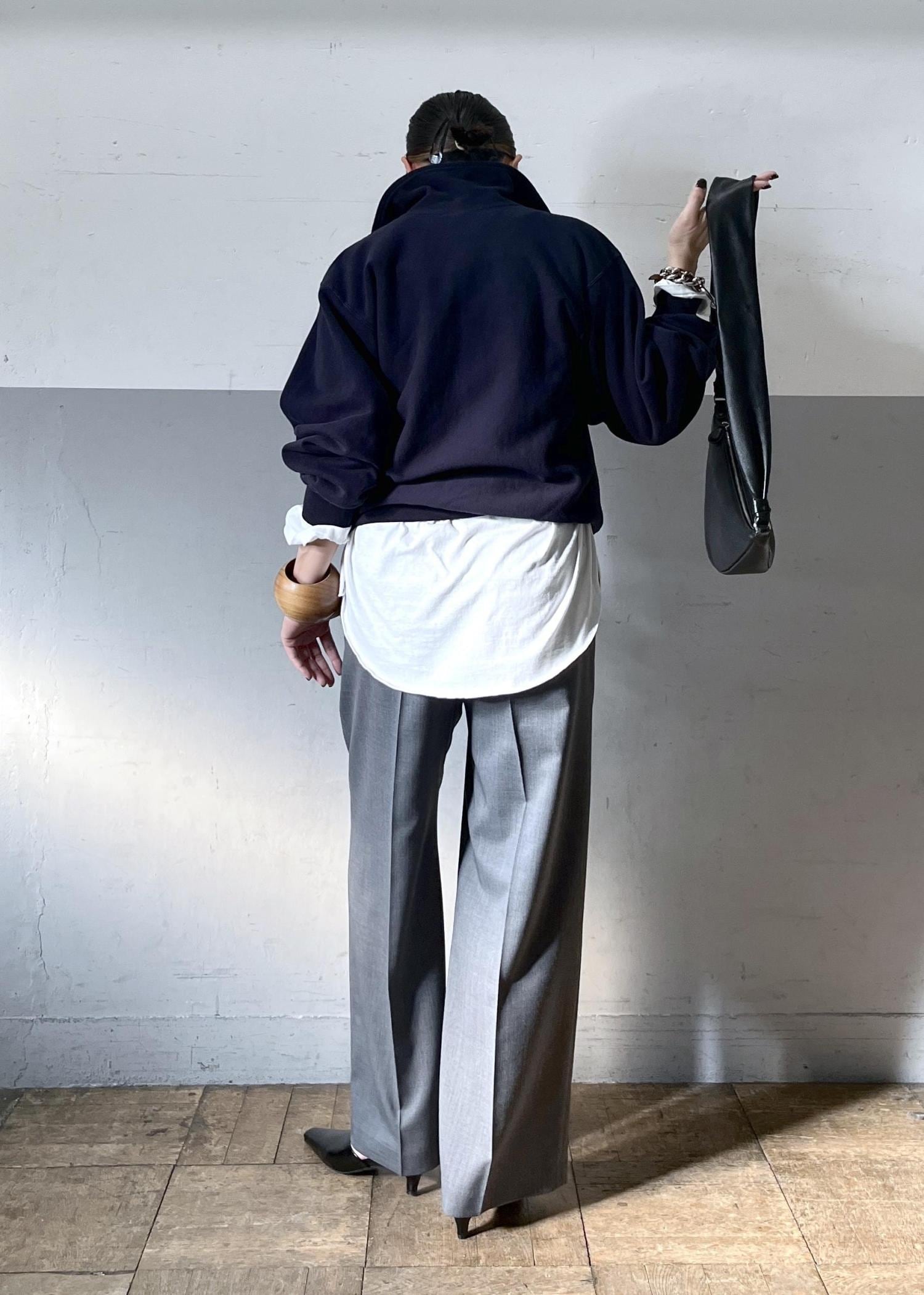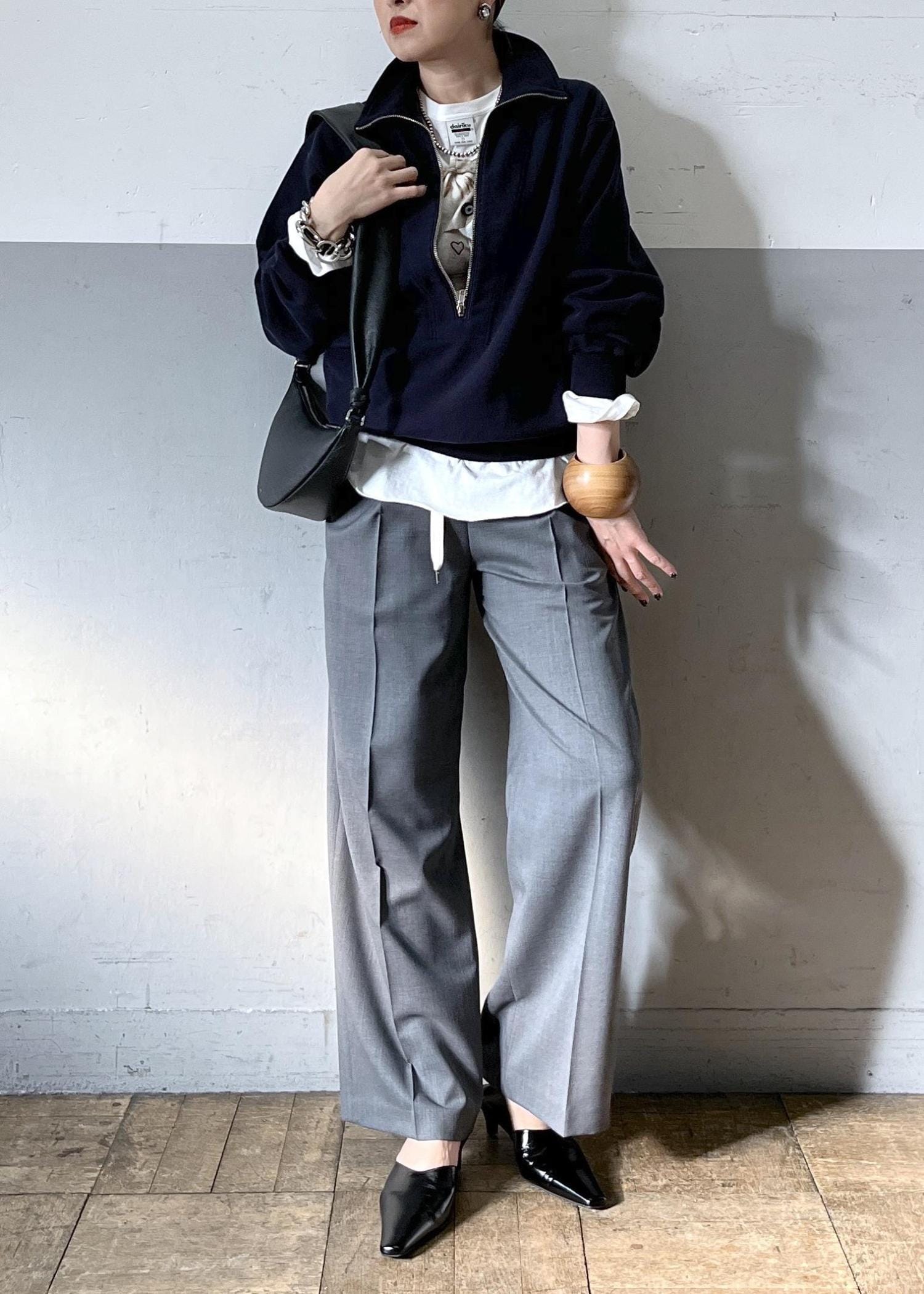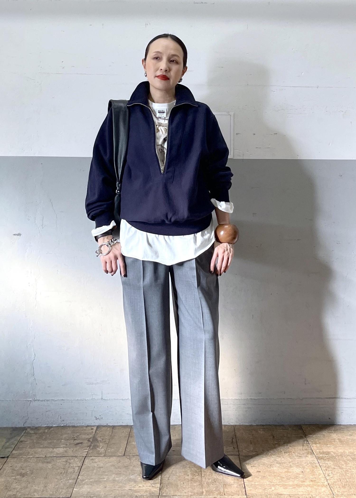 Championのハーフジップをスラックス合わせで大人カジュアルに。ラフすぎず、きちんと感もある万能スタイリング。