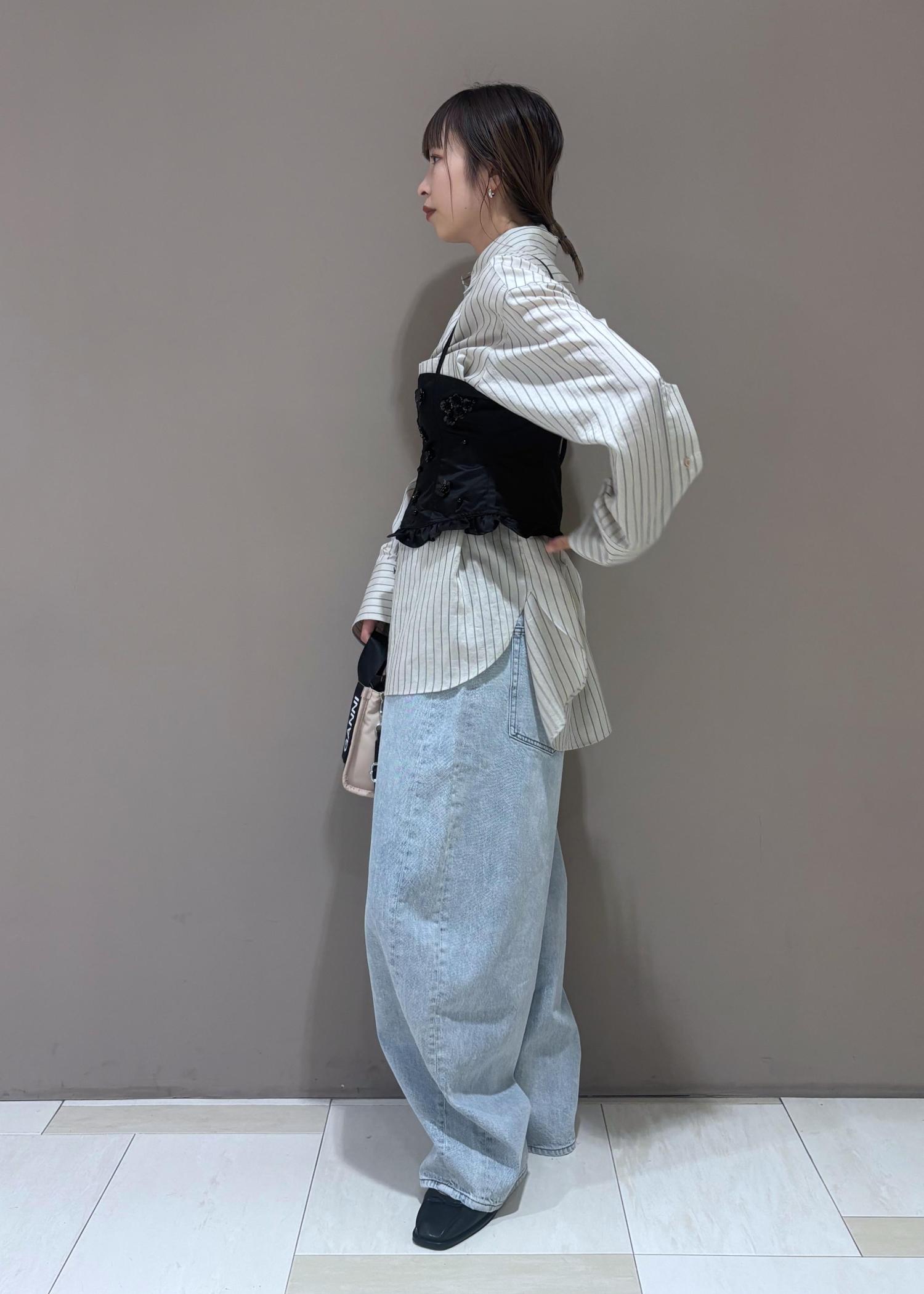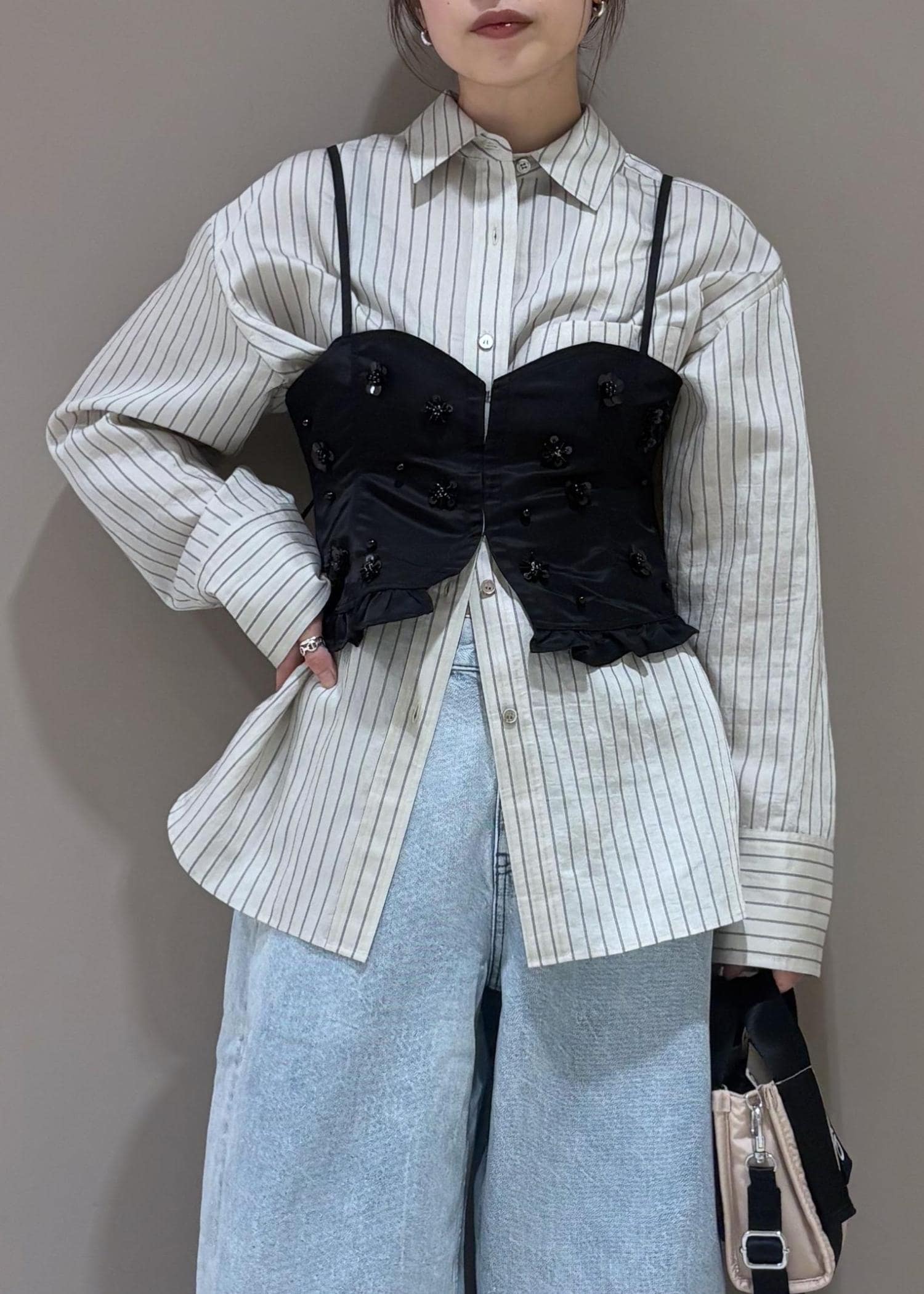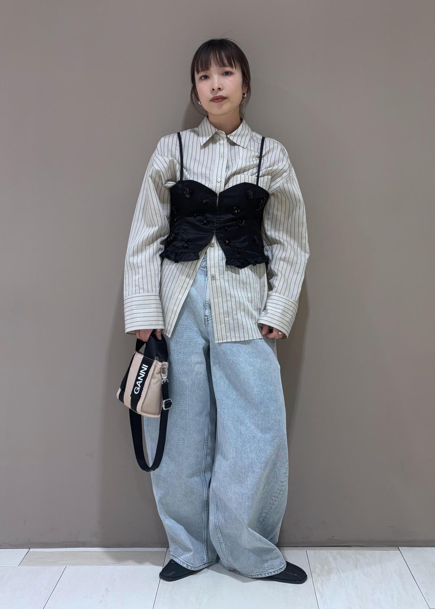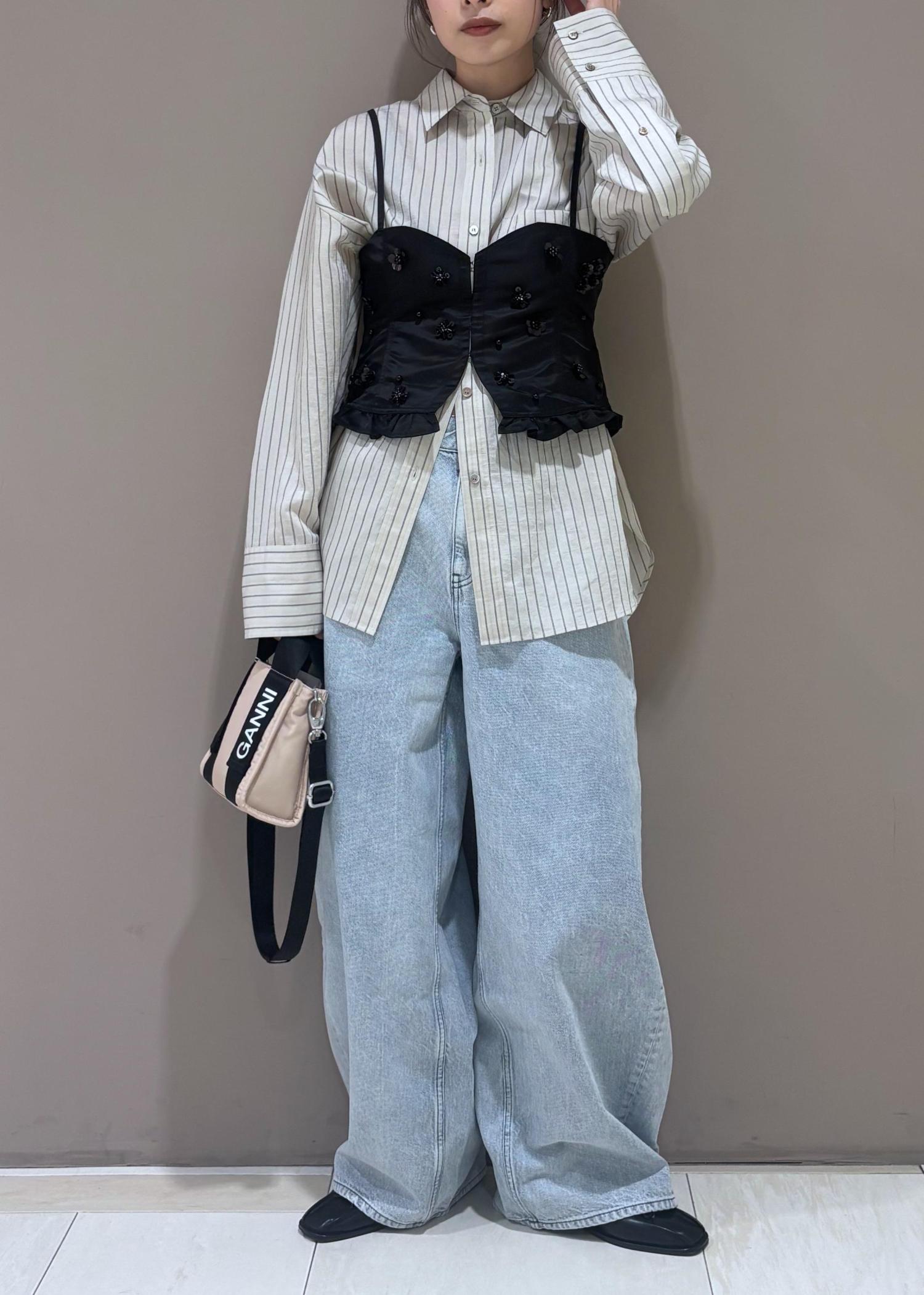 ストライプシャツとビスチェのレイヤードスタイリング。