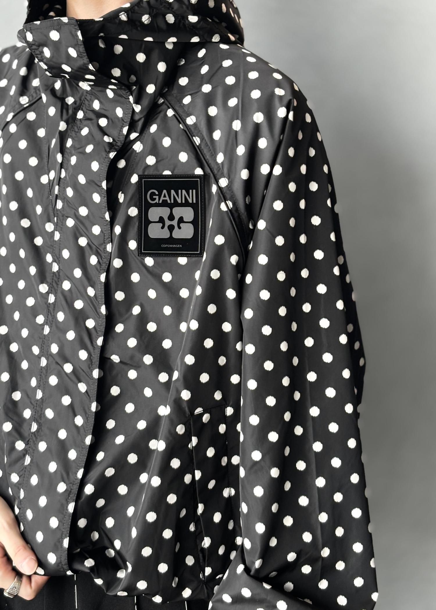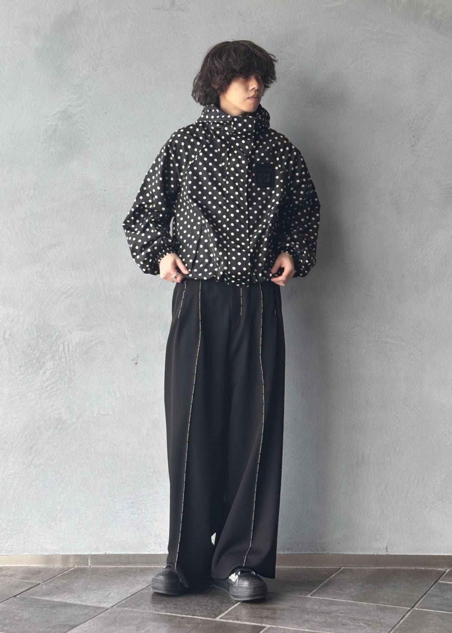 GANNIのトレンド感のあるドット柄のナイロンブルゾンが主役のコーディネート。