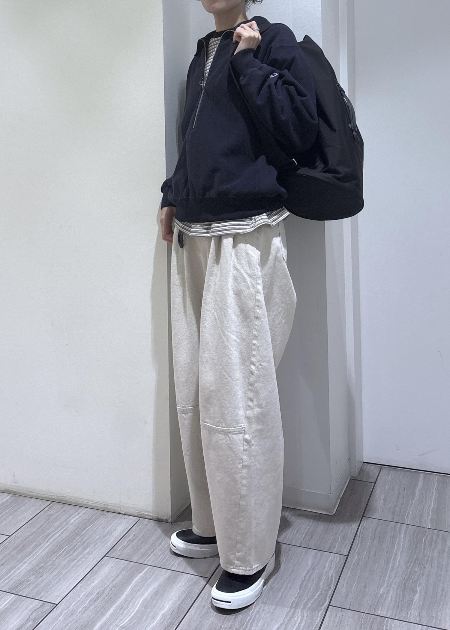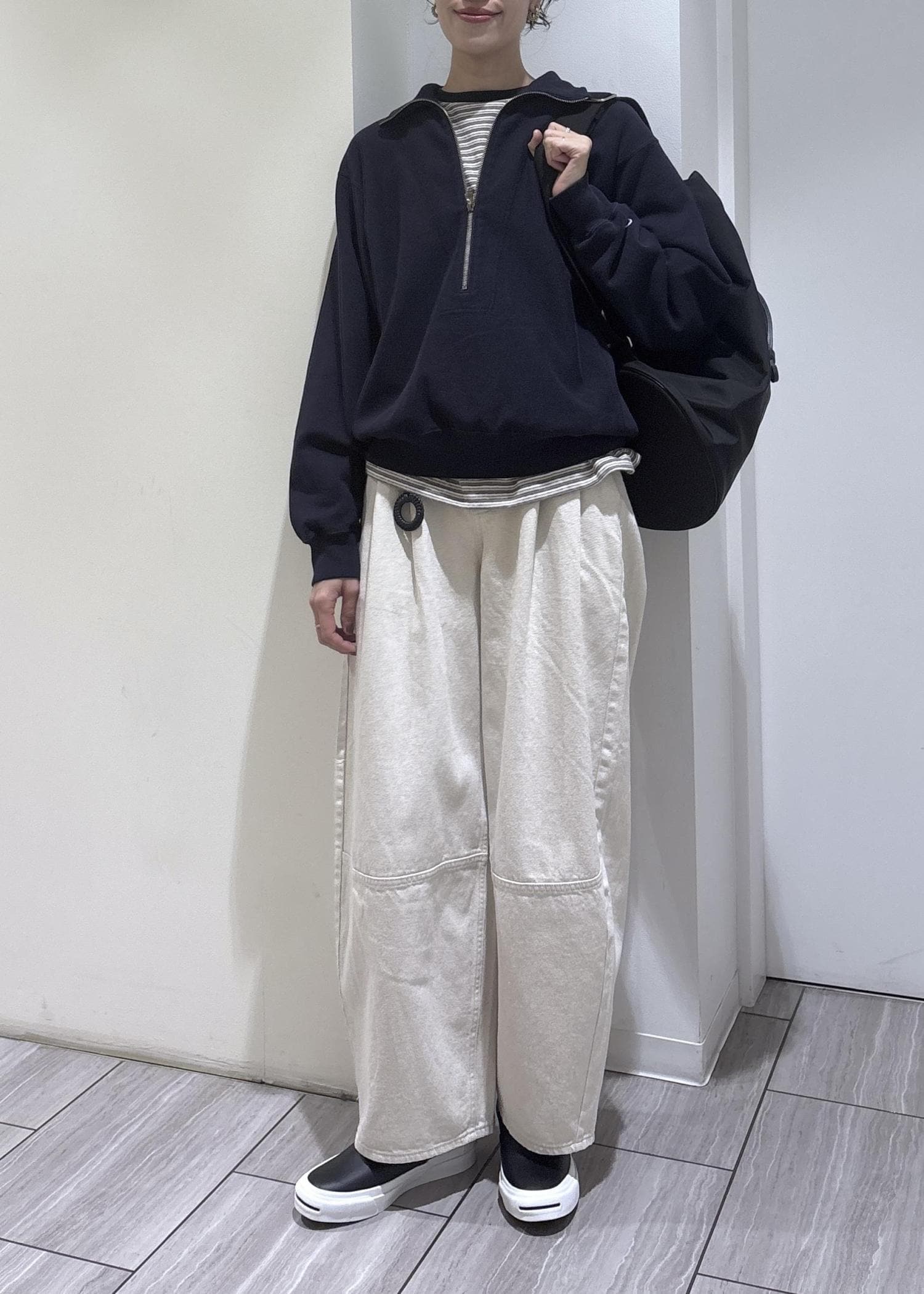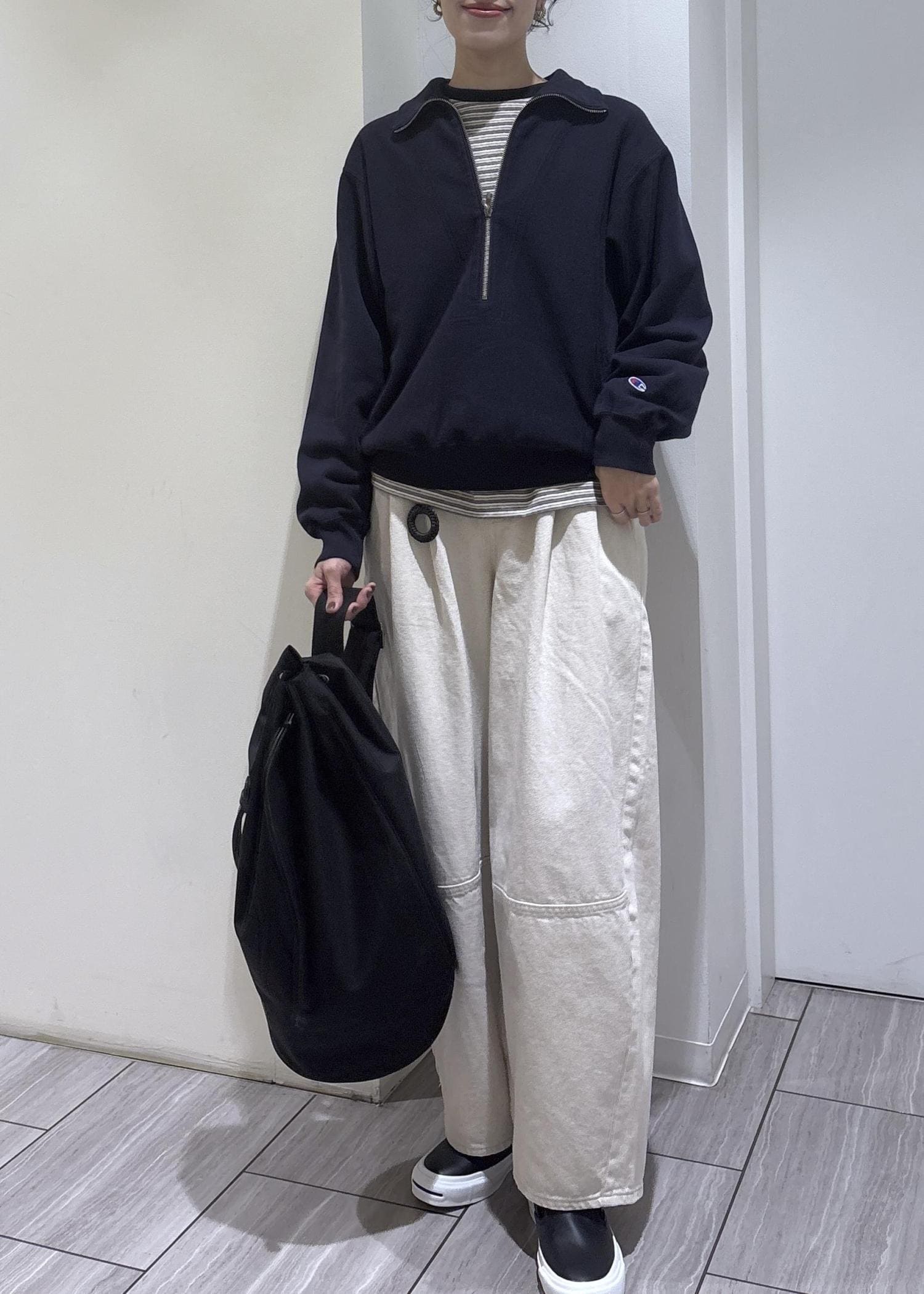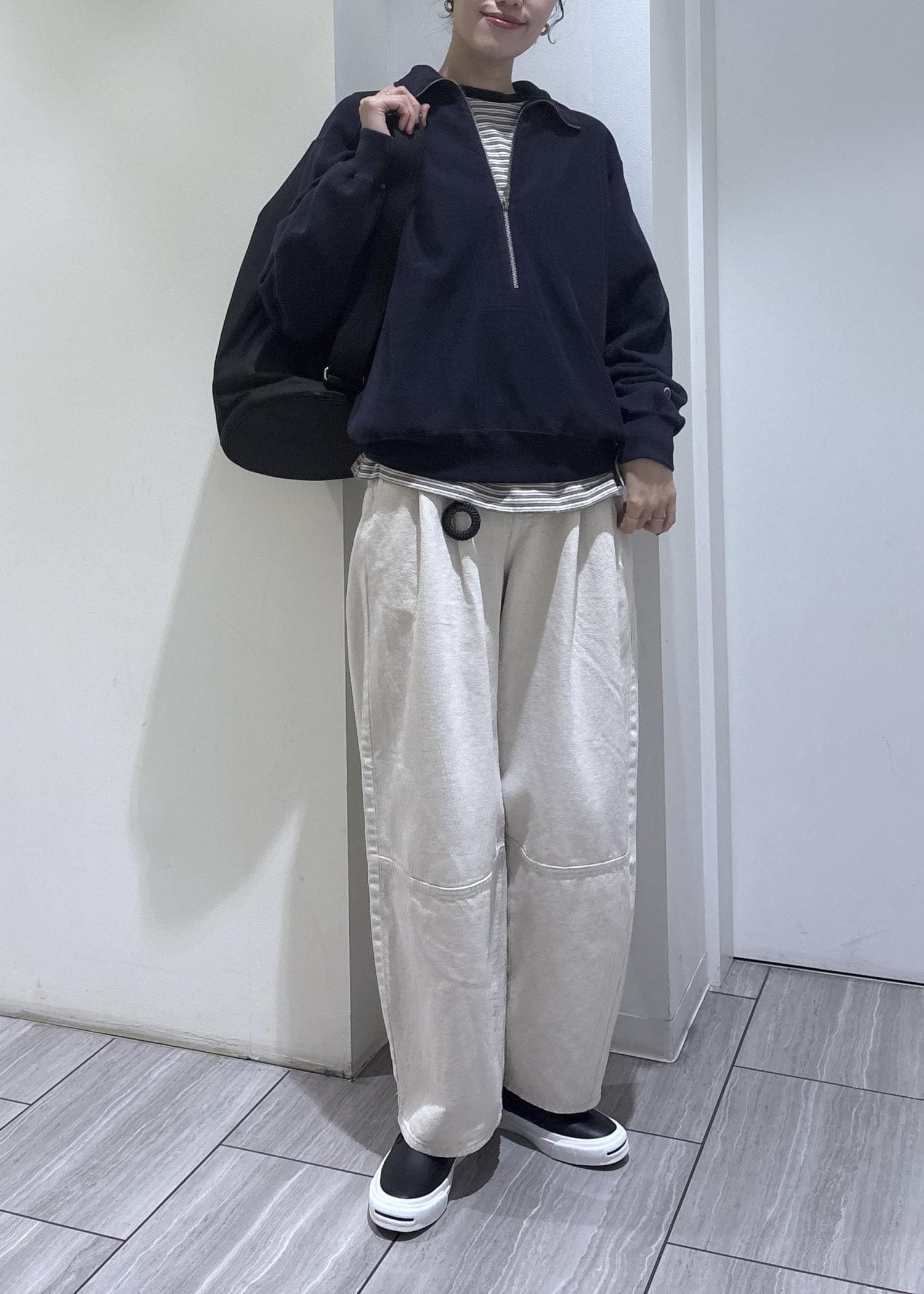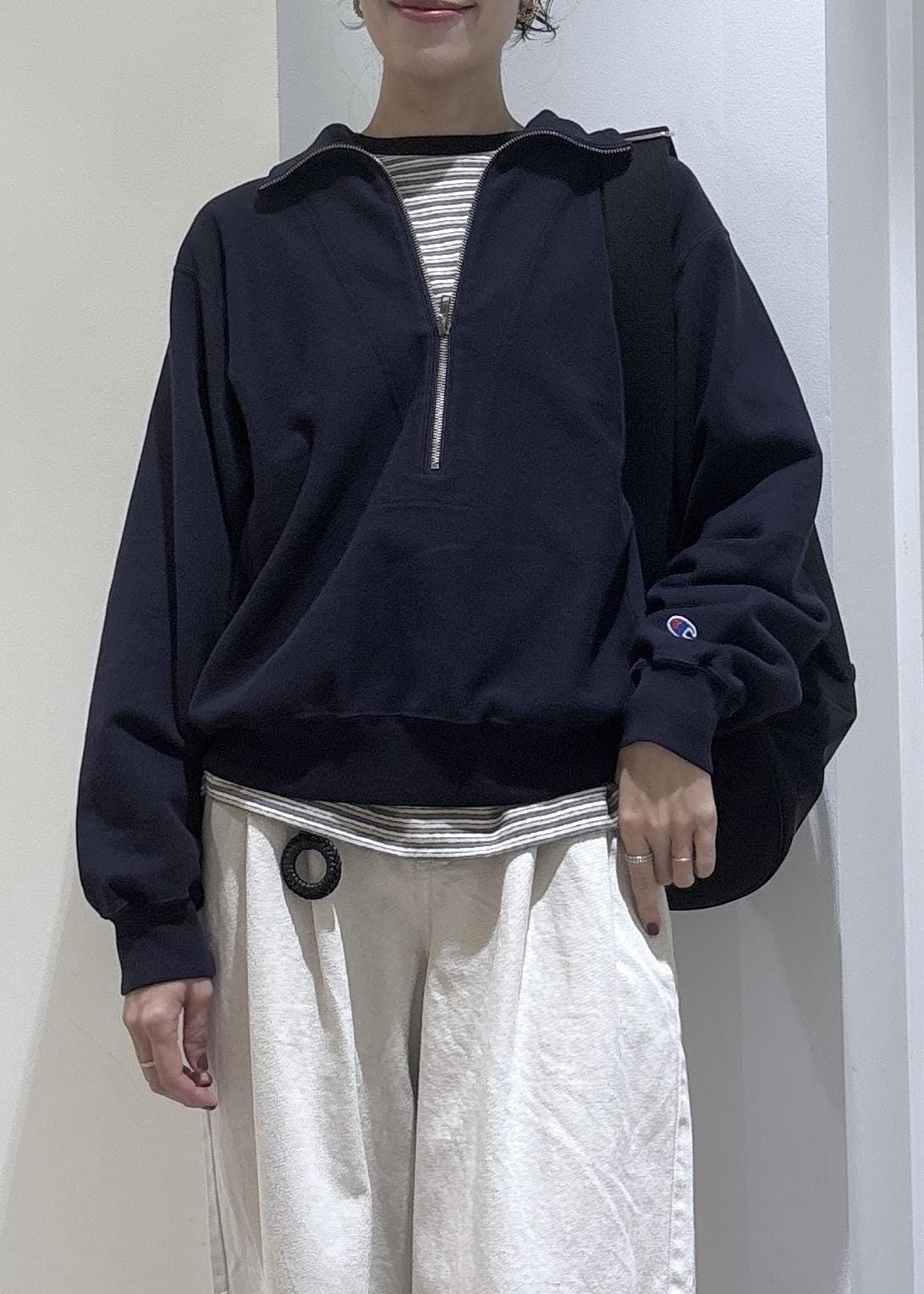 深めのハーフジップで、インナー次第で雰囲気を変えて楽しめます◎