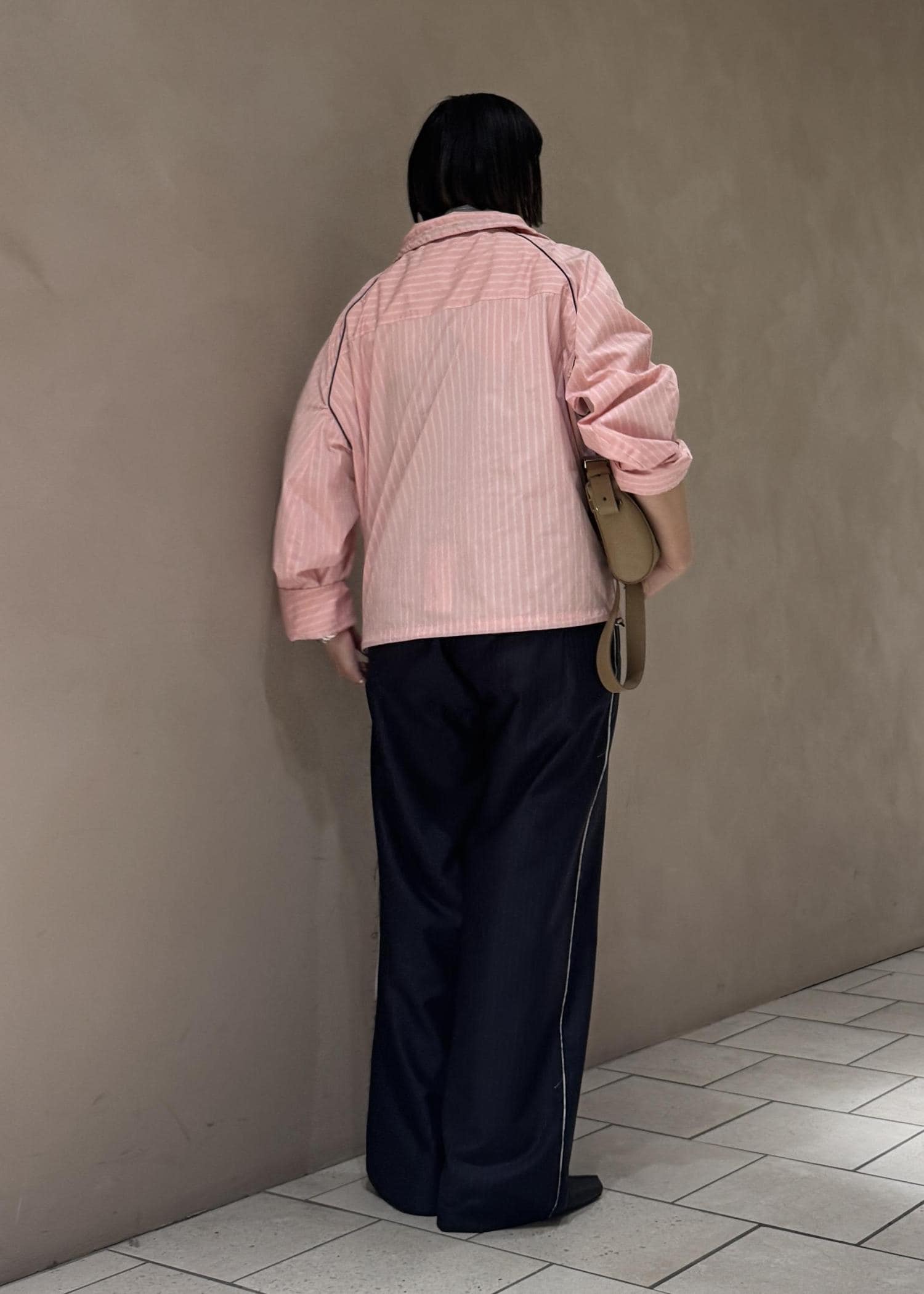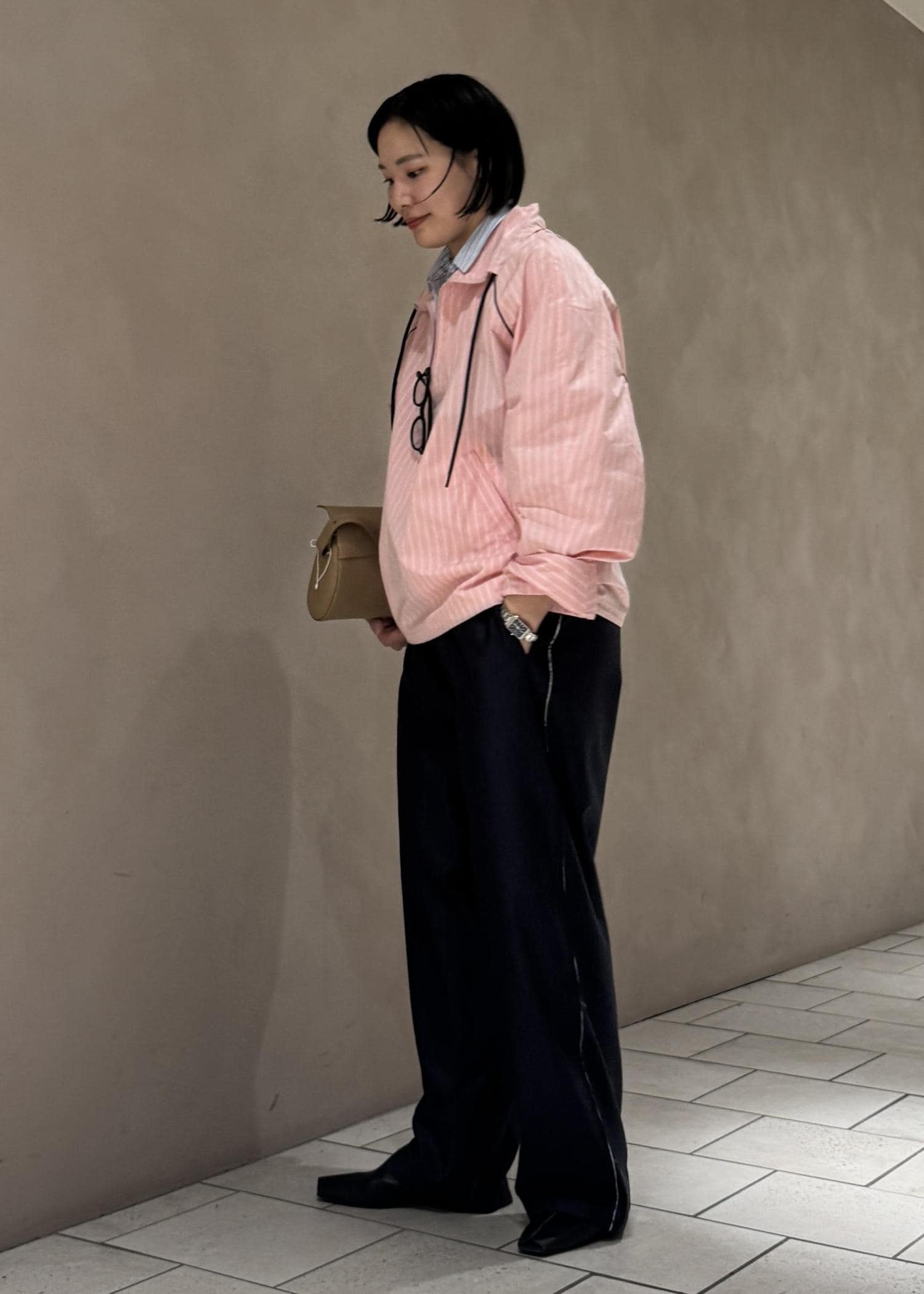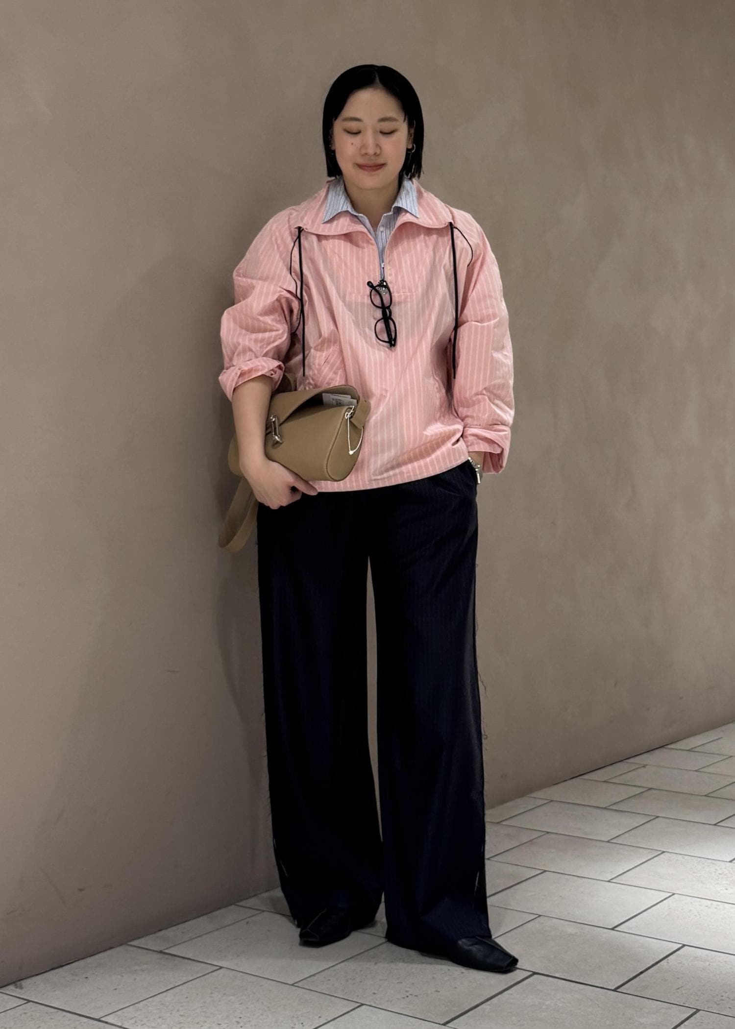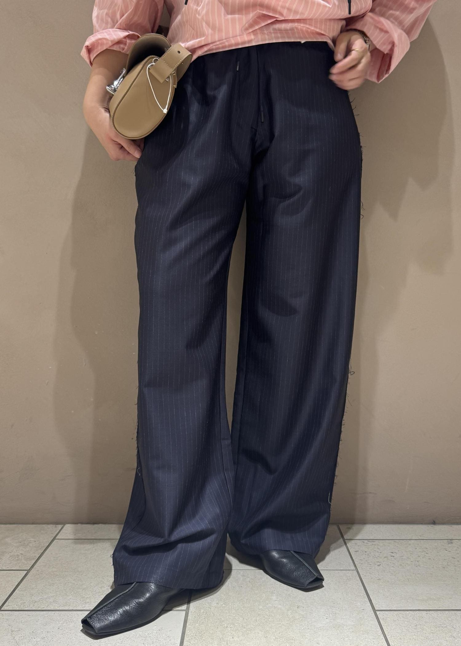 ボトムスはパジャマ風のテーラードトラウザーでゆったりとしたサイズ感で楽ちんな履き心地。
