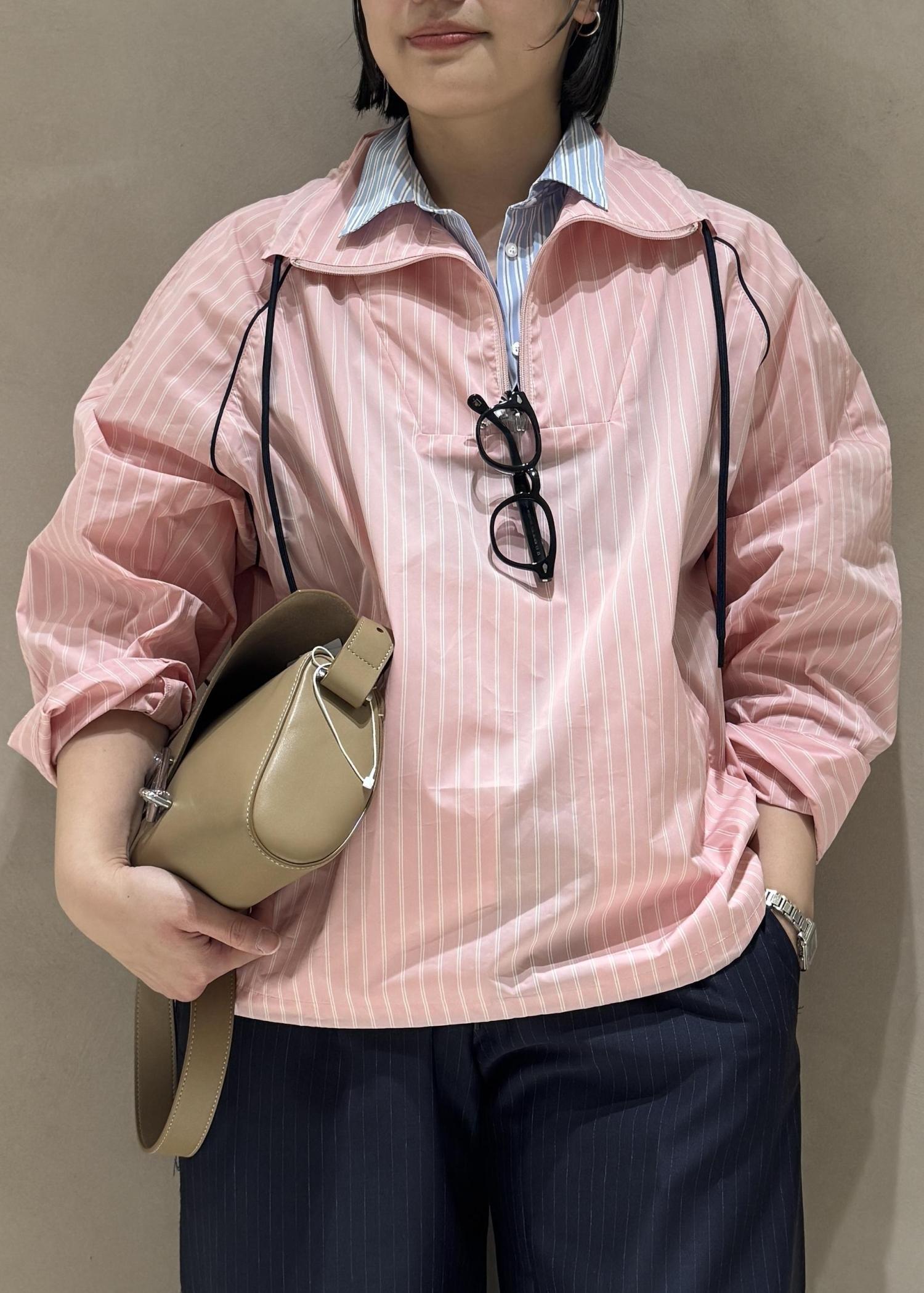 トップスはシャツとレイヤードしているかのようなデザインのハイブリットポロ。