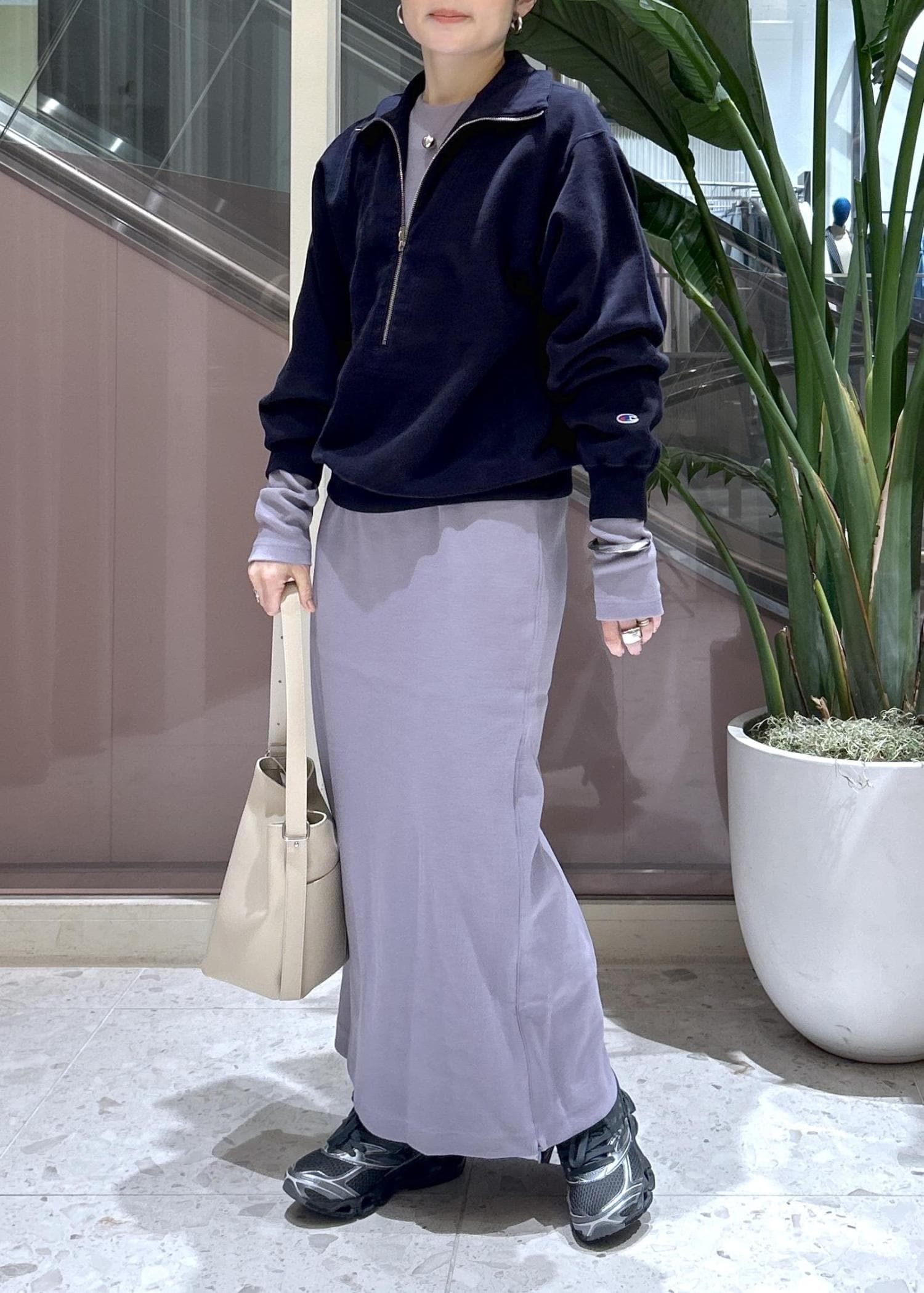 店頭でも人気のチャンピオンの別注スウェットは、深めのハーフジップなのでレイヤードが楽しめるデザイン。