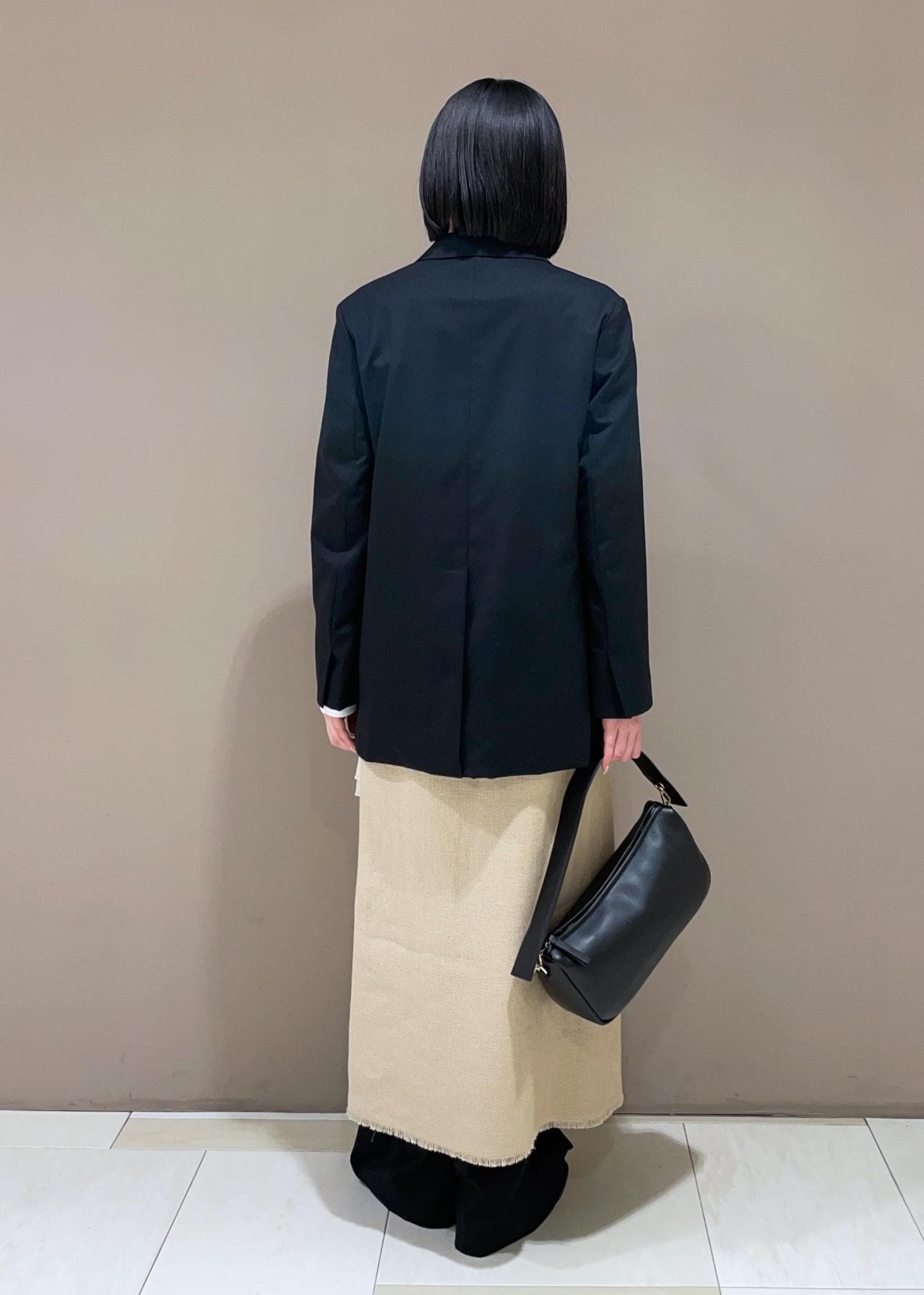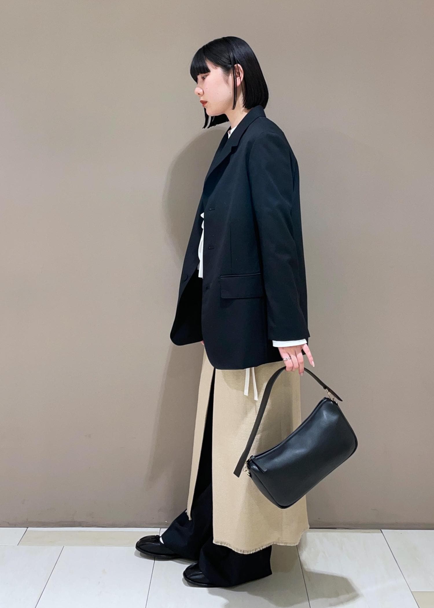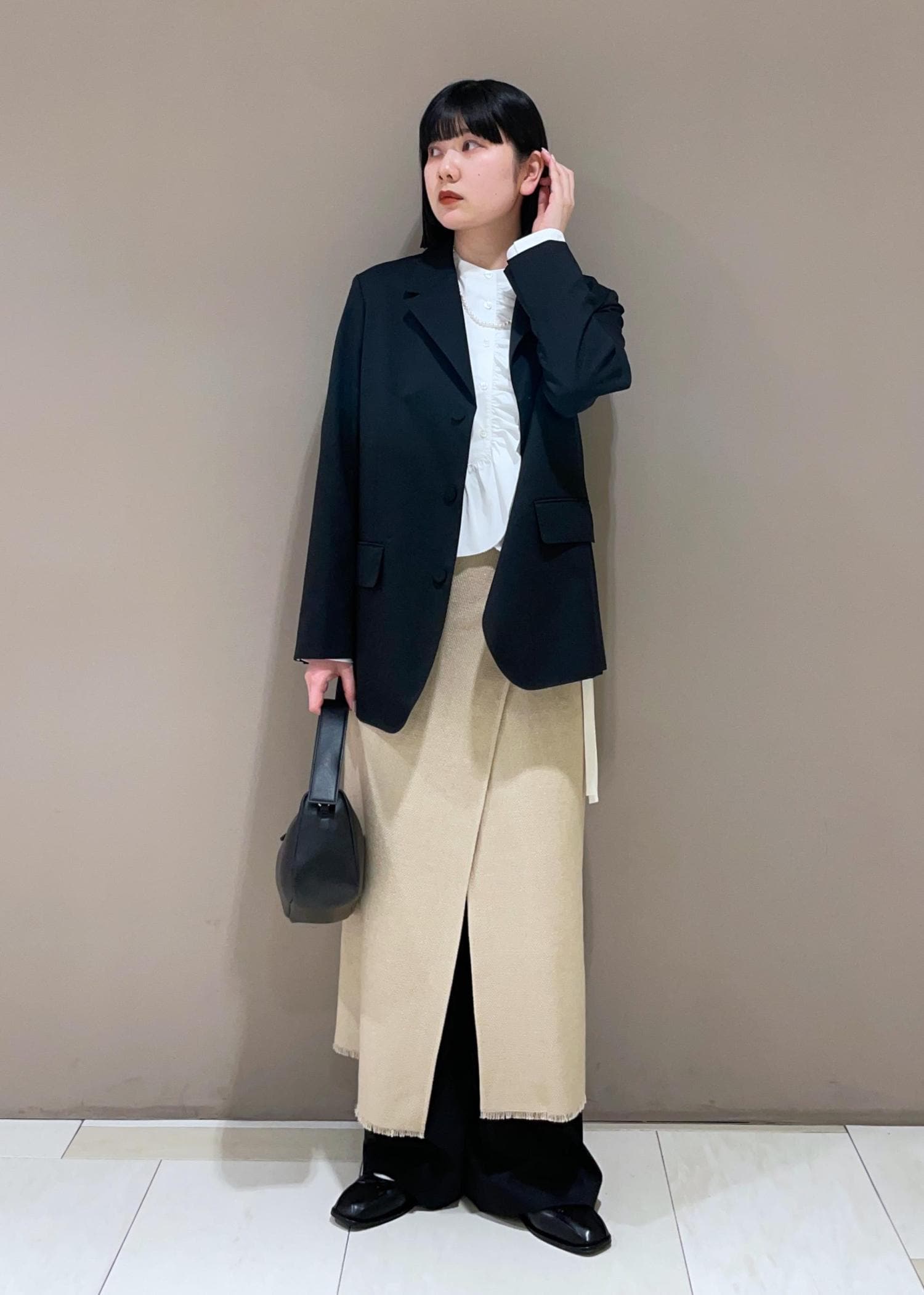 モノトーンのセットアップにEMOELLEのラップスカートを合わせて、ひとくせあるレイヤードスタイルに◎