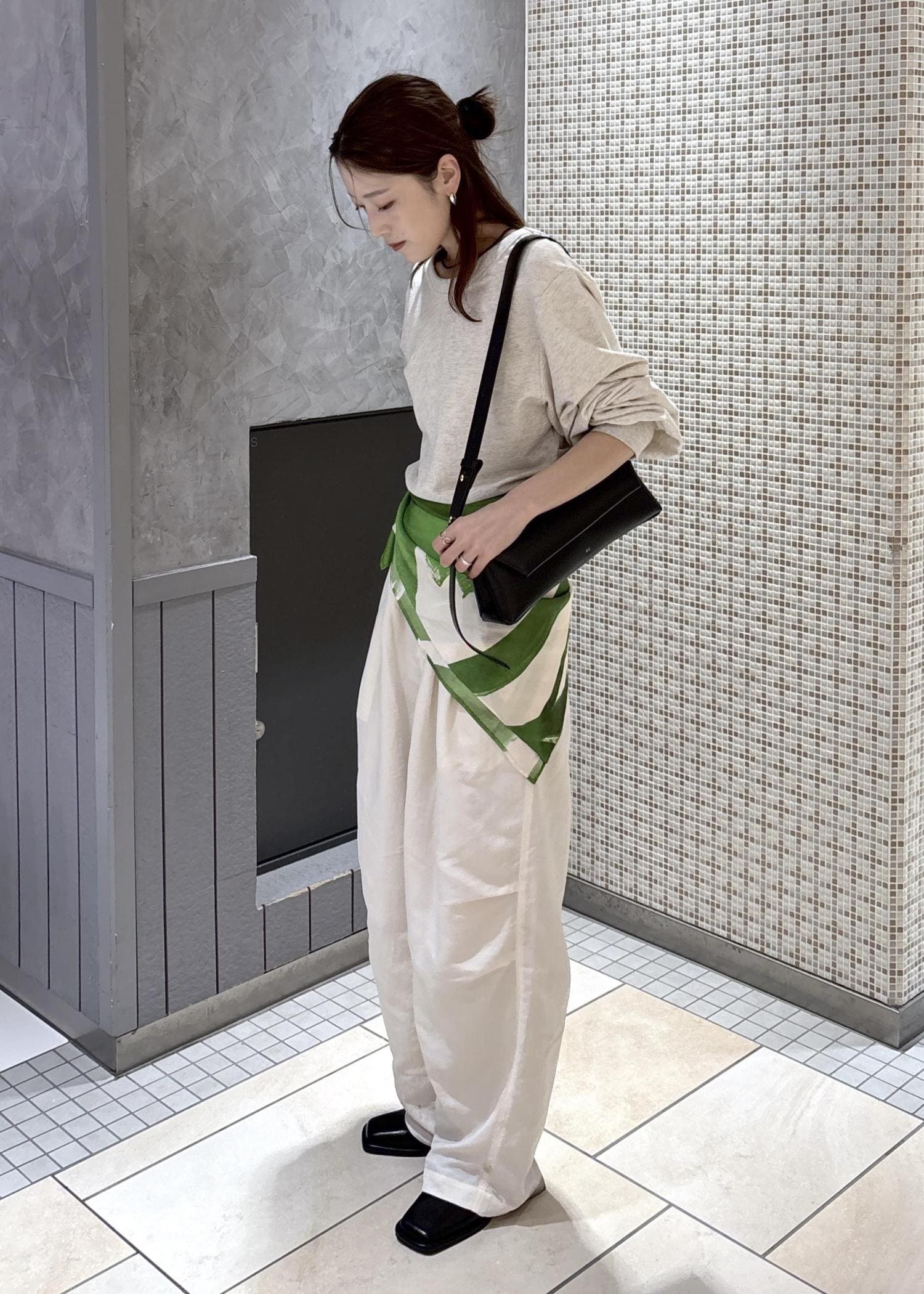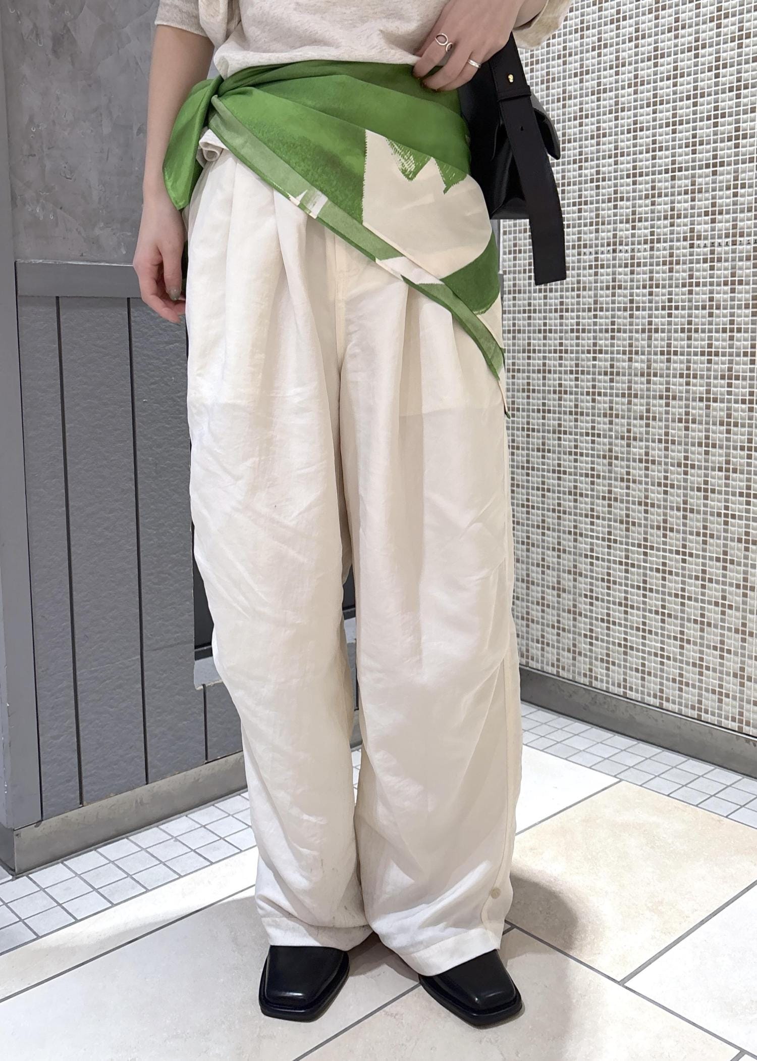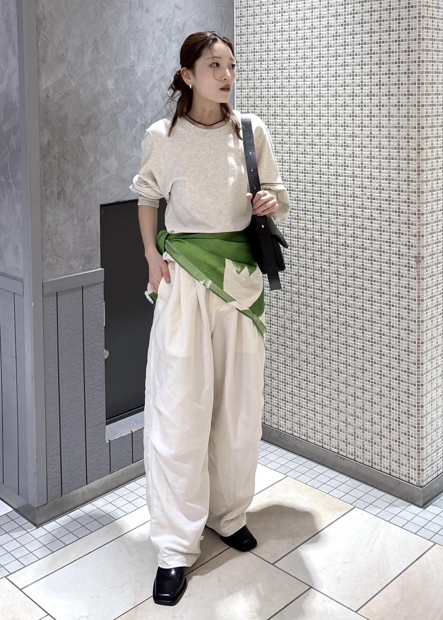 スカーフを腰巻きで差し色にしました♡