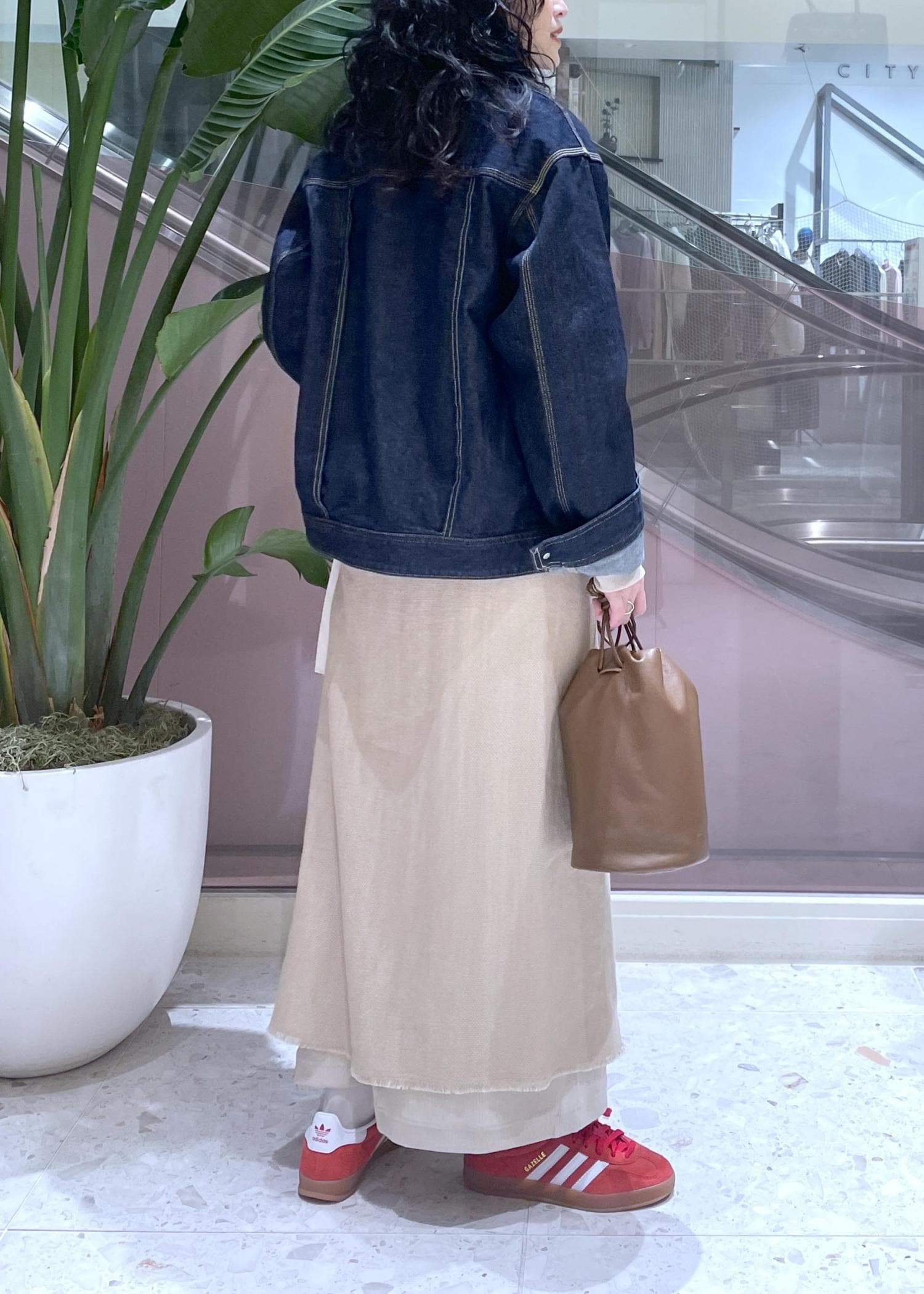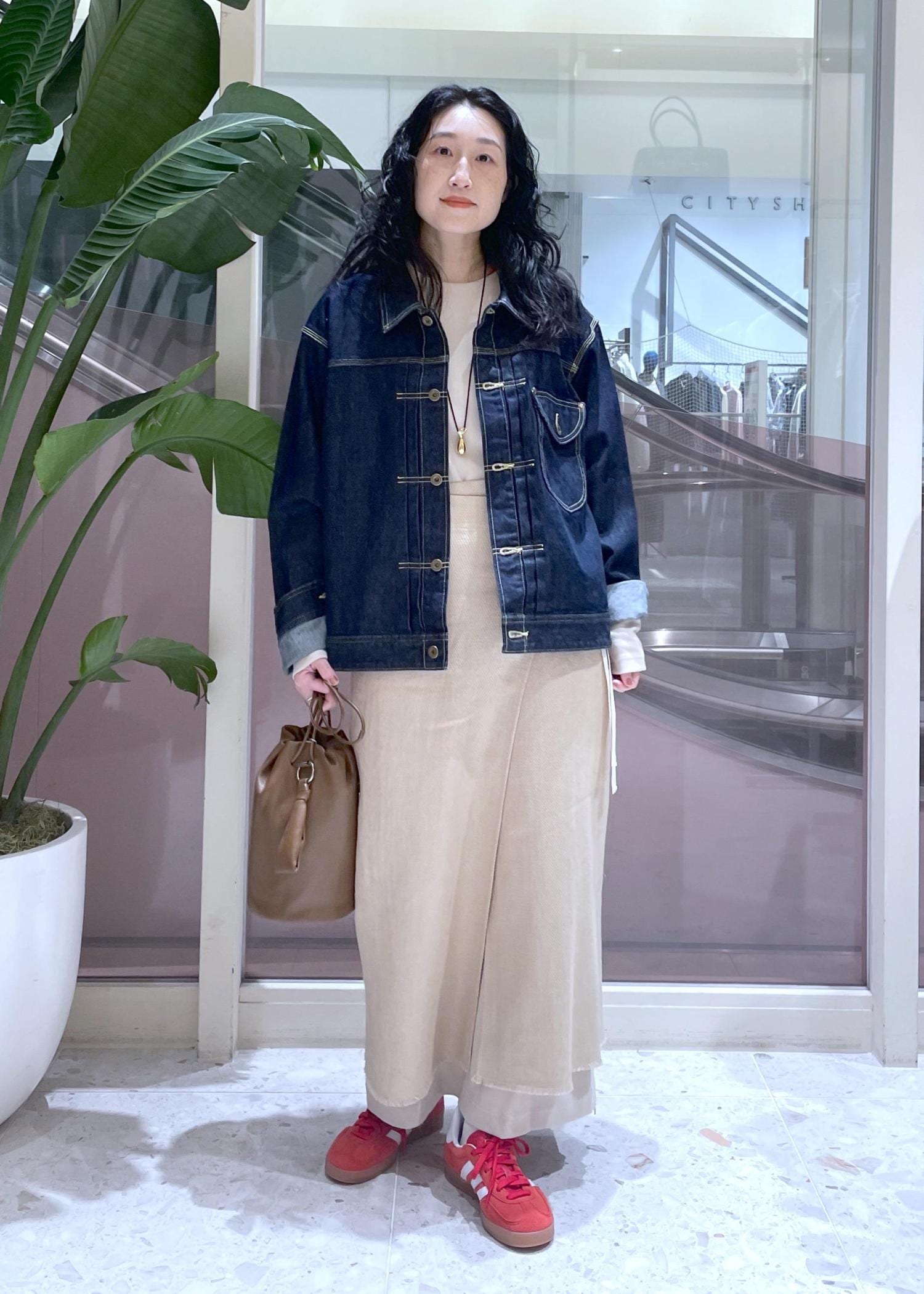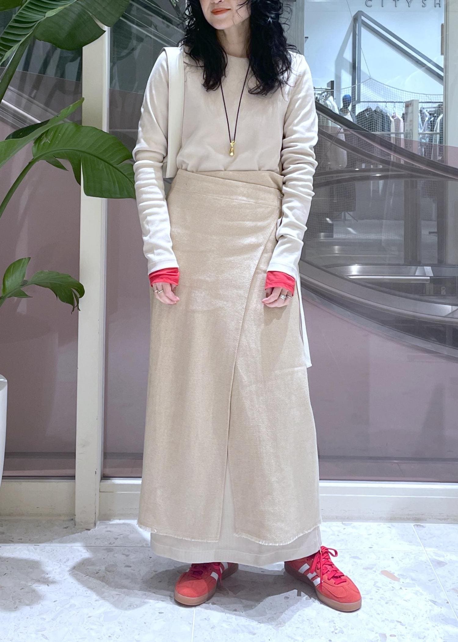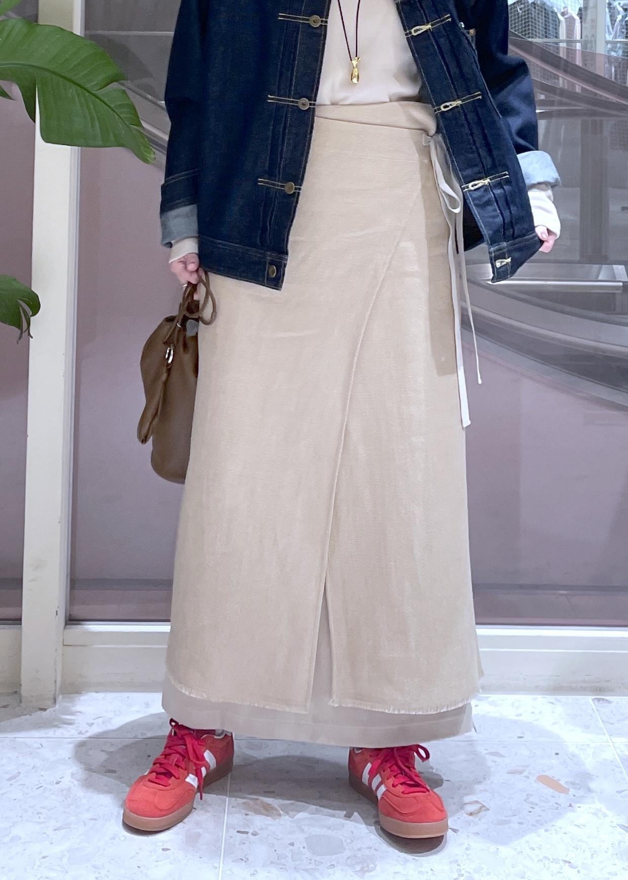 EMOELLE【EMOELLE】ラップスカートベージュ系 / 36¥37,400レビュー36サイズ着用。デニムの上からでも難なく巻けます。内側のボタンで腰回りは調節が可能。