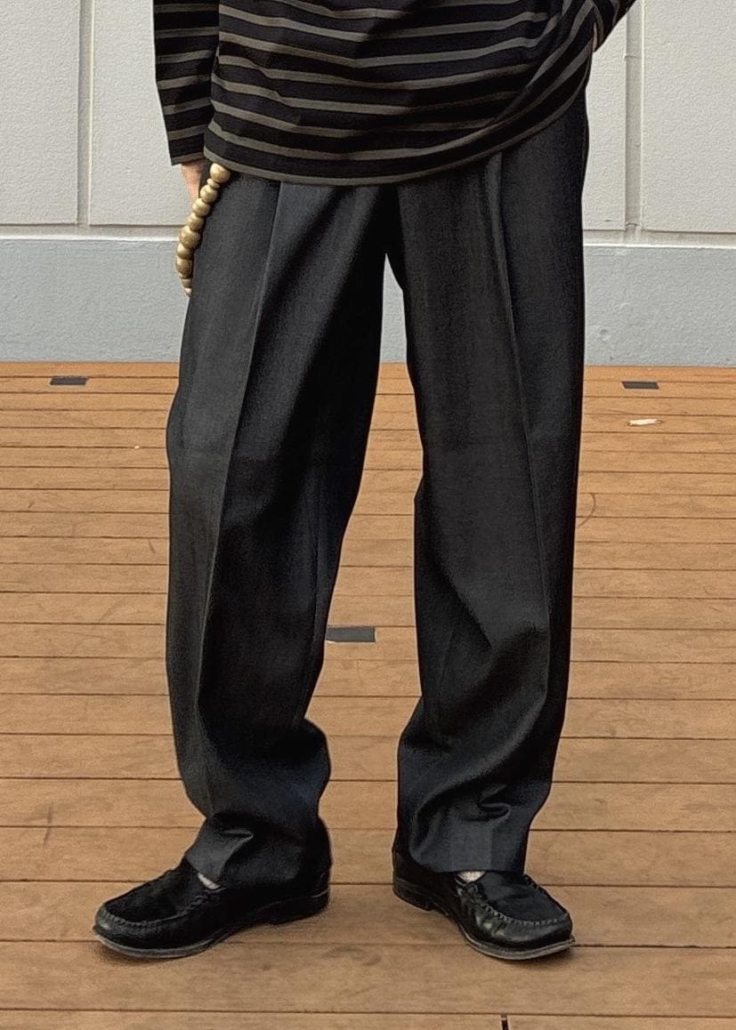 ウエスト部分はゴム仕様になっており、ウエストサイズは幅広い方に着用いただけます。ウールデニムなので、デニム要素としてカジュアルなスタイリングにはもちろん、素材の美しさからスラックス要素として綺麗めなスタイリングにも合わせることができる、ハイブリッドなパンツとなっております。