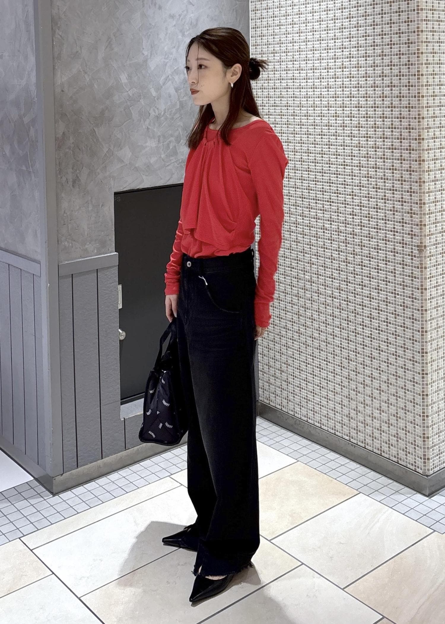 首周りはゆるめのボートネックで、顔周りスッキリです。