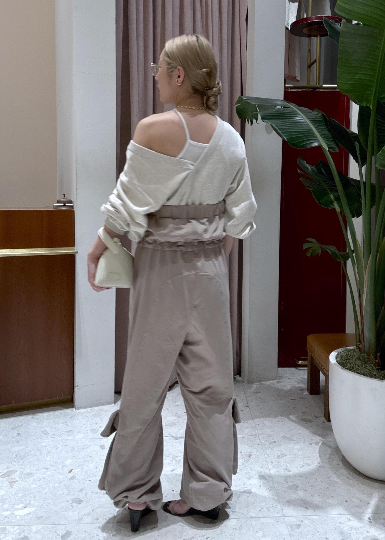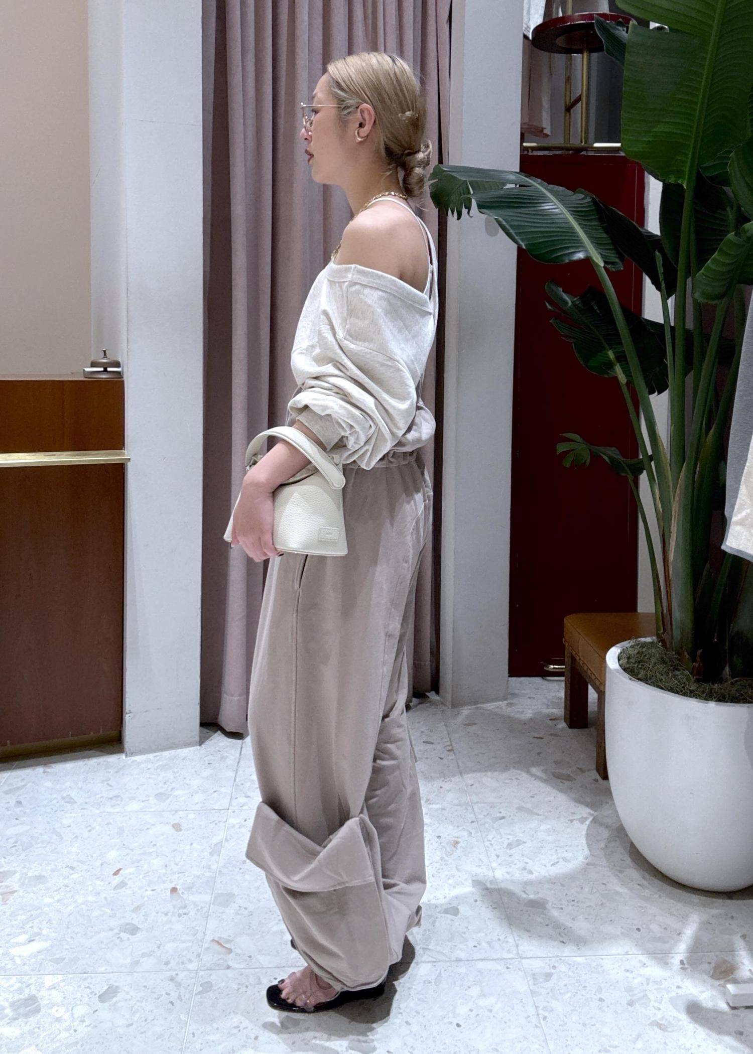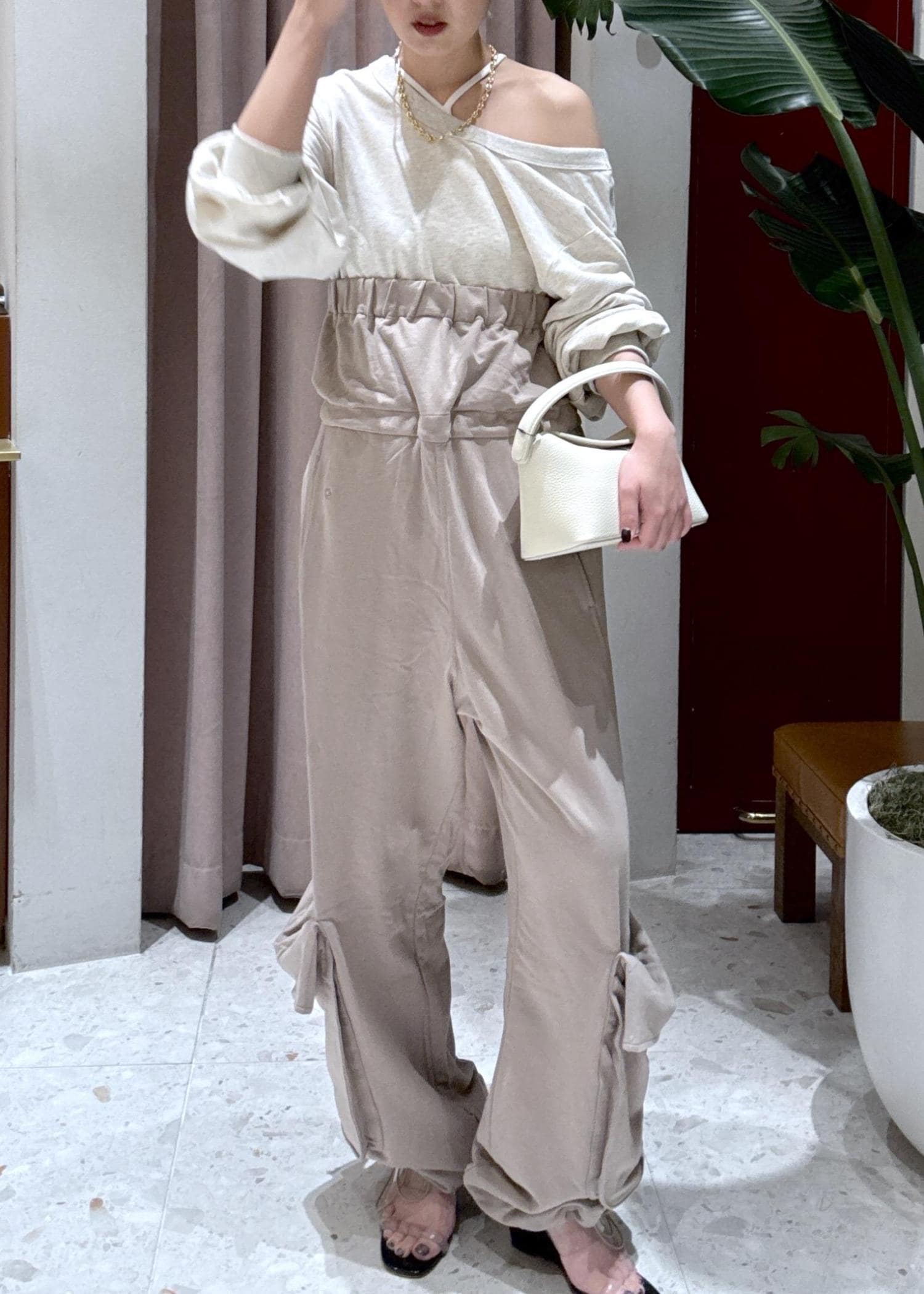 オフショルダーのカットソーに、デザインパンツを合わせた女性らしいリラックススタイル。