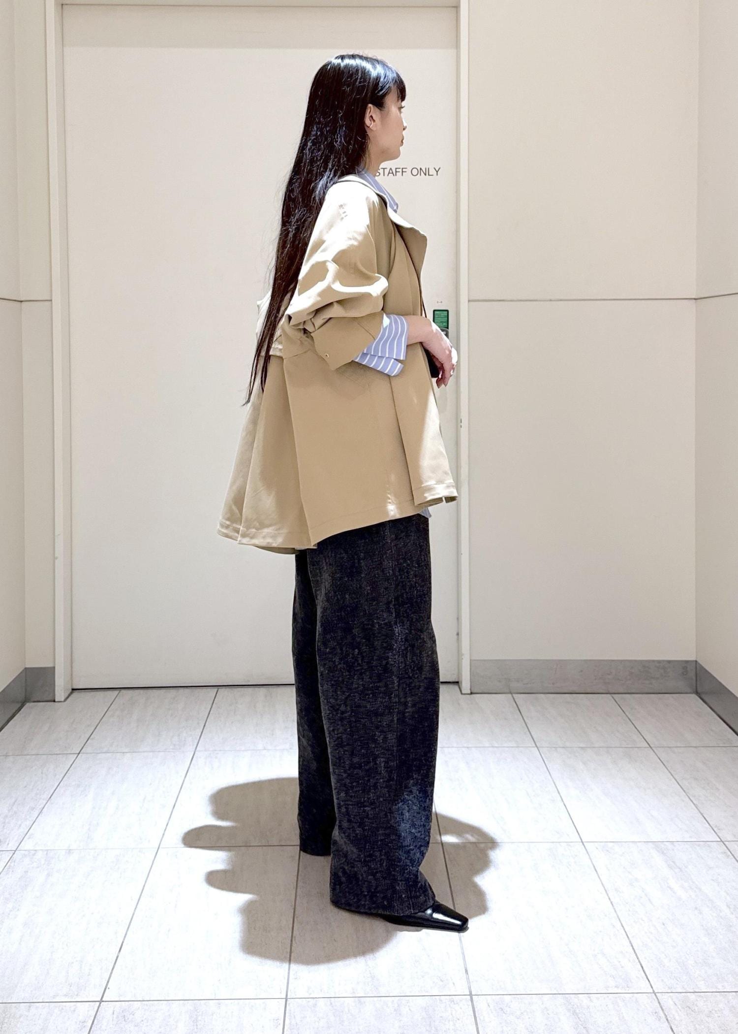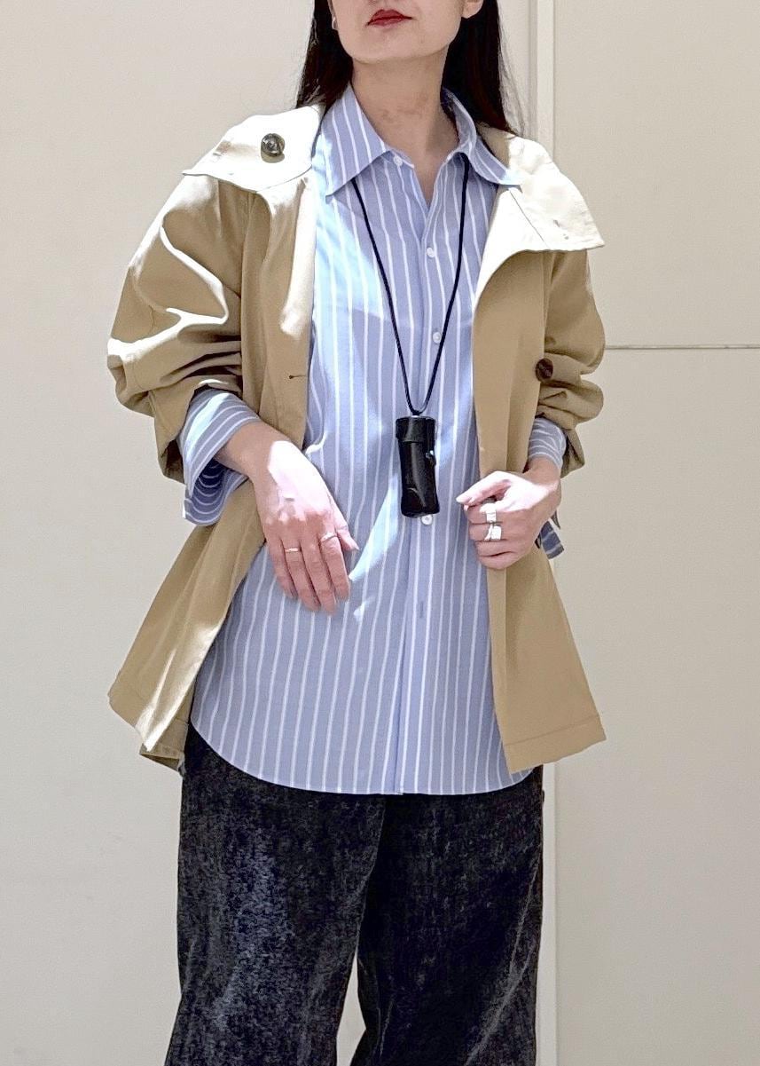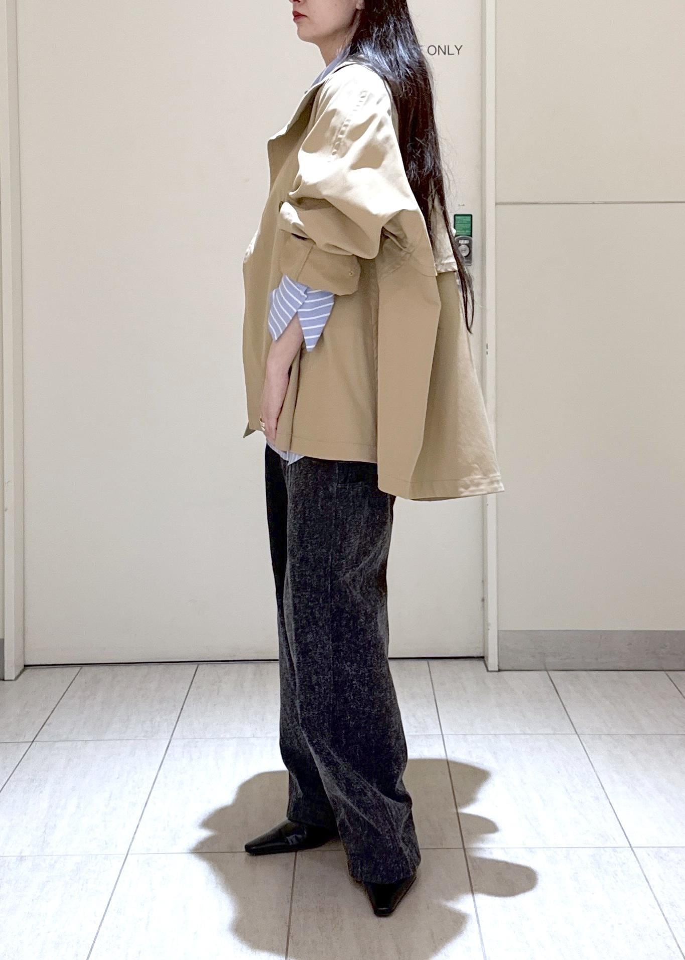 少しAラインなシルエットが特徴で身幅腕周りもゆったりしているので中物も着やすく気温変化にも対応しやすくて使いやすいです^ ^