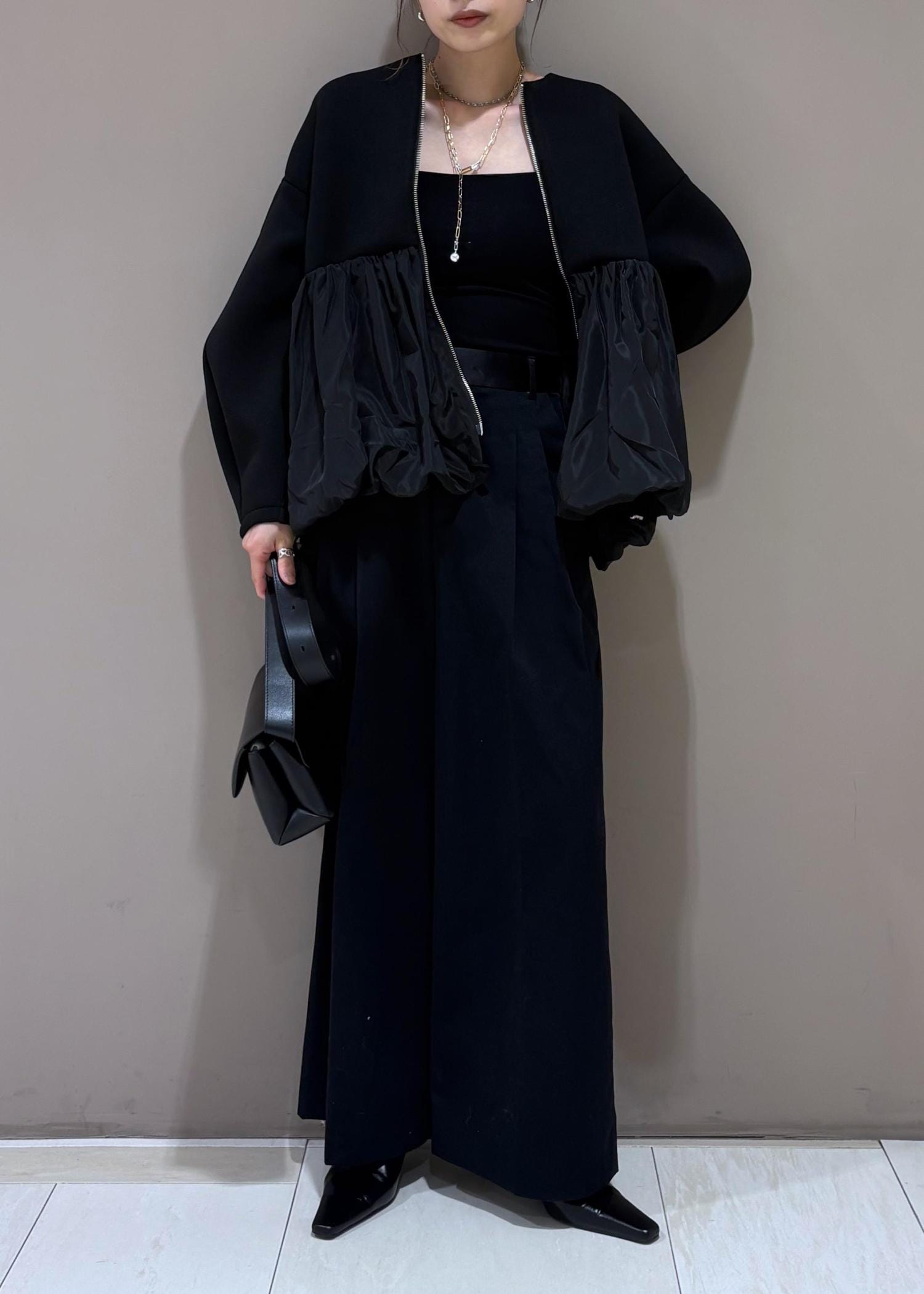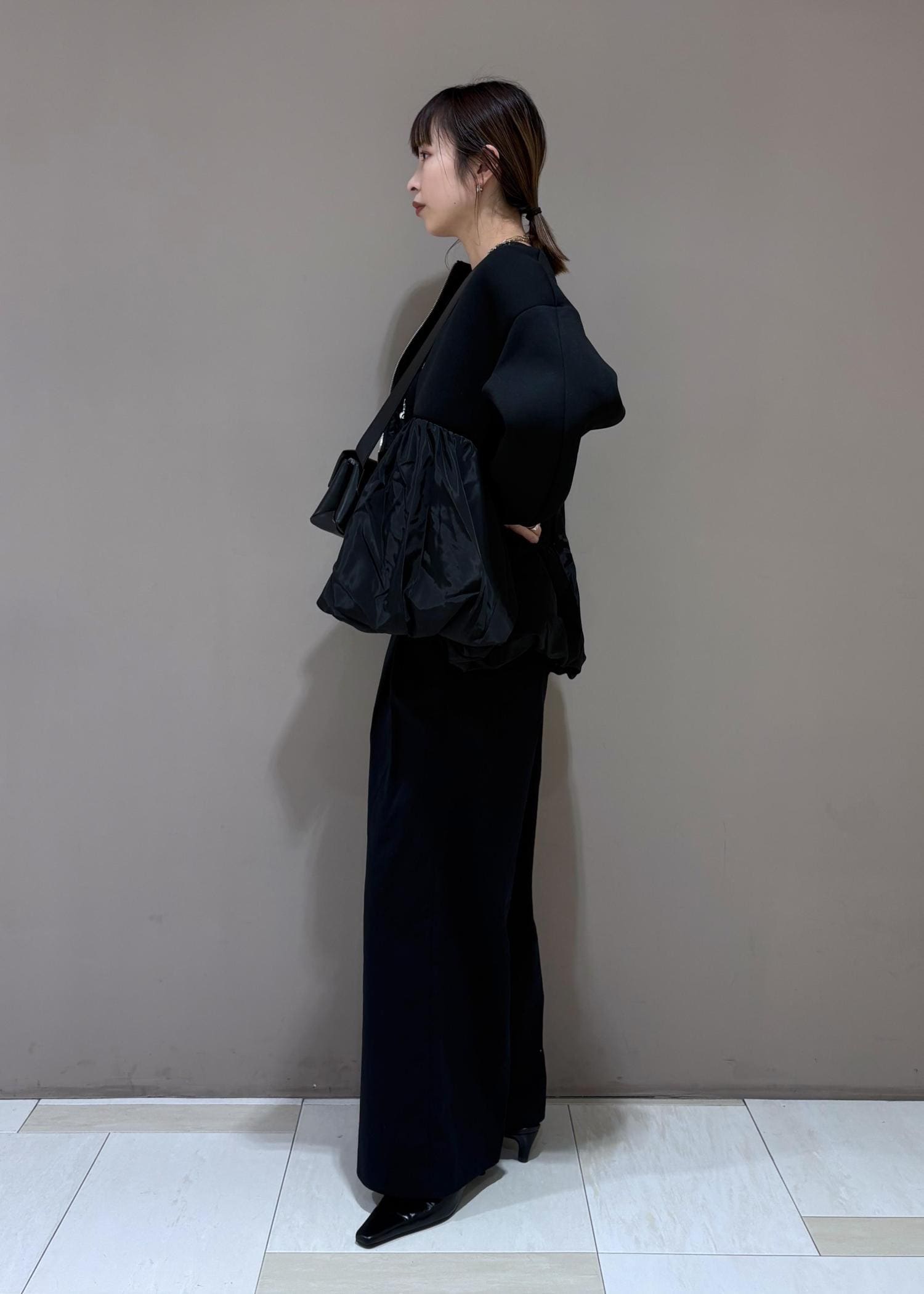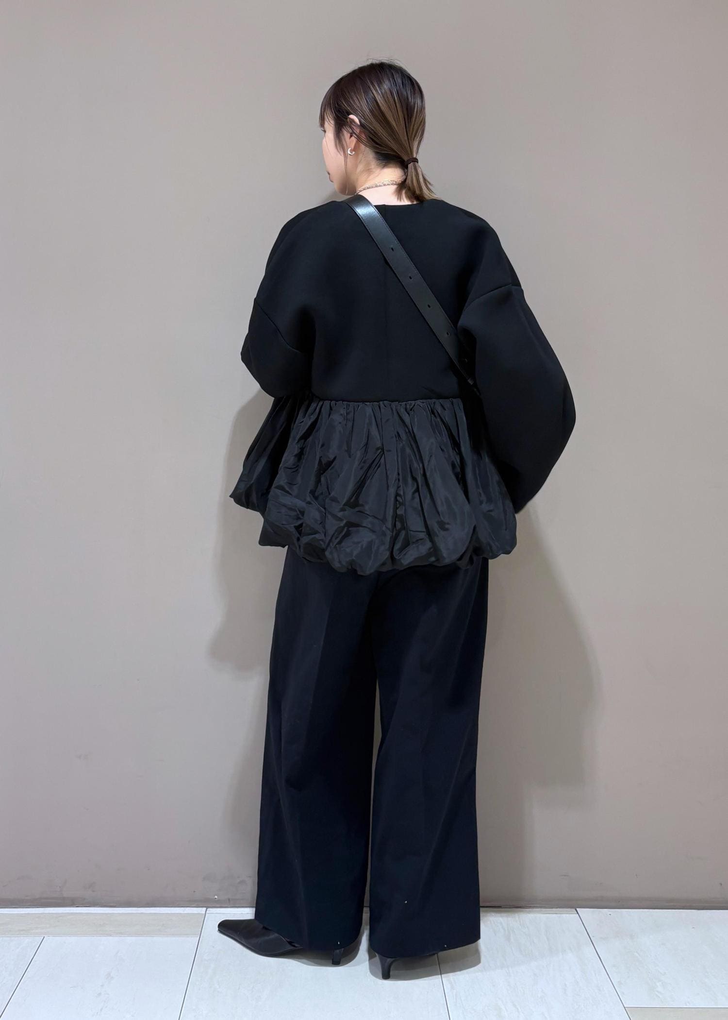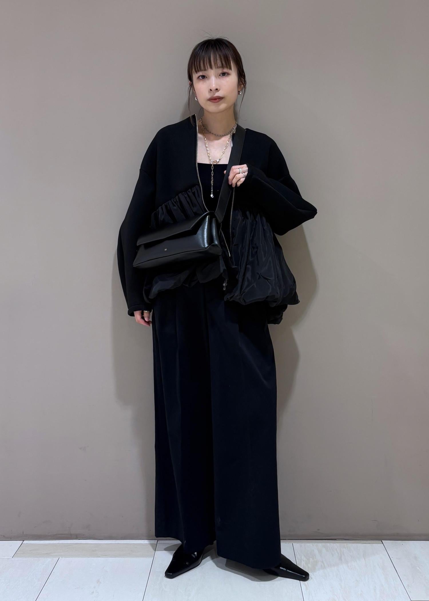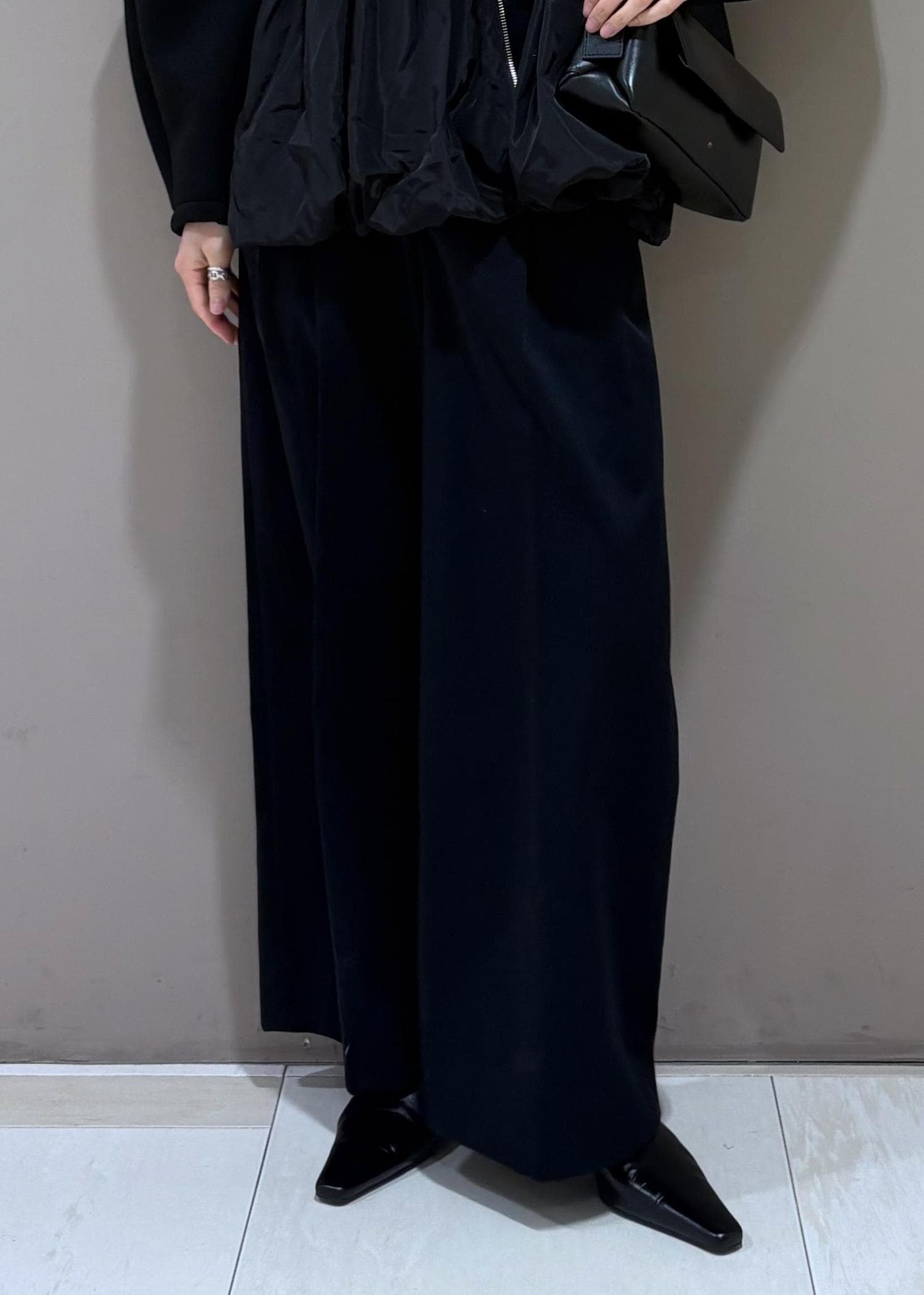 腰回りはぴったりめなので、ワイドパンツのシルエットが綺麗にでます。