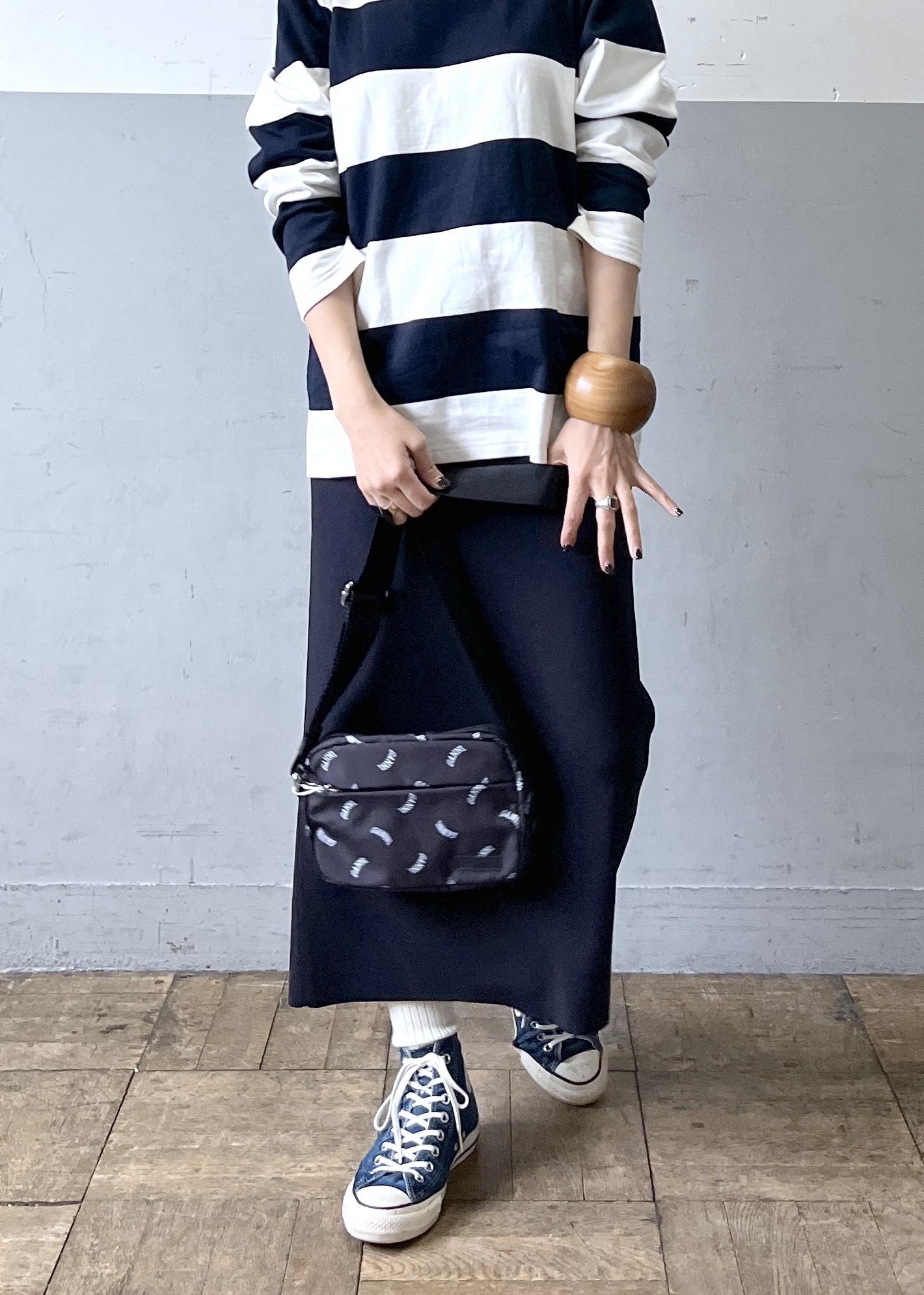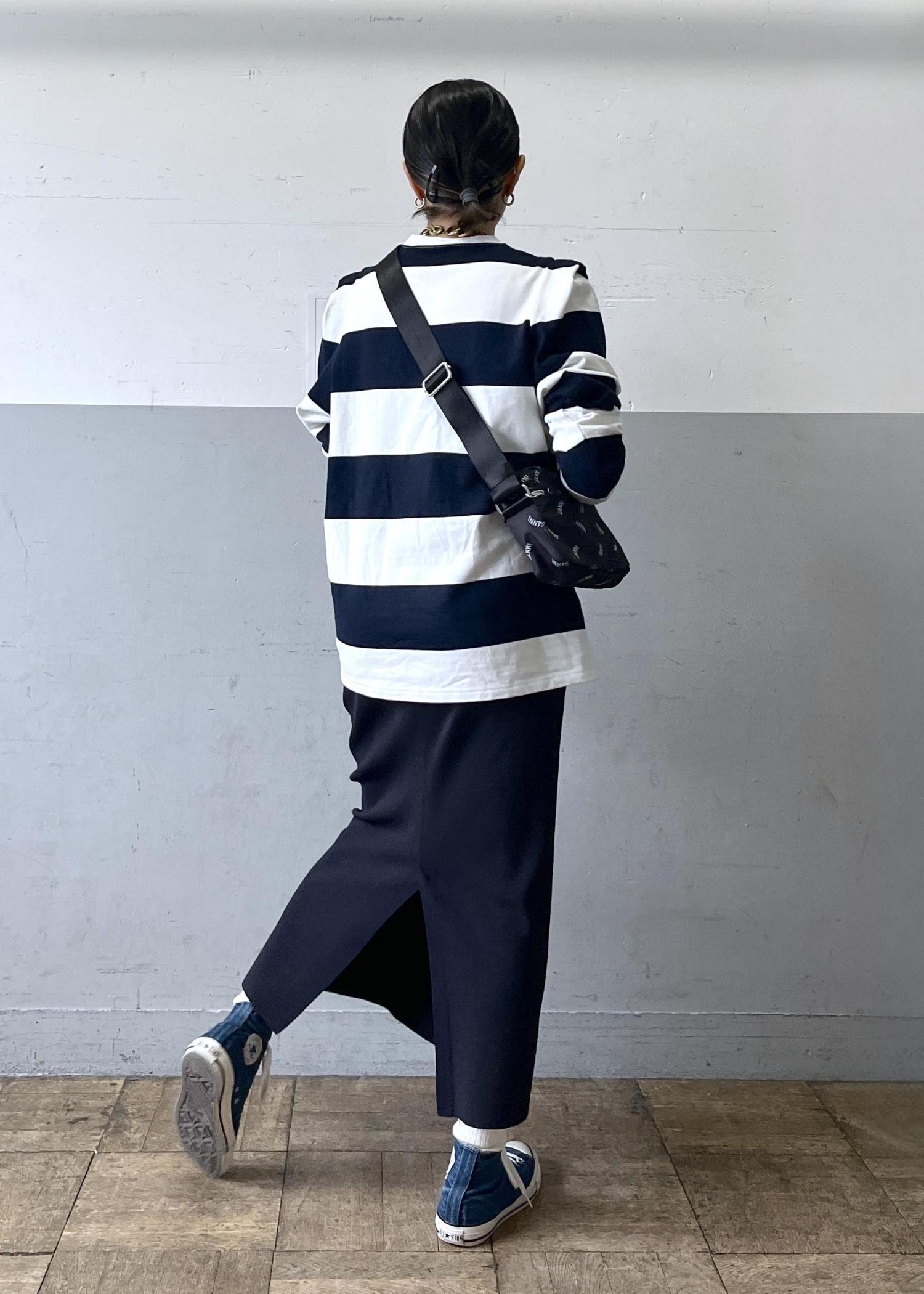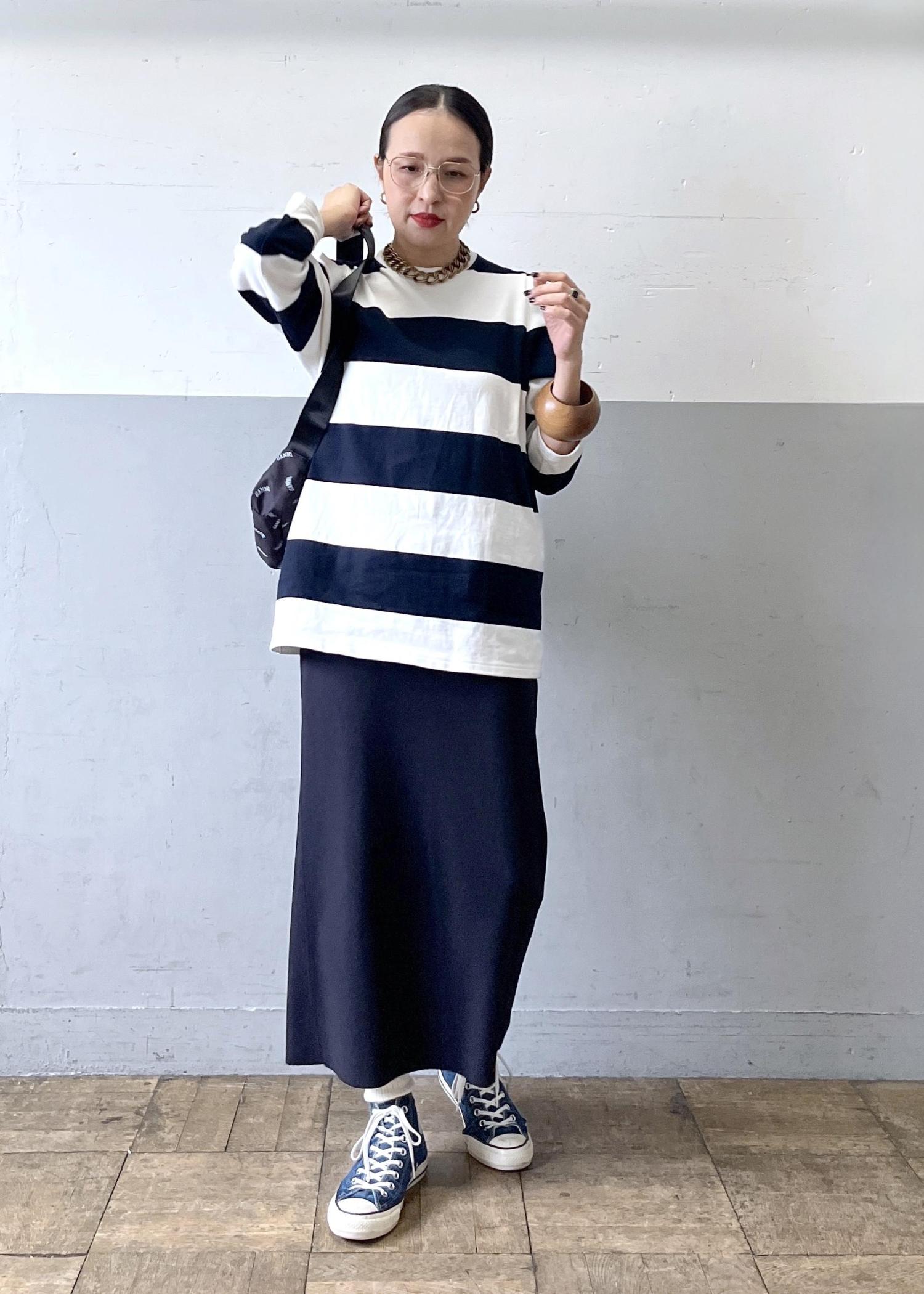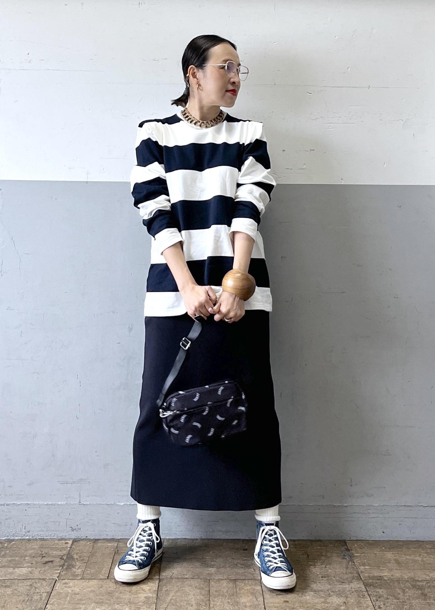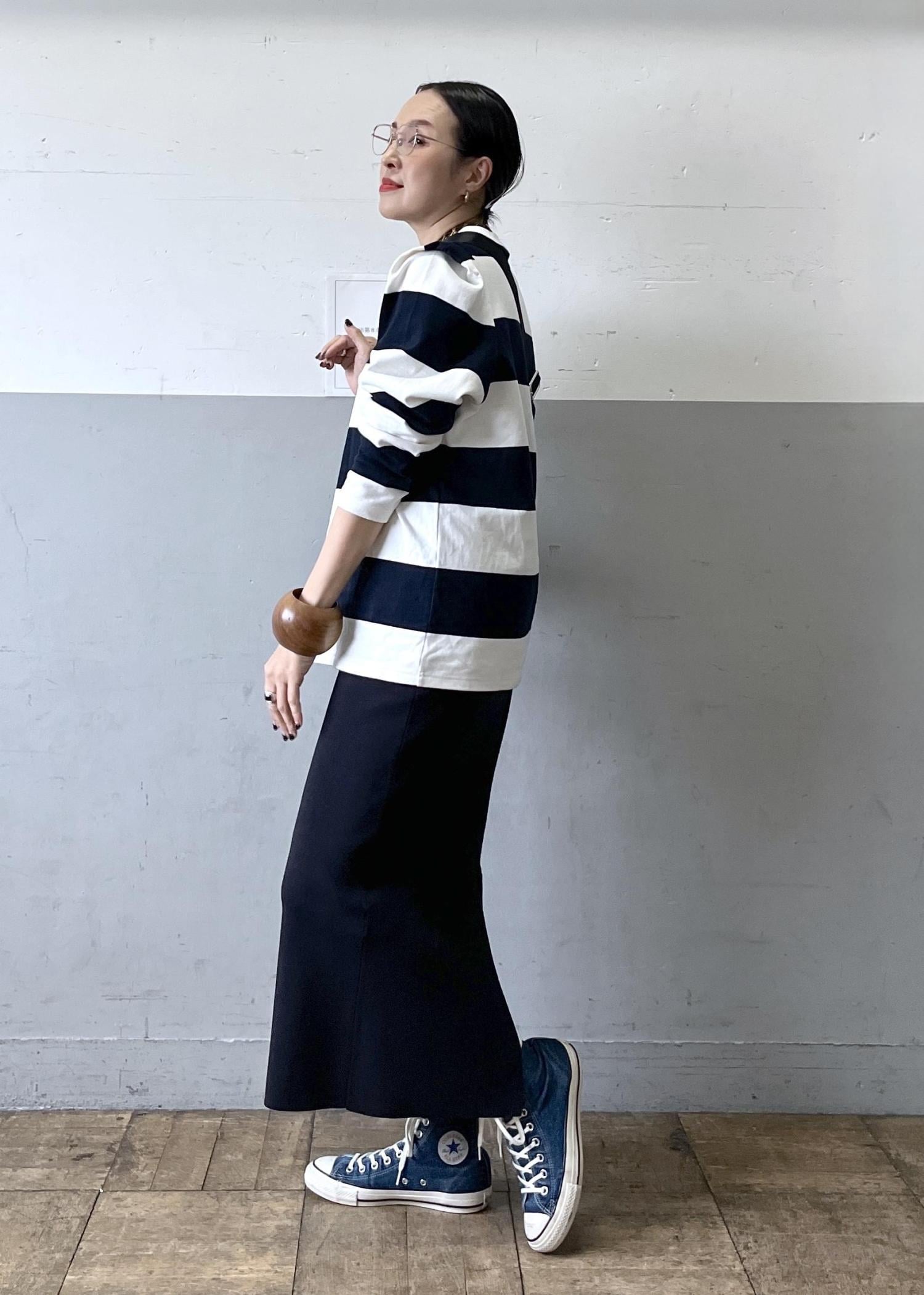 すっきりとしたIラインスカートを合わせることで、上にボリューム・下はすっきりとしたバランスに。