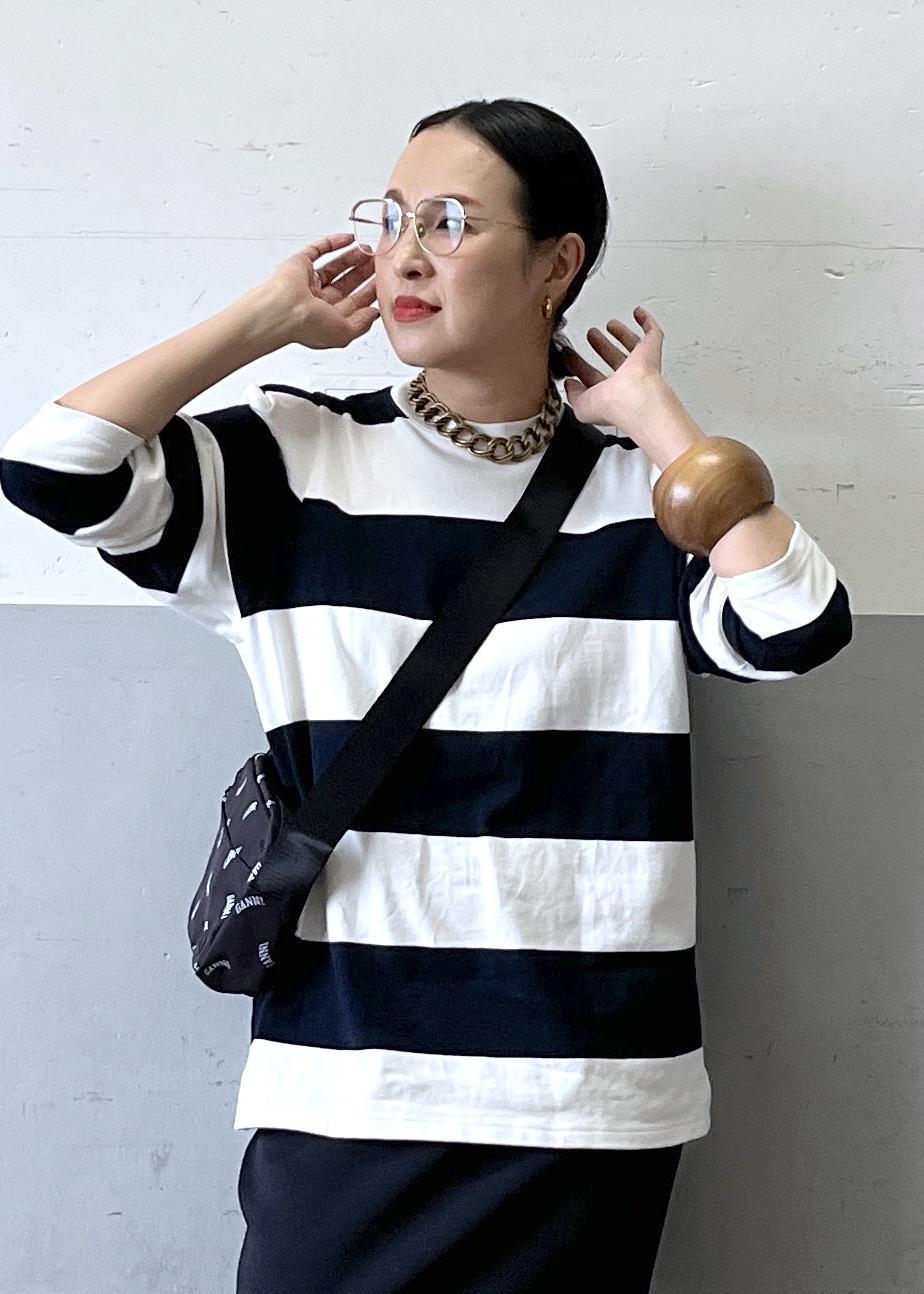 PHEENYのパワーショルダーボーダーを主役にしたスタイリング。