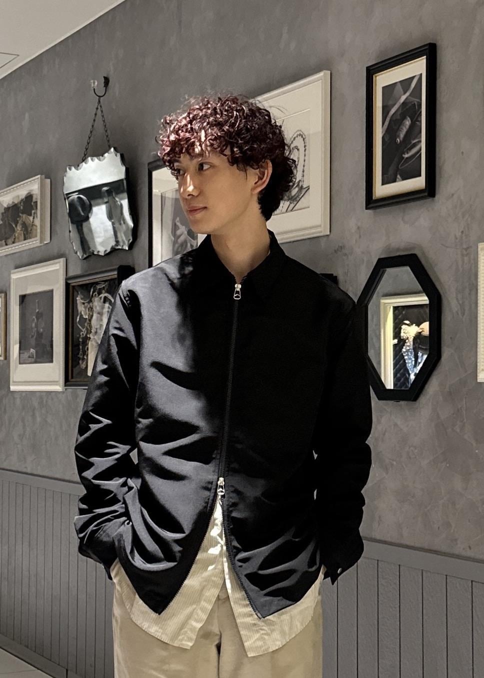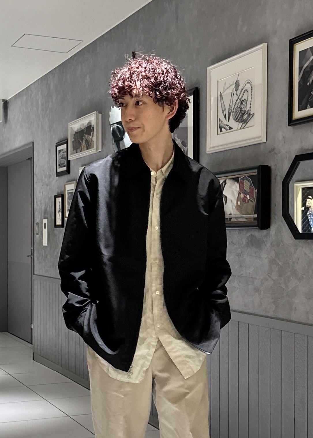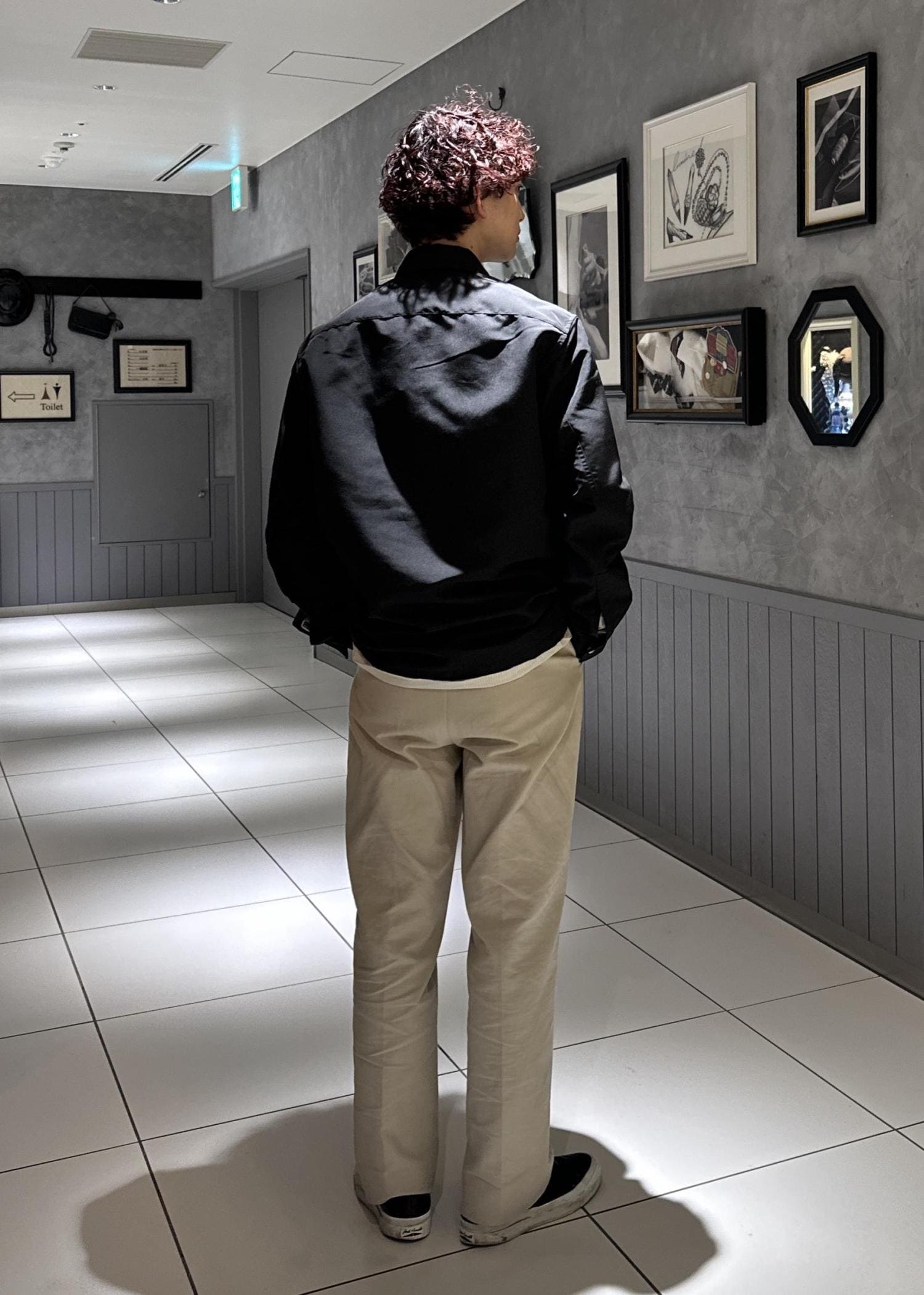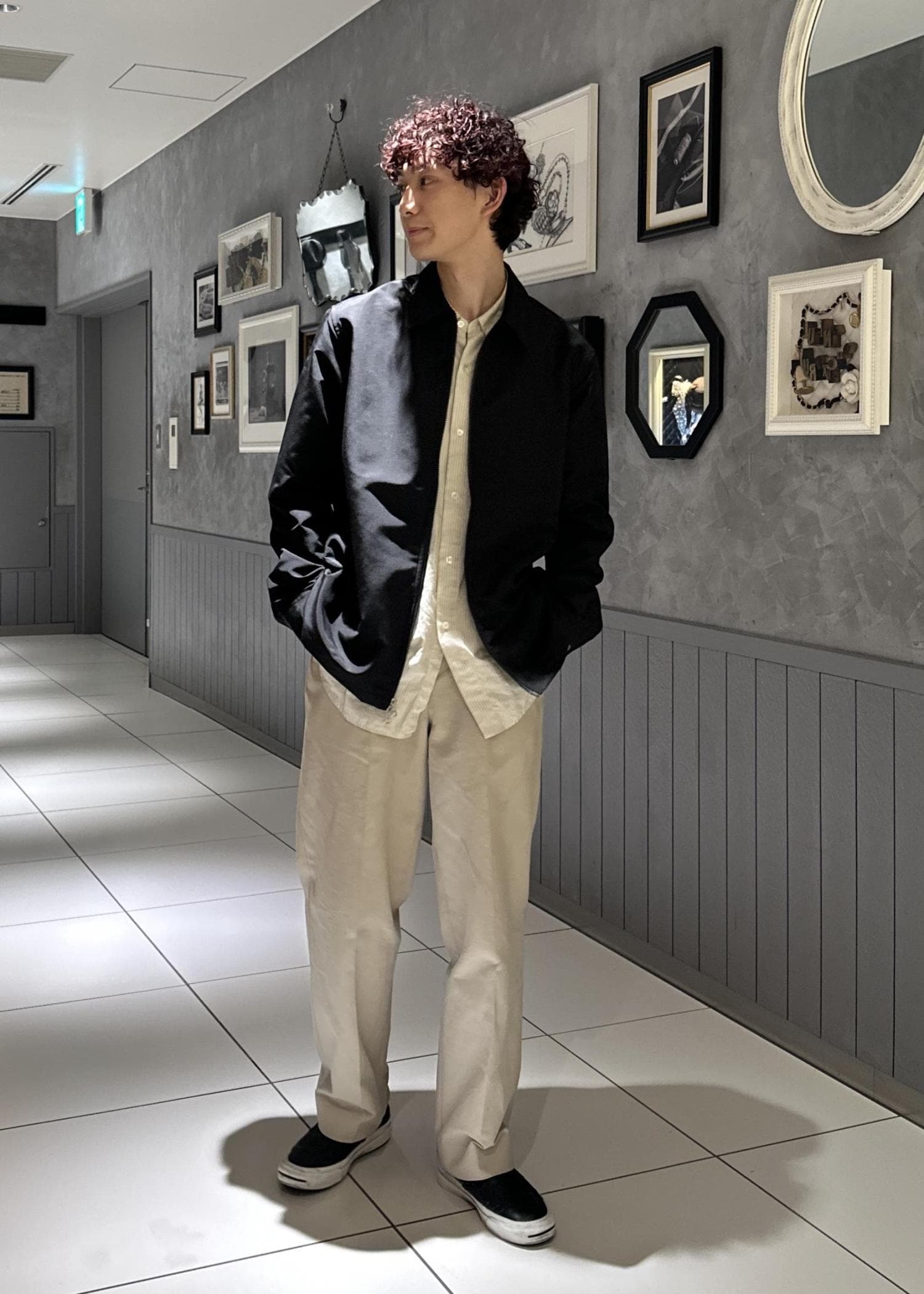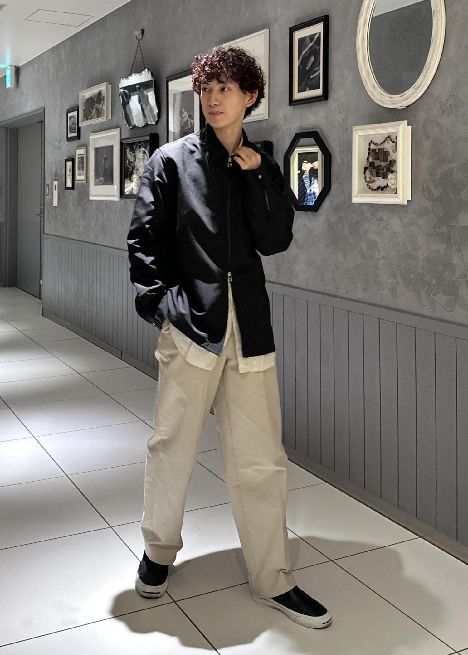 白のコットンスラックスに黒のナイロンジップブルゾンを合わせたシンプルなモノトーンコーデです。シャツで合わせ、キレイめ寄りに。シルエットと素材感を引き立てた、シンプルを意識したコーデに仕上げました。