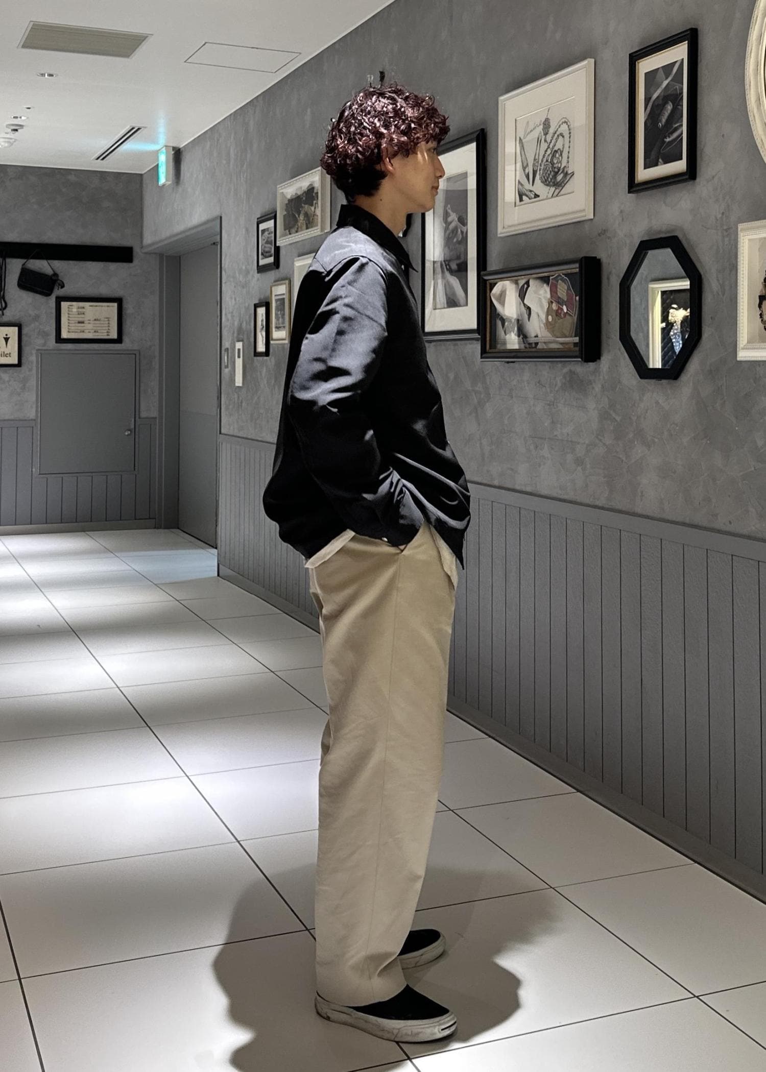 シンプルなデザイン。素材感の主張もそこまで強くないので、どんな雰囲気のお洋服とも合わせやすいです。程よくルーズなサイズ感です。