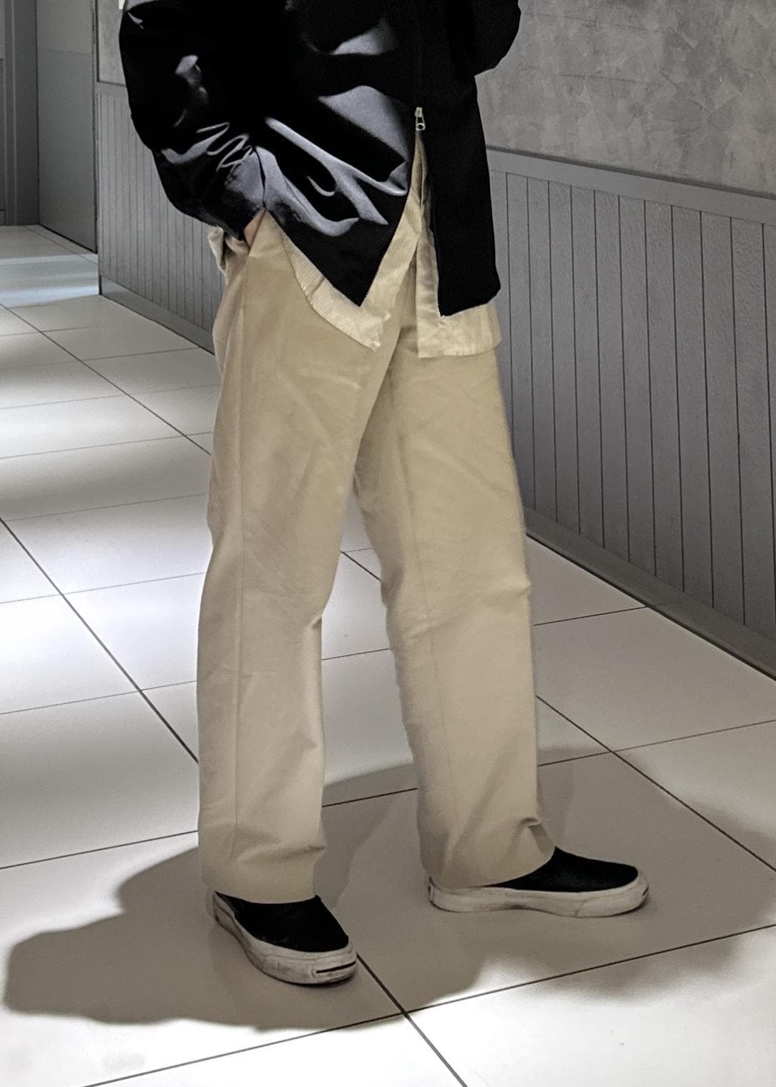 コットン100%の素材。スエードに近い触り心地です。ベルテッド付き。ややテーパードがかかっています。とにかくキレイなシルエットです。 -
