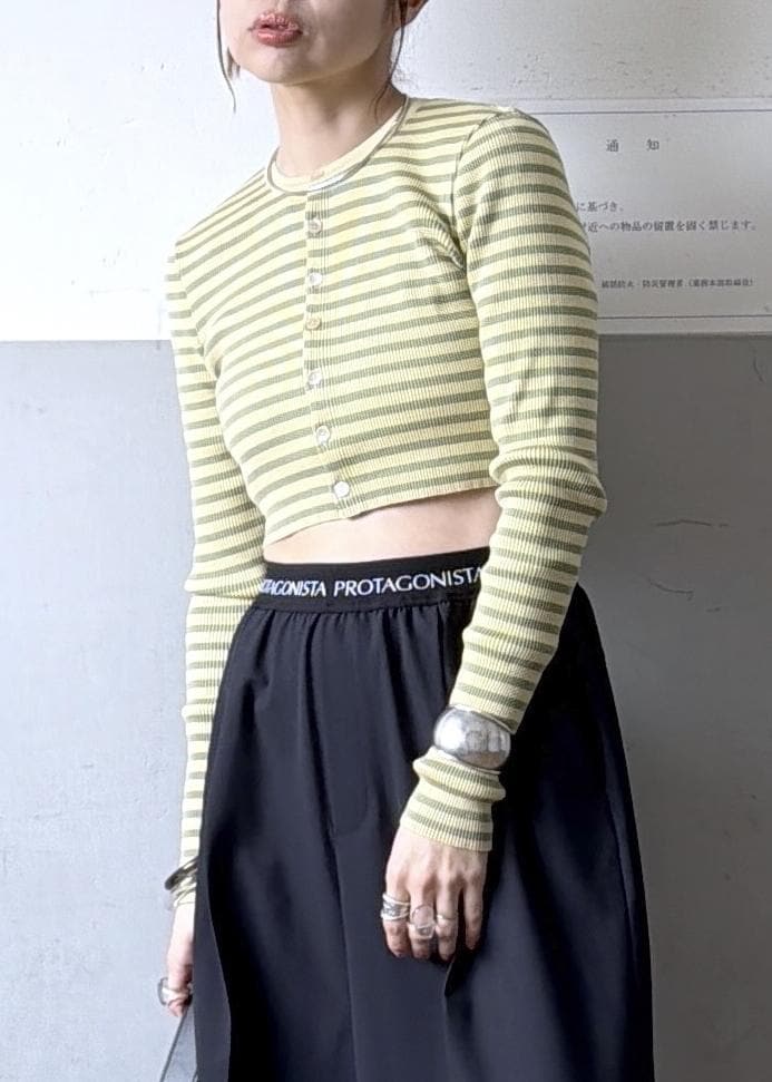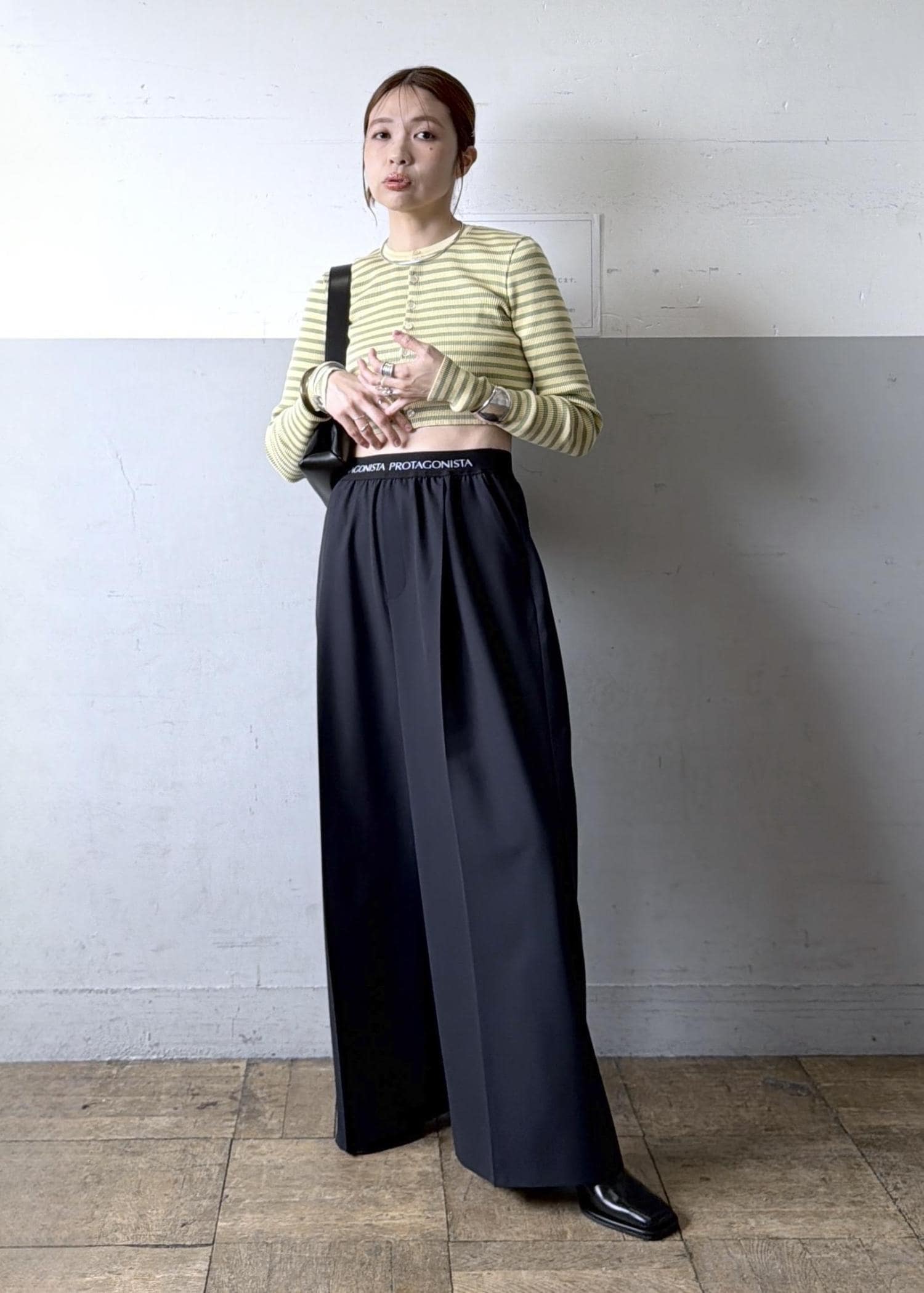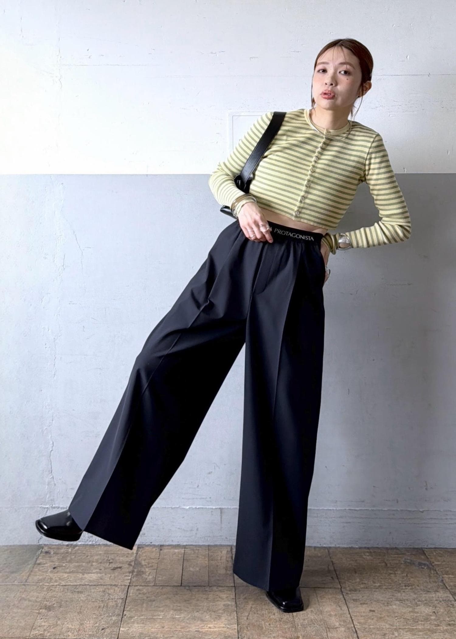 ウエストのデザインを見せたかったので着丈の短いカーディガンと合わせました。