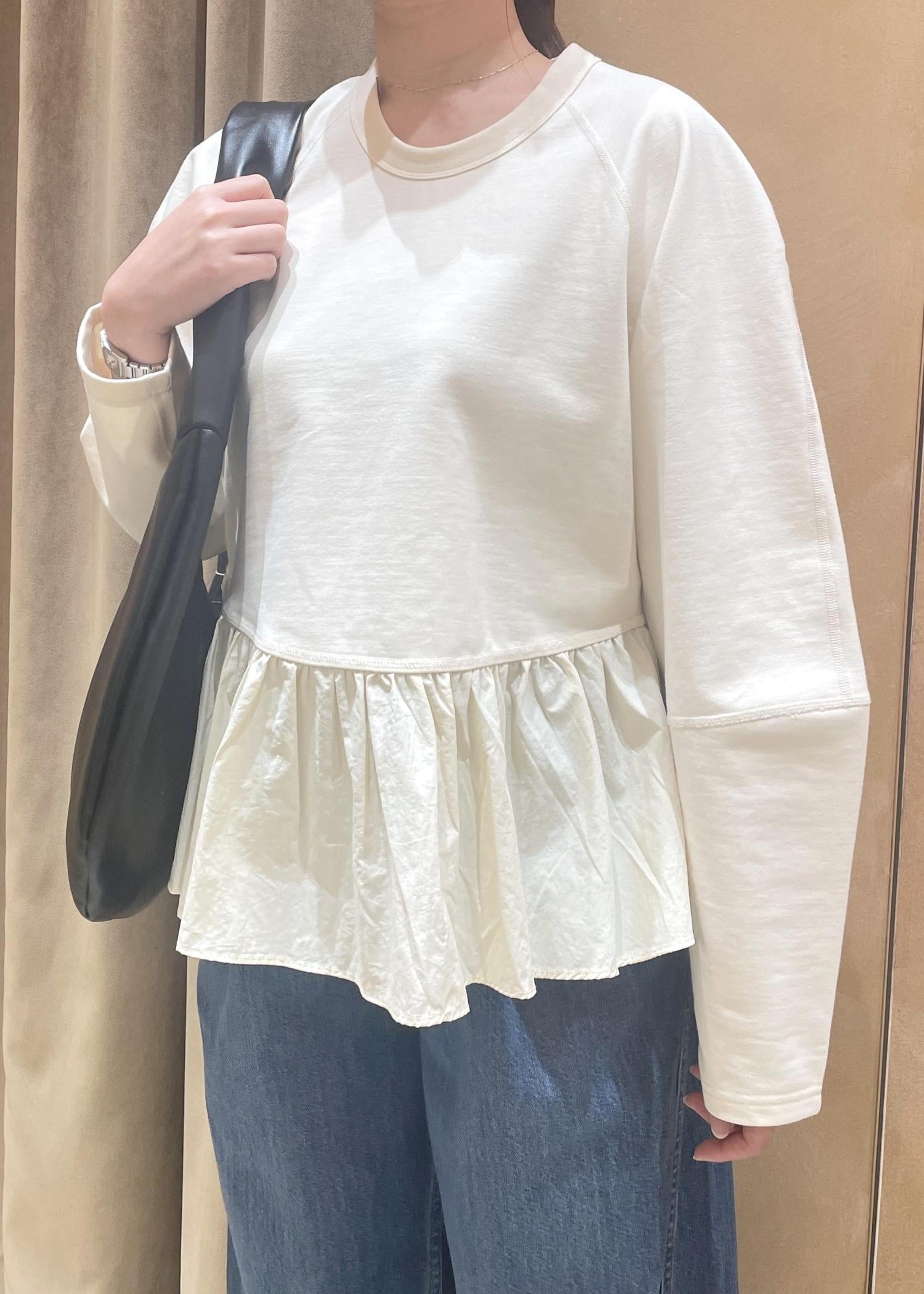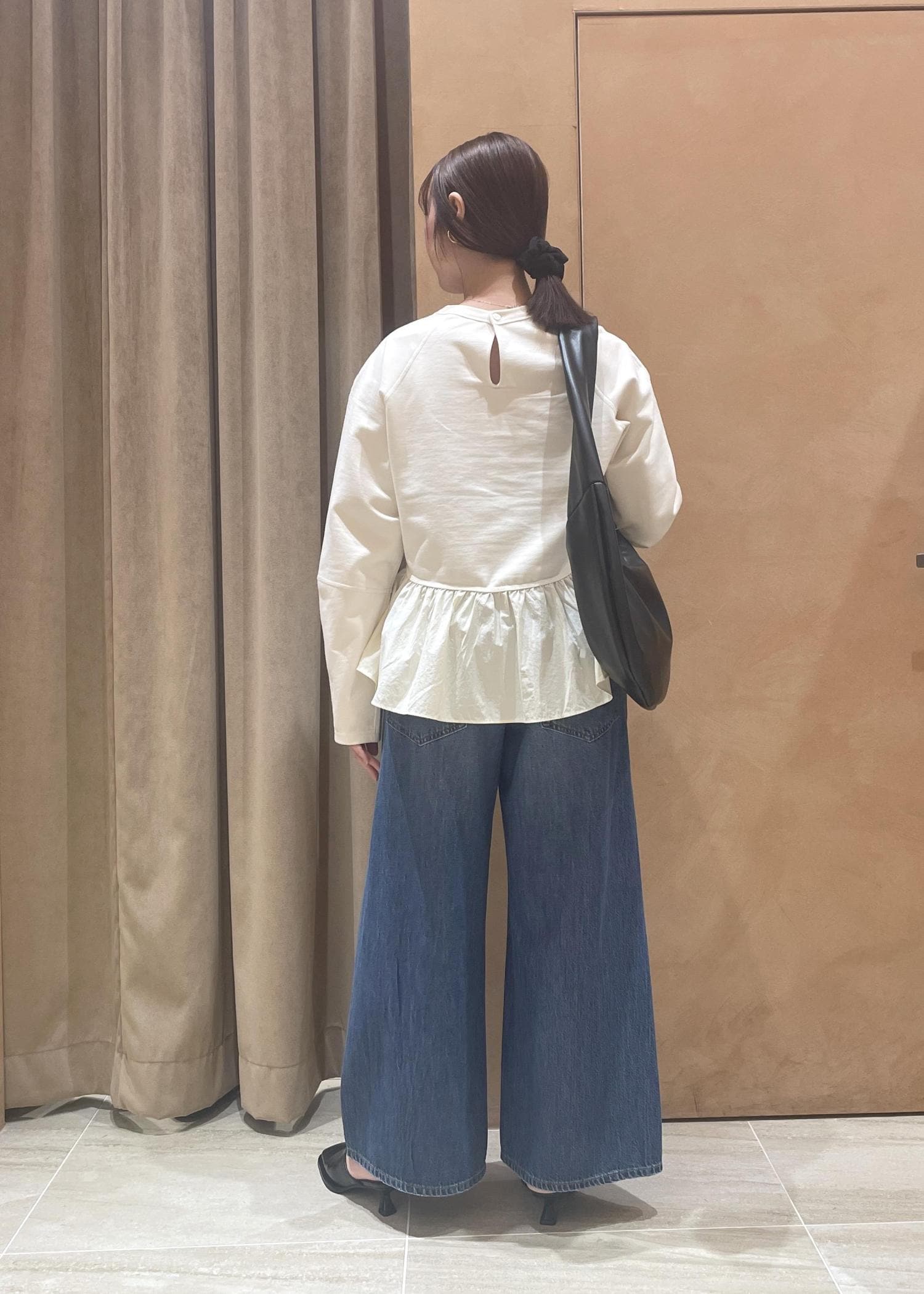 ペプラムトップスでも素材にコットンご入っているのでキレイめすぎず、デニムなどのカジュアルな服装ともとてもマッチします☺︎