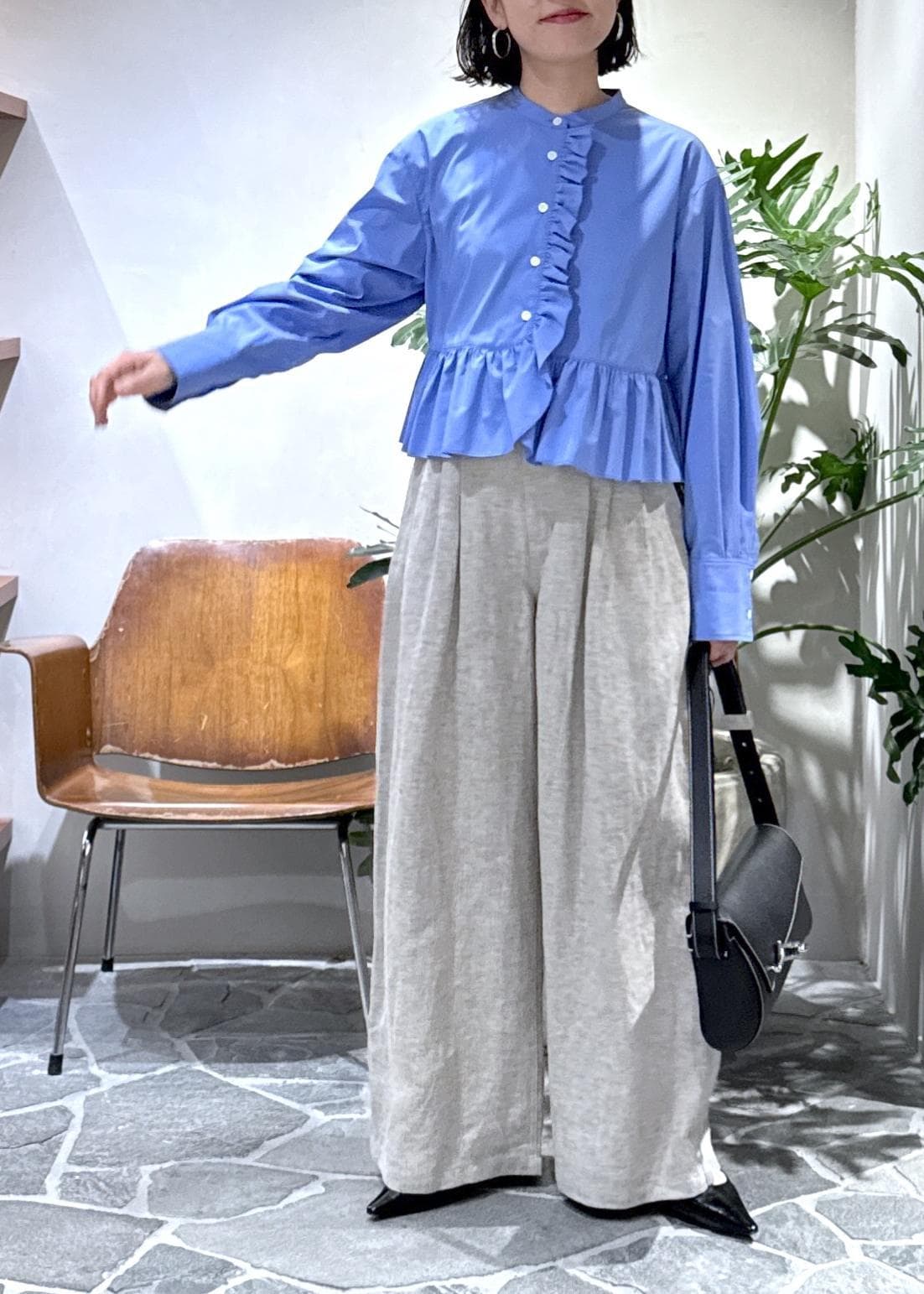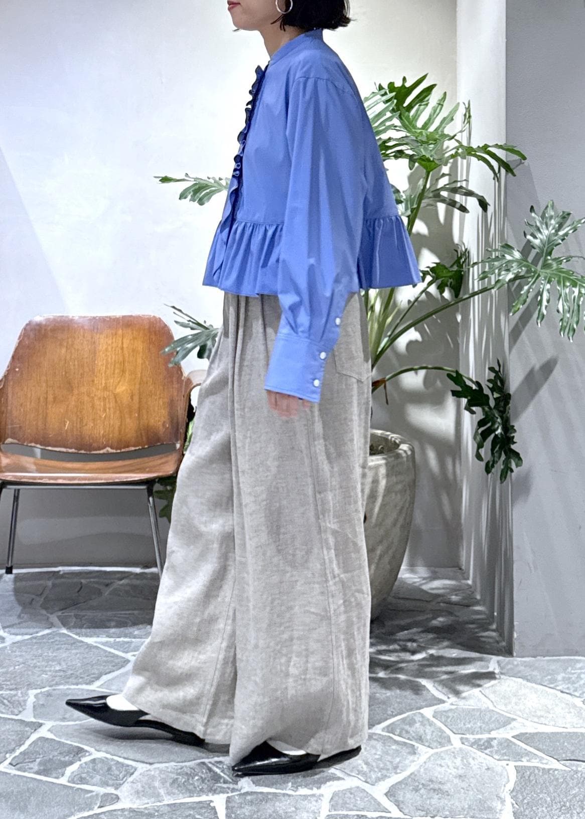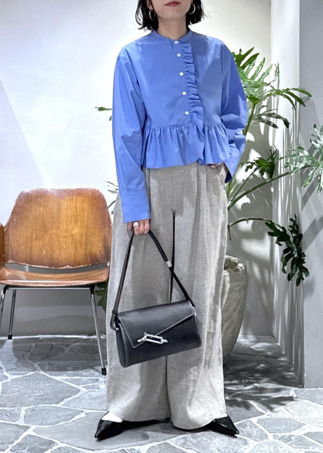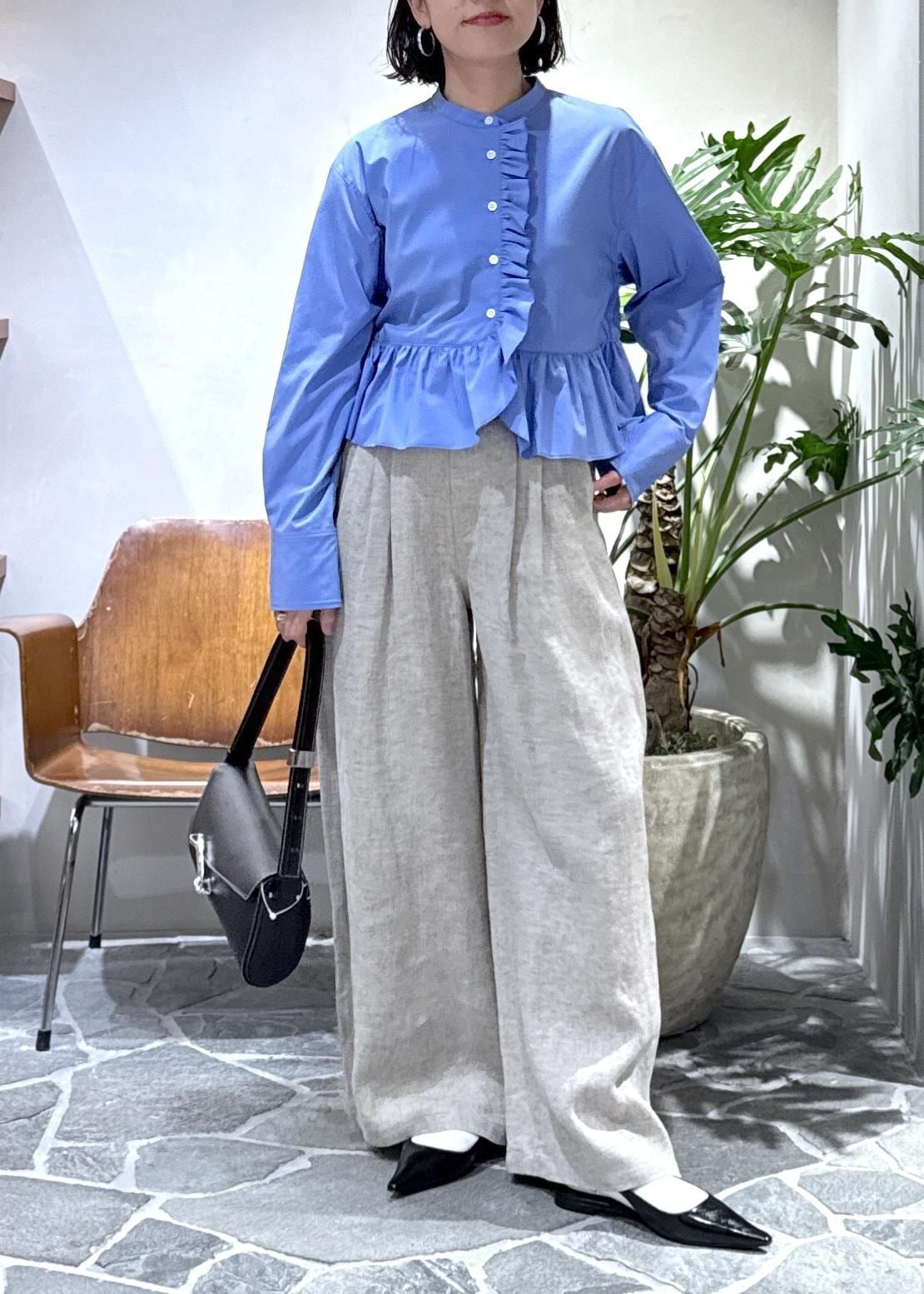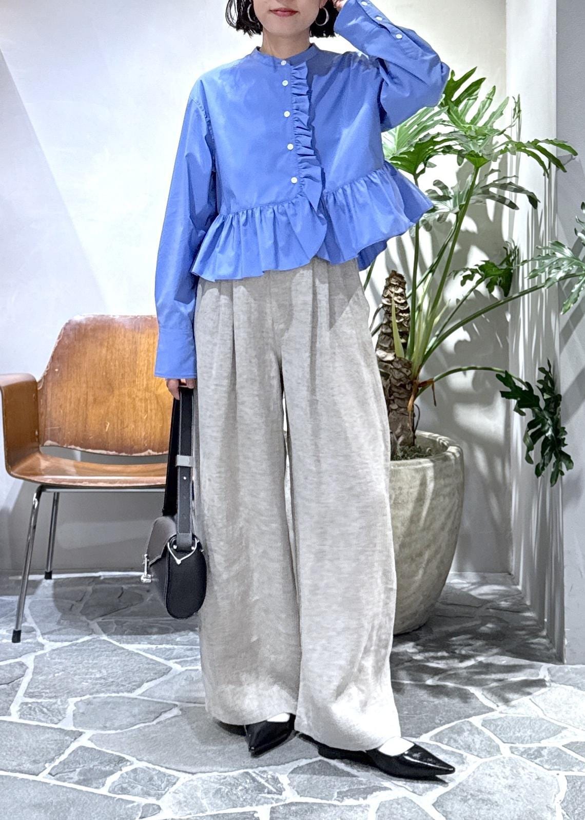 大胆なフリルも短丈とバンドカラーというところで、甘さが控えめに。ハリのある生地もきちんと感をプラスしてくれるので30代以上が挑戦しやすいブラウスになっています。
