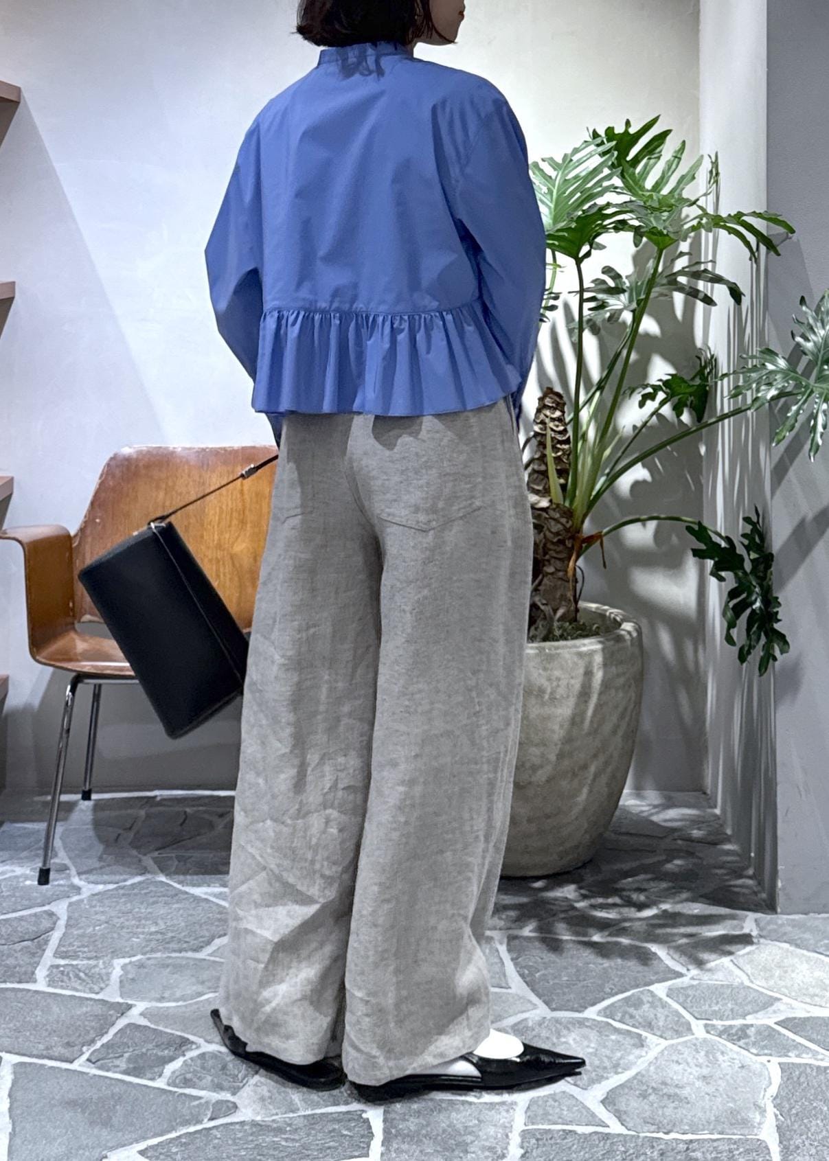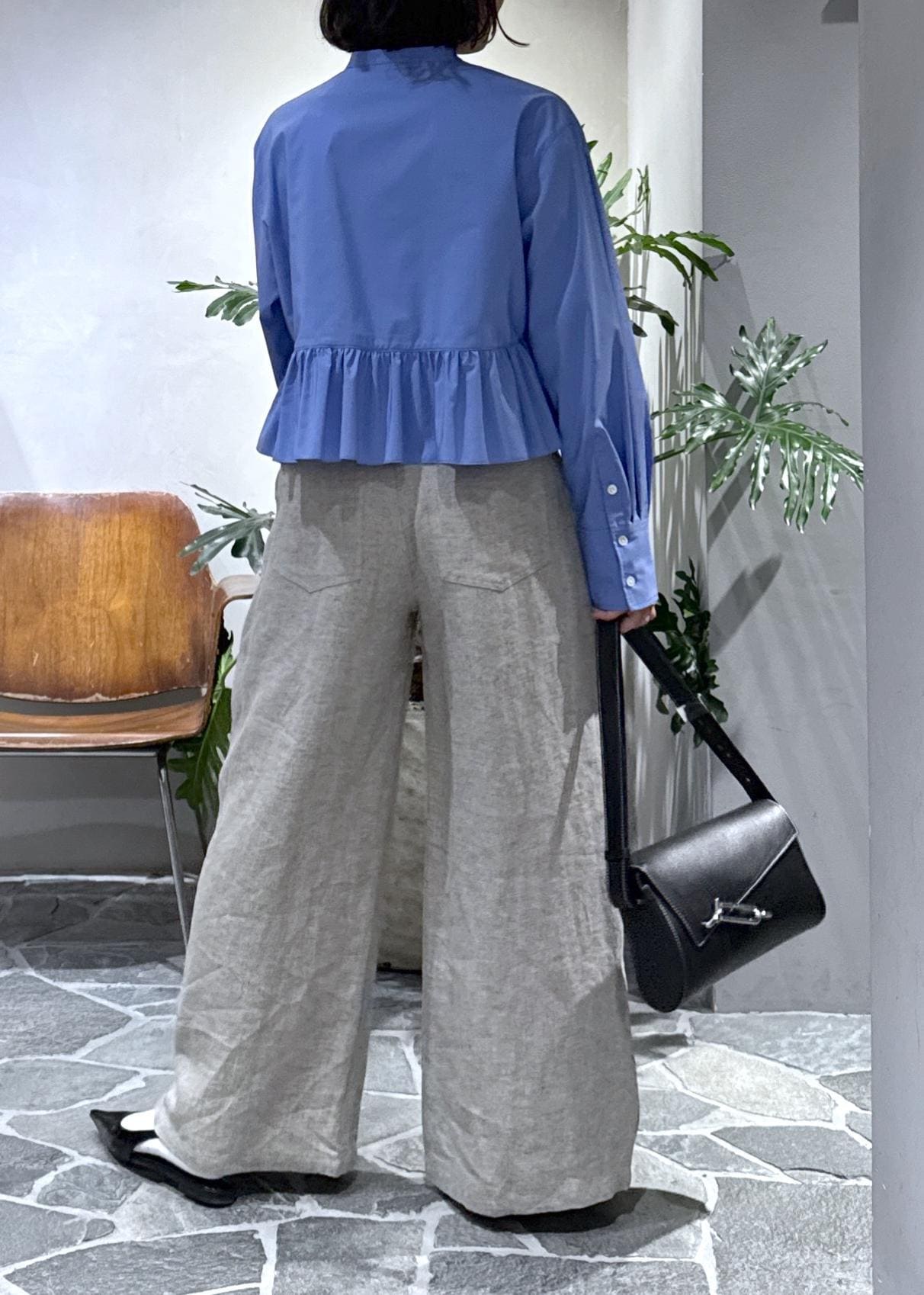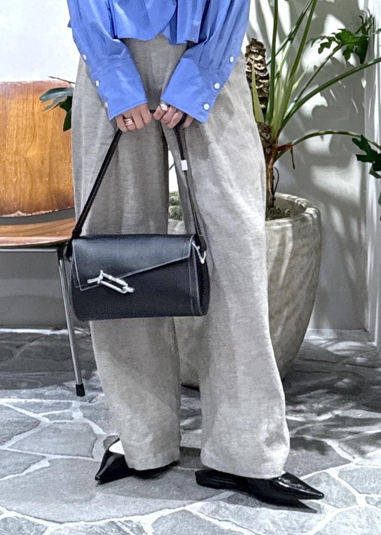 ワイドな身幅でもあるので、ワイドパンツと合わせてキレイめカジュアルなスタイルにしました。
