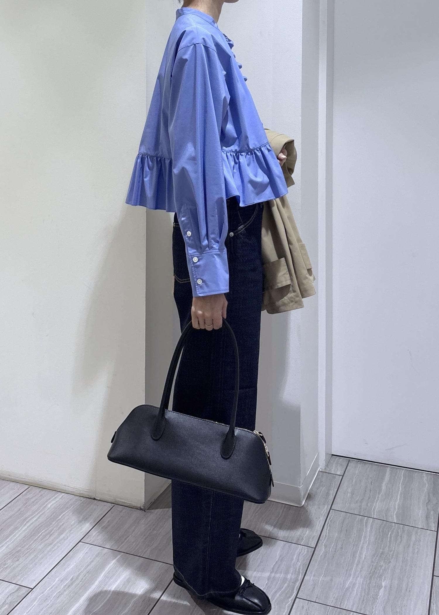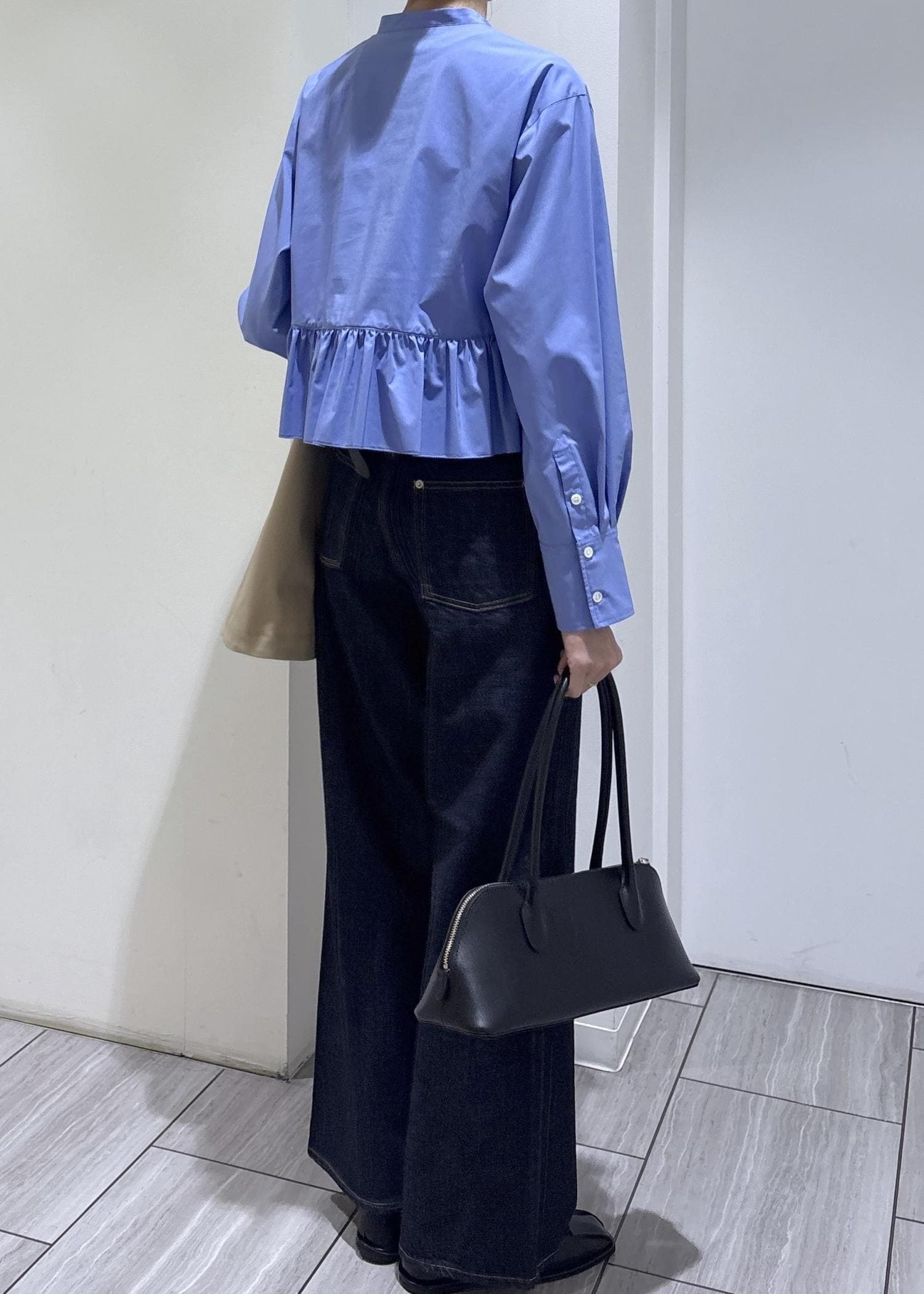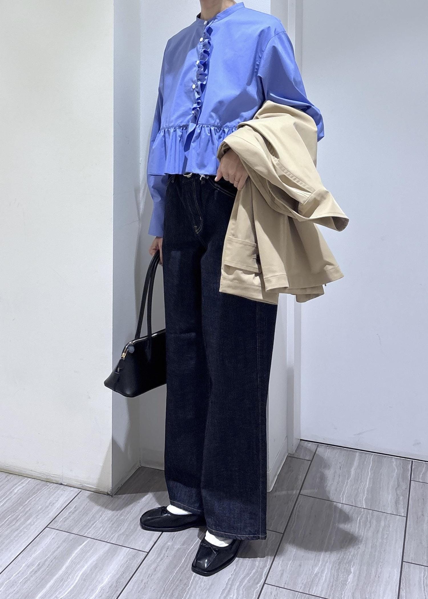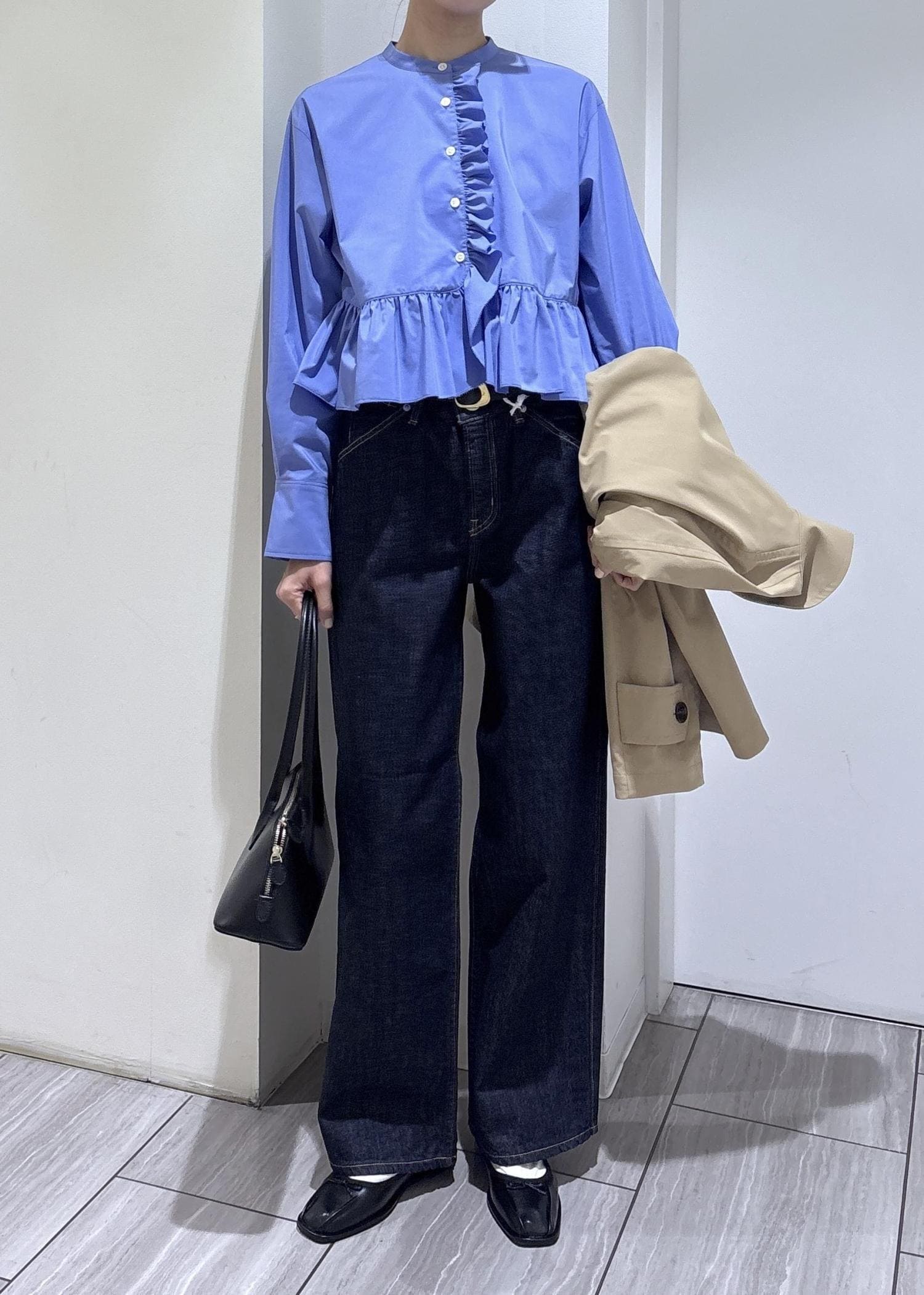 ショート丈とフリルがポイントのブラウスなので、ワイドデニムでバランス良く、甘くなり過ぎないようにしました。