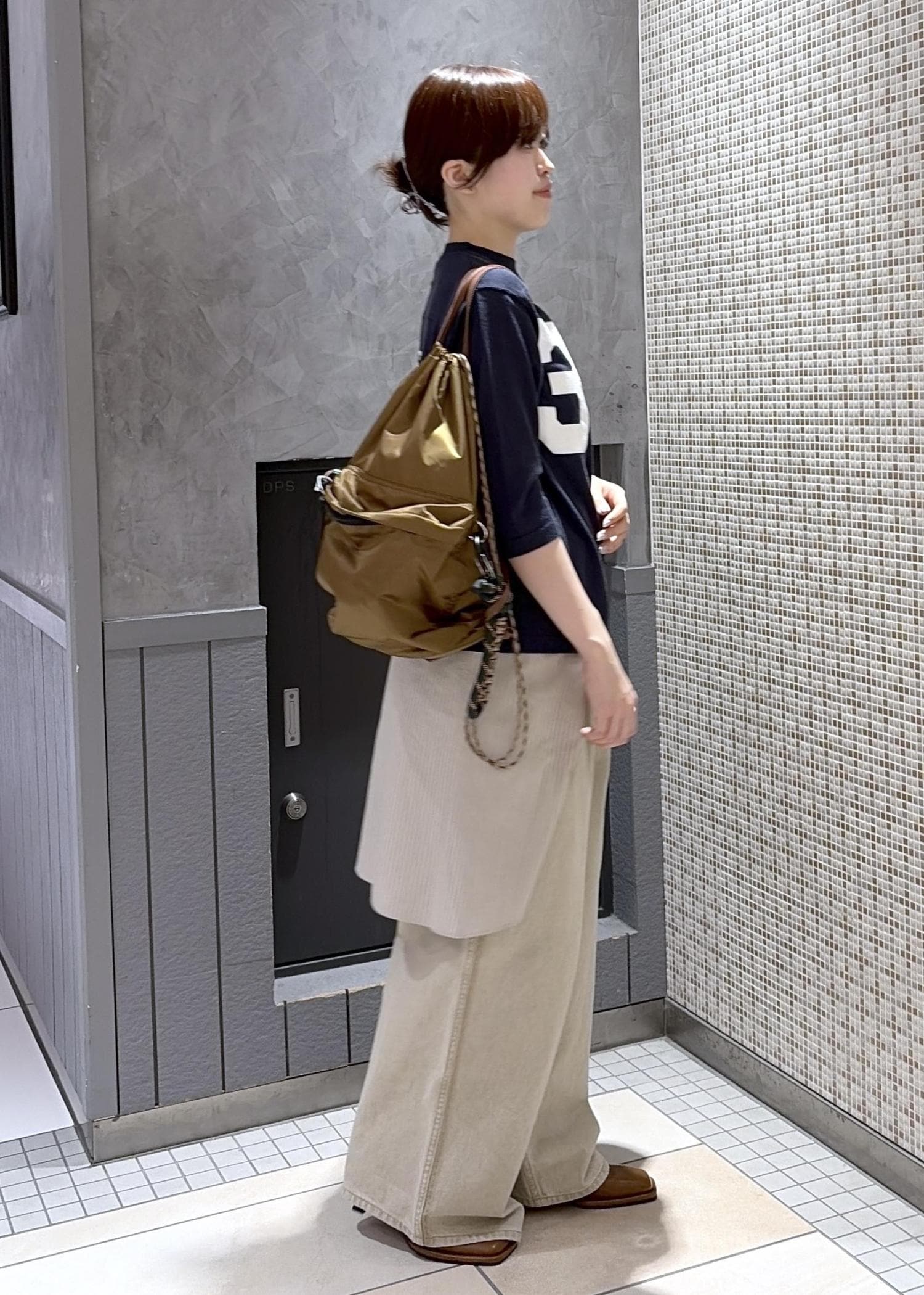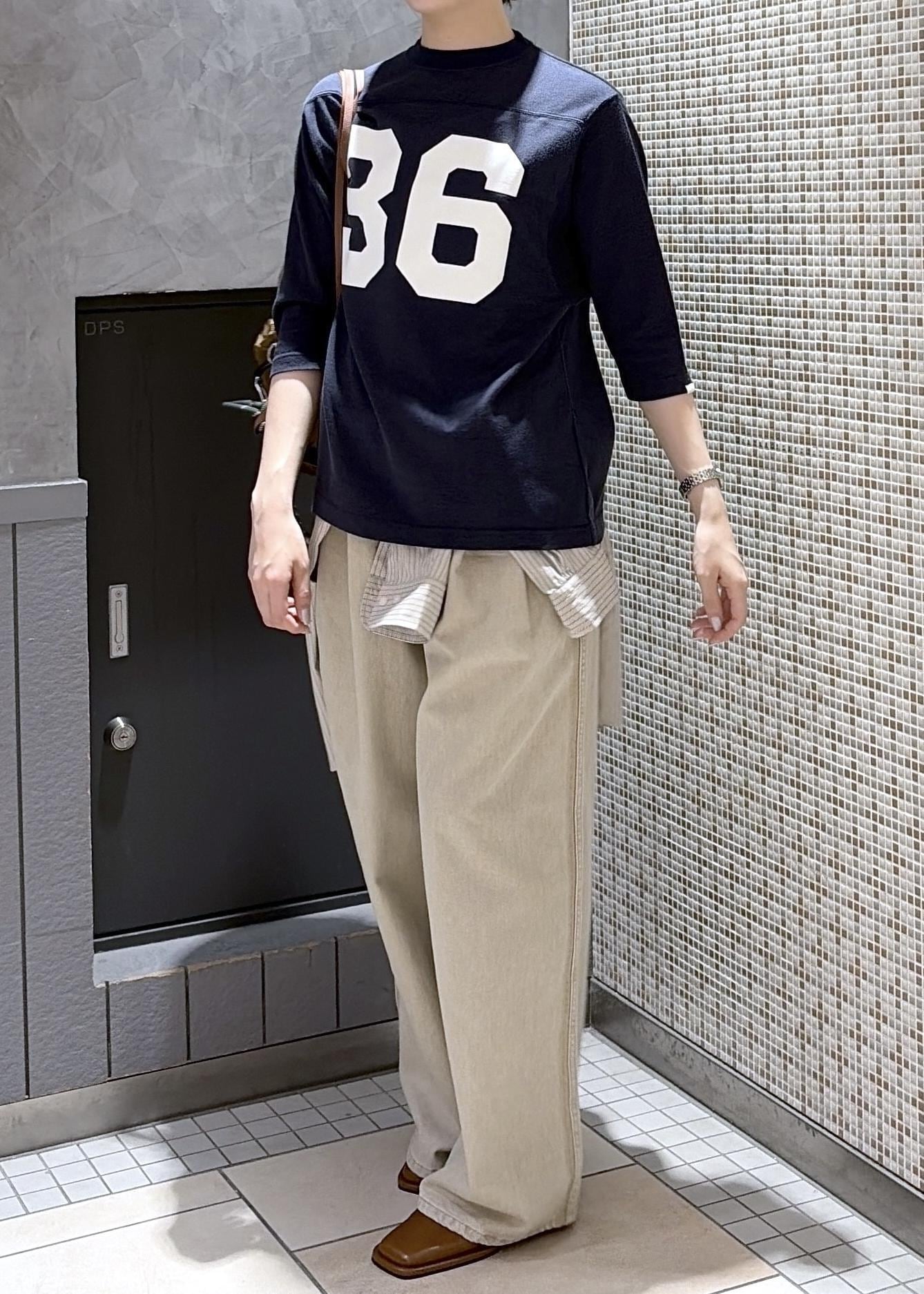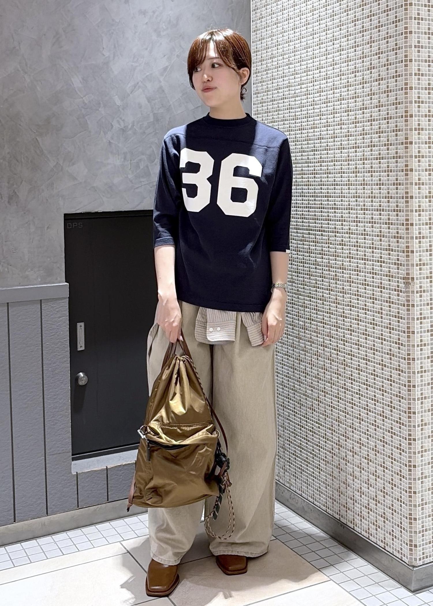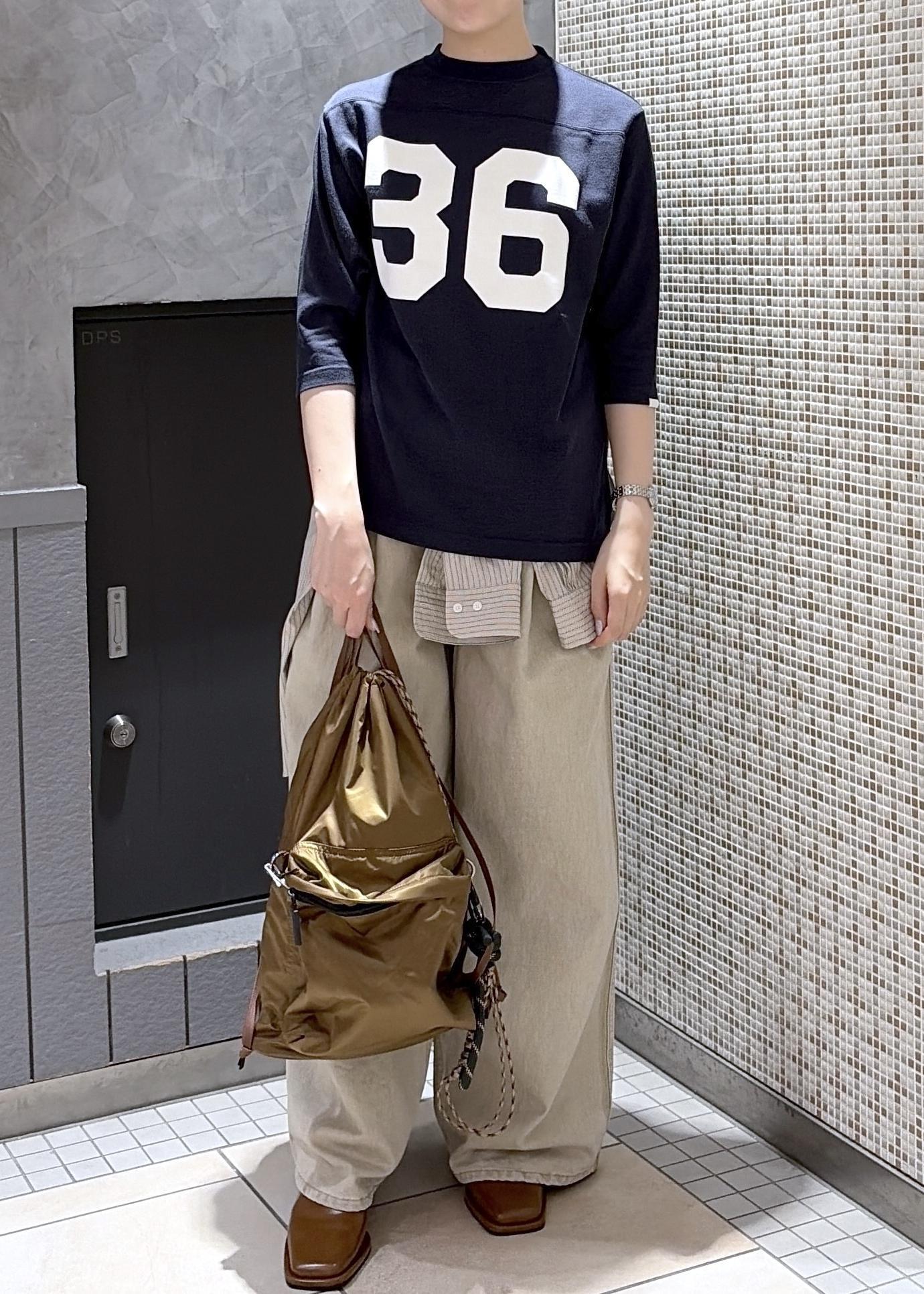 今回は、オブラダの別注フットボールTシャツをつかったスタイリングです。シャツを腰巻きにすることで、スポーティーのなかに、こなれ感をだしてみました⭐︎