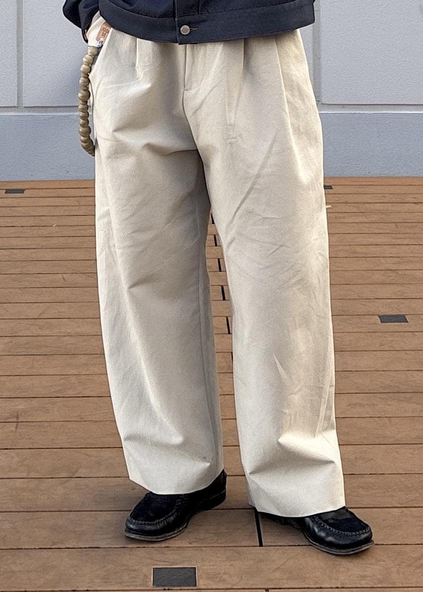 ADAM ET ROPÉ HOMMEコットンダブルクロス バギースラックスベージュ / M¥28,600レビュー足回りは全体的にボリュームがありますが、ウエストは大きすぎず、僕の体型でベルトがなくても普段履きする腰位置で履くことができました。コットン素材で通年履けるのも◎