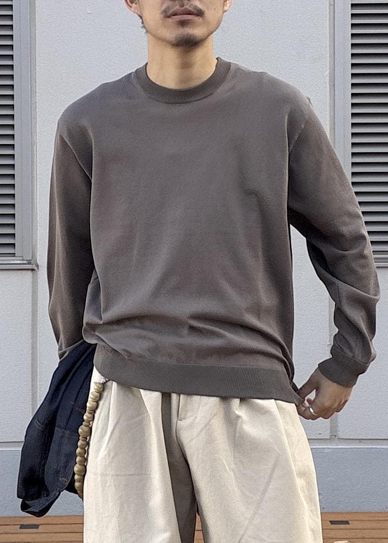 ADAM ET ROPÉ HOMME強撚プレーティングニットプルオーバーチャコール / M¥12,100レビューややゆったりめのサイズ感で、大きめに着たい方は一つ上のサイズがおすすめです。コットンとポリエステルがメインの素材なのでとにかく扱いやすく、インナーから一枚着まで汎用性が高いのも◎