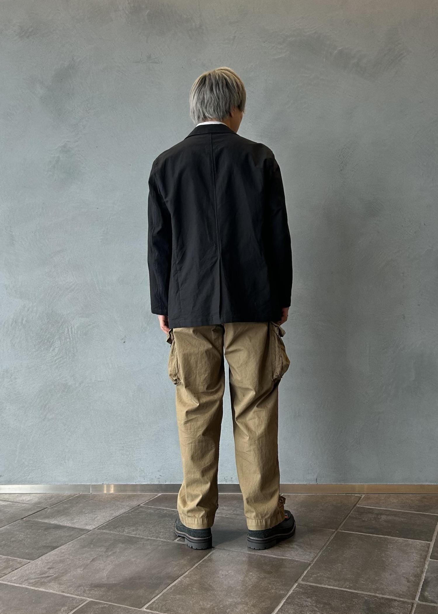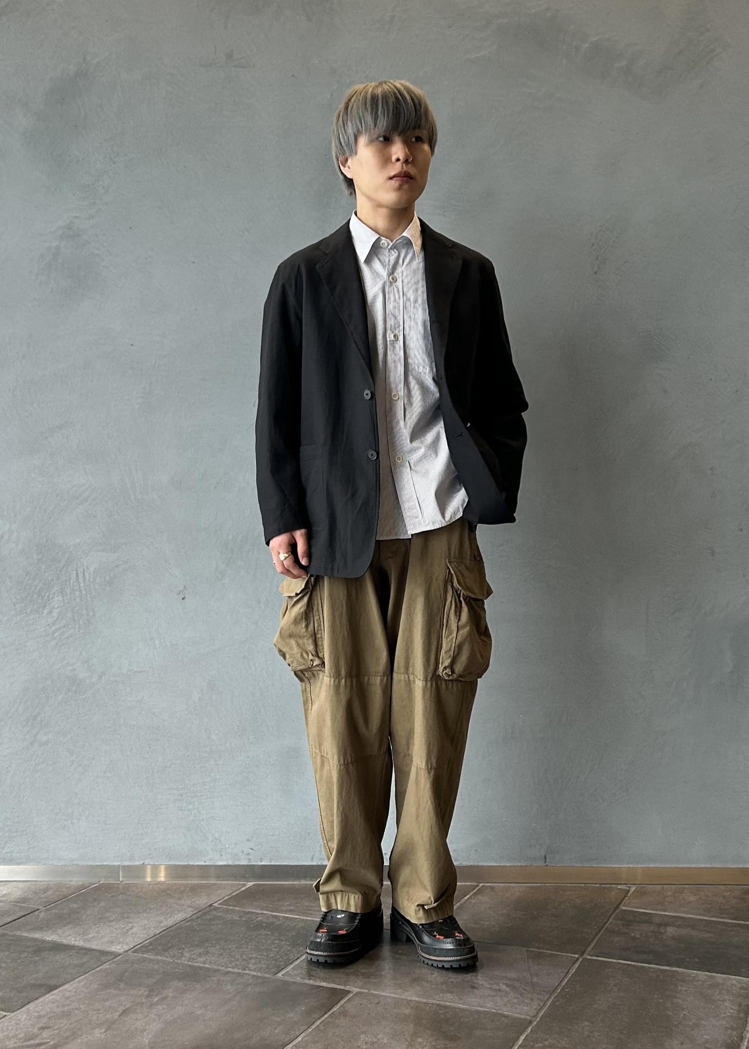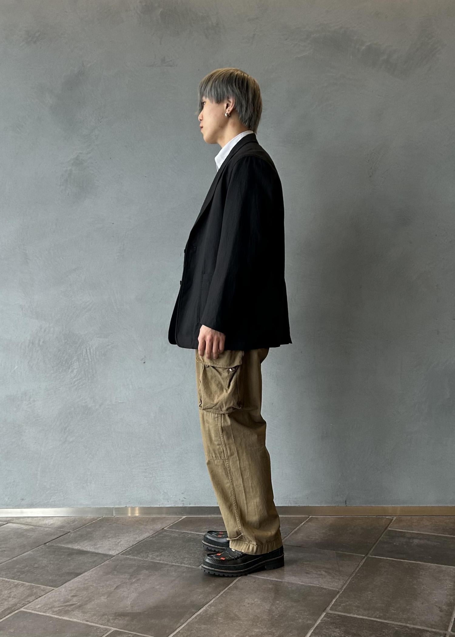 キレイめなジャケットながらも素材でカジュアルさを表現しており、カーゴパンツやデニムパンツなどのワークミリタリー系のパンツと相性がとても良いです。