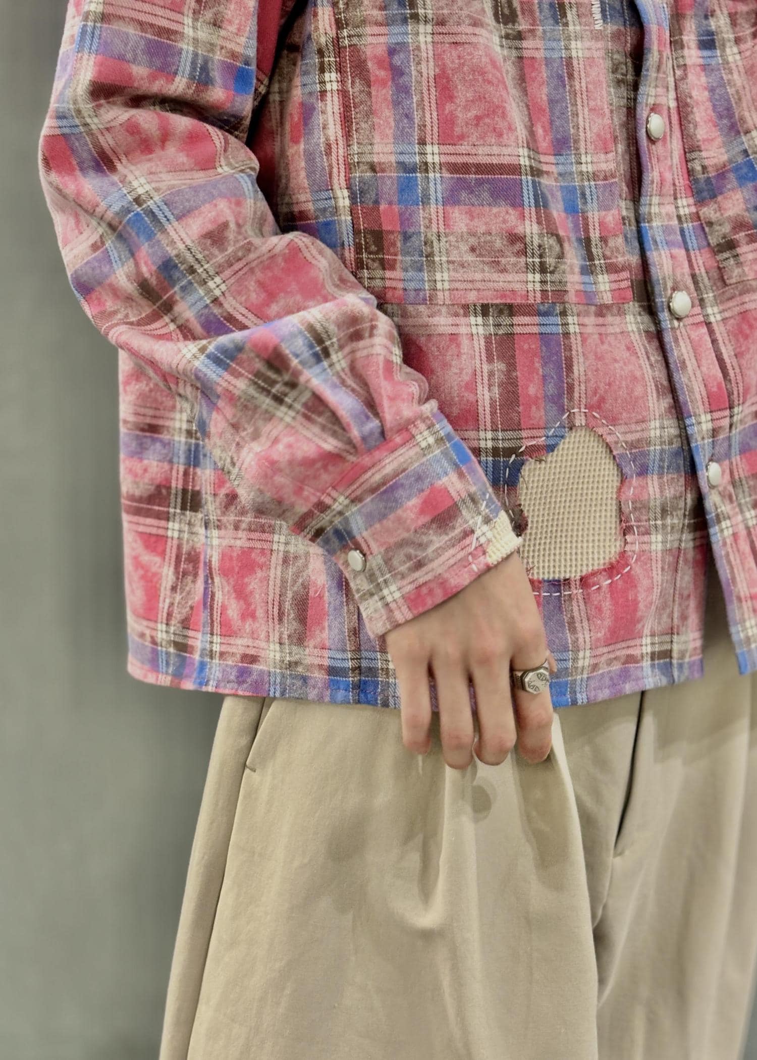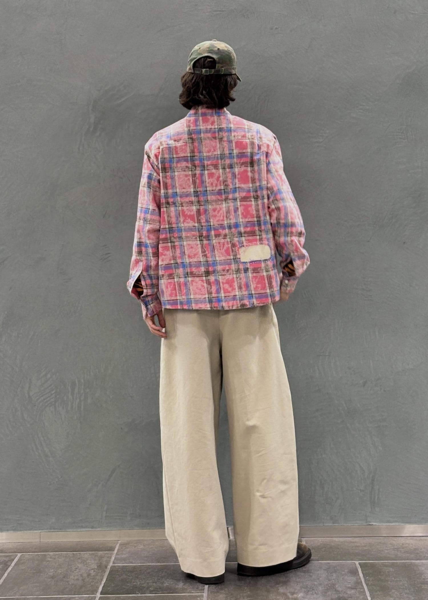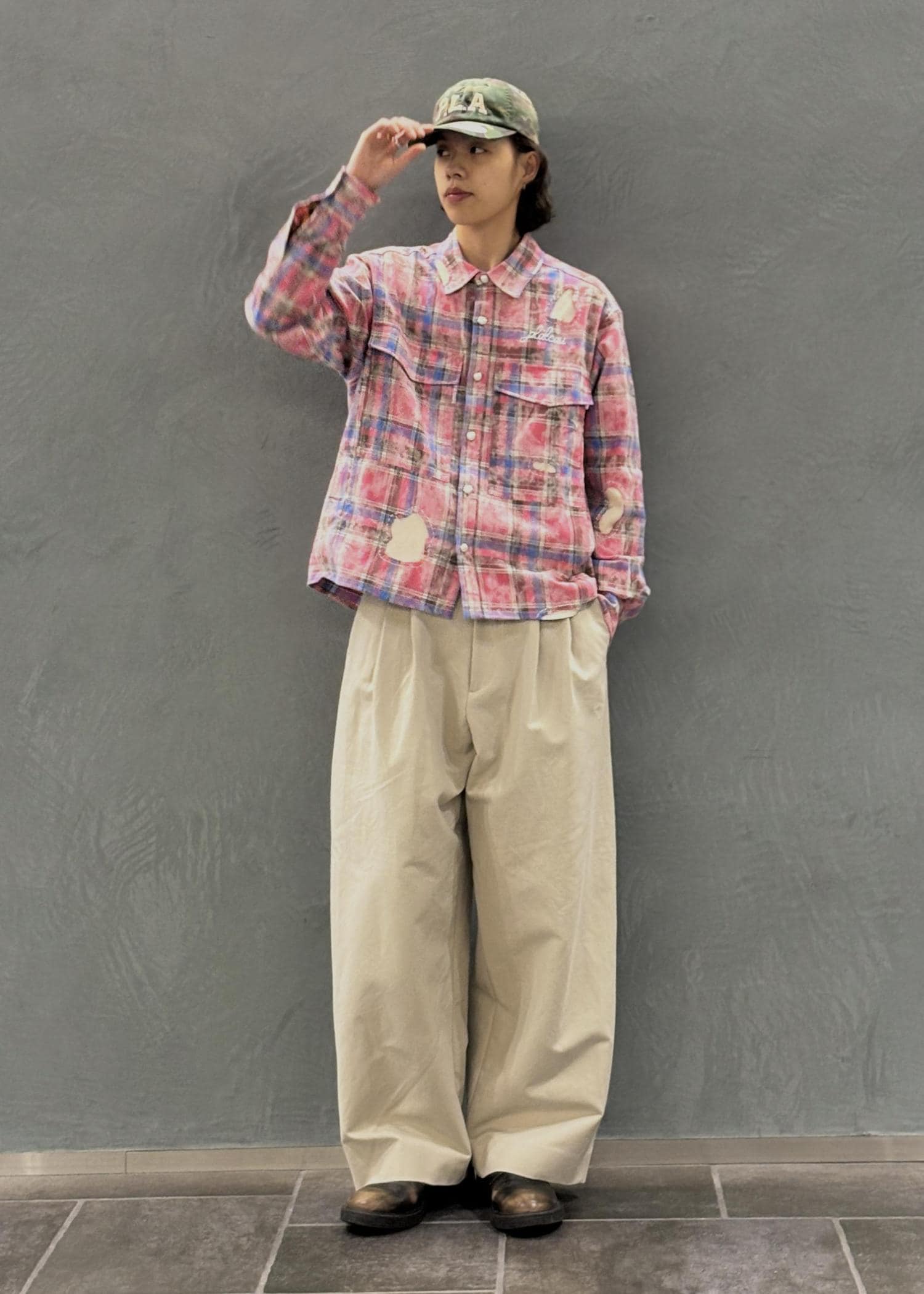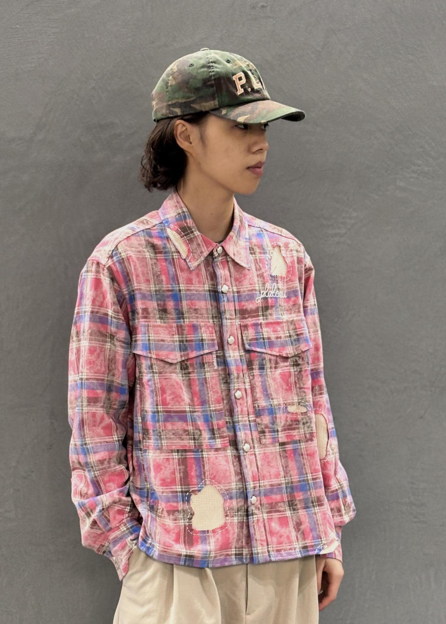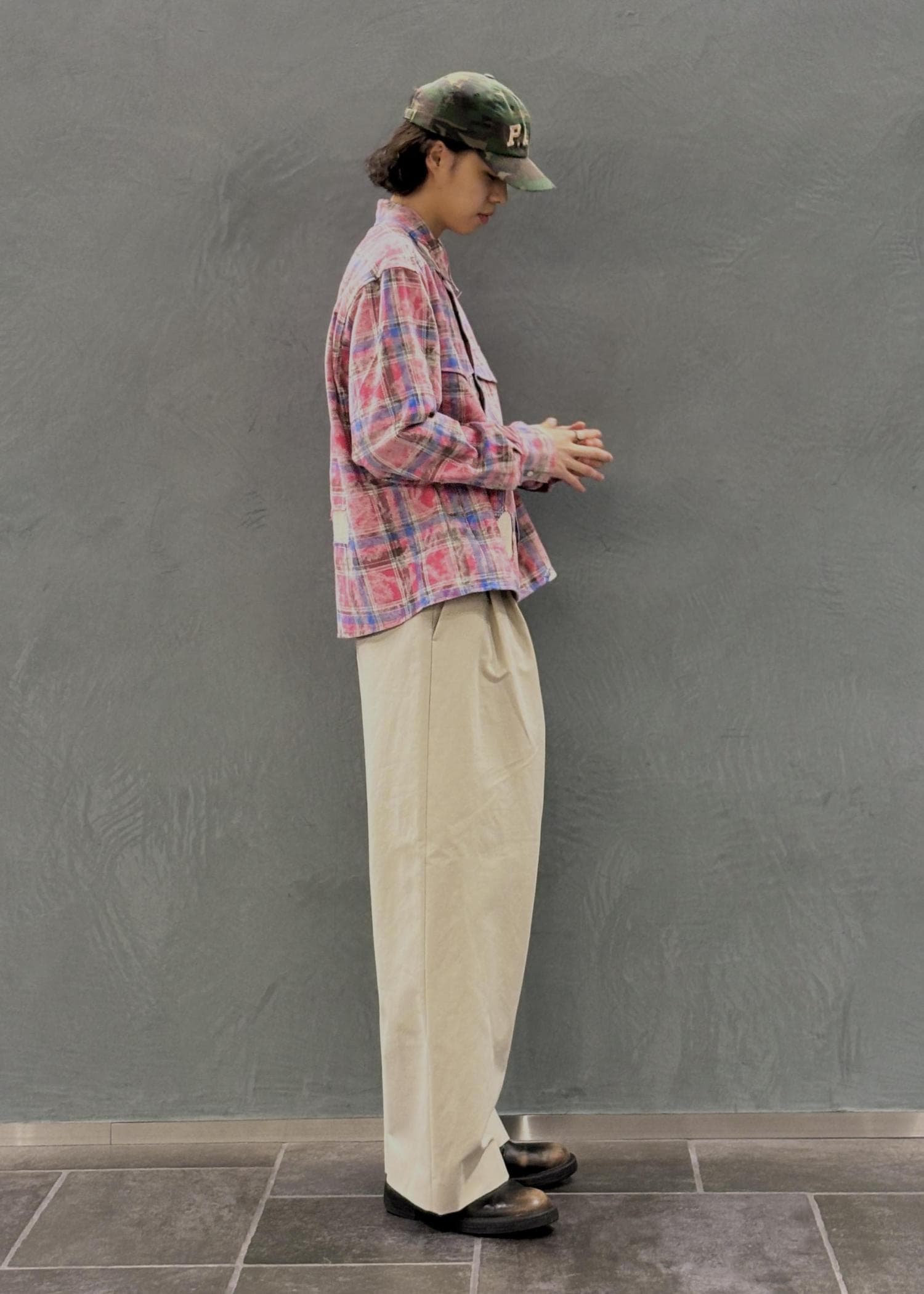 派手なパッチワークチェックシャツを主役にしたスタイリング。