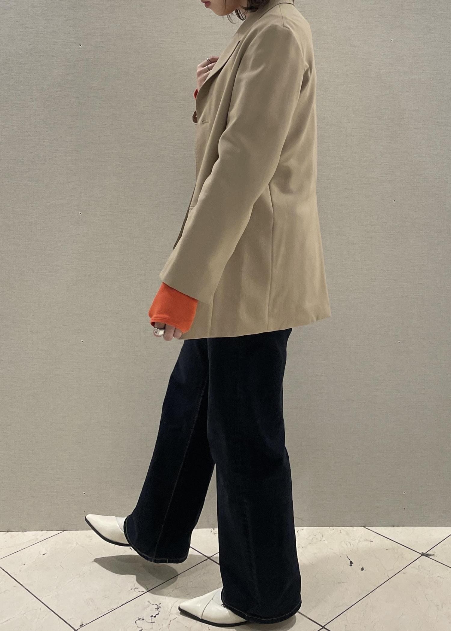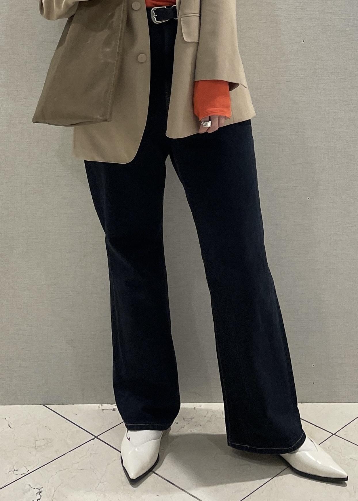LEEの別注デニムパンツのマットな質感と、シューズの鋭利なフォルムが程よく綺麗めな雰囲気に寄せてくれています。