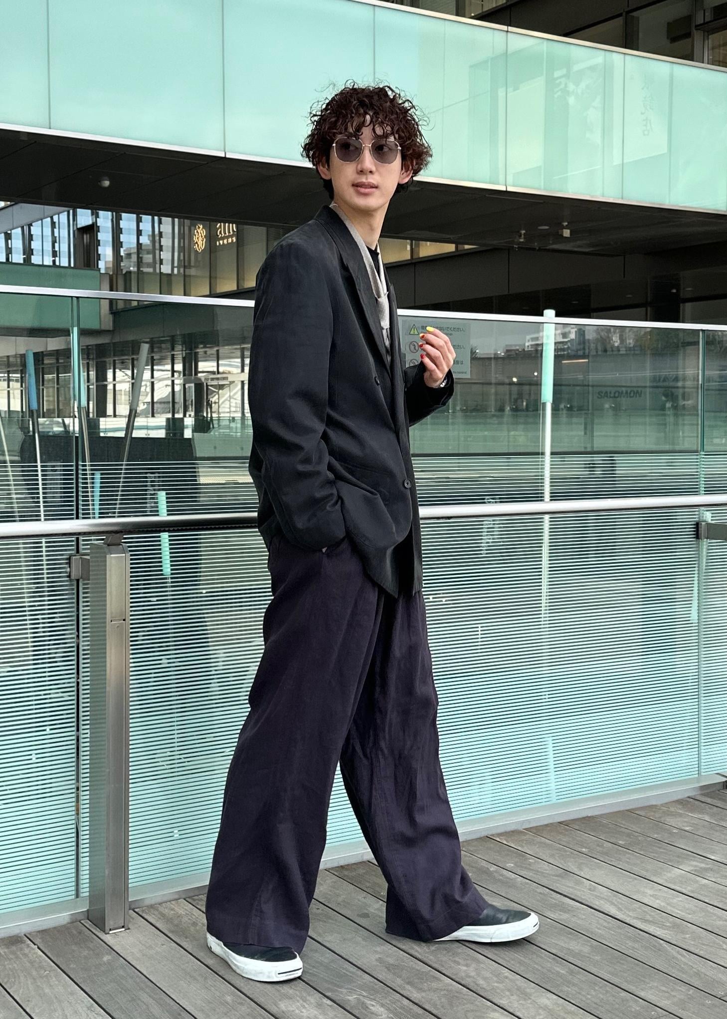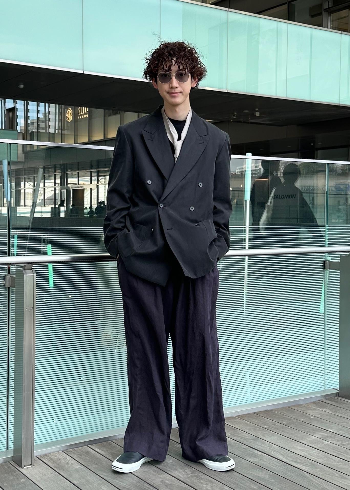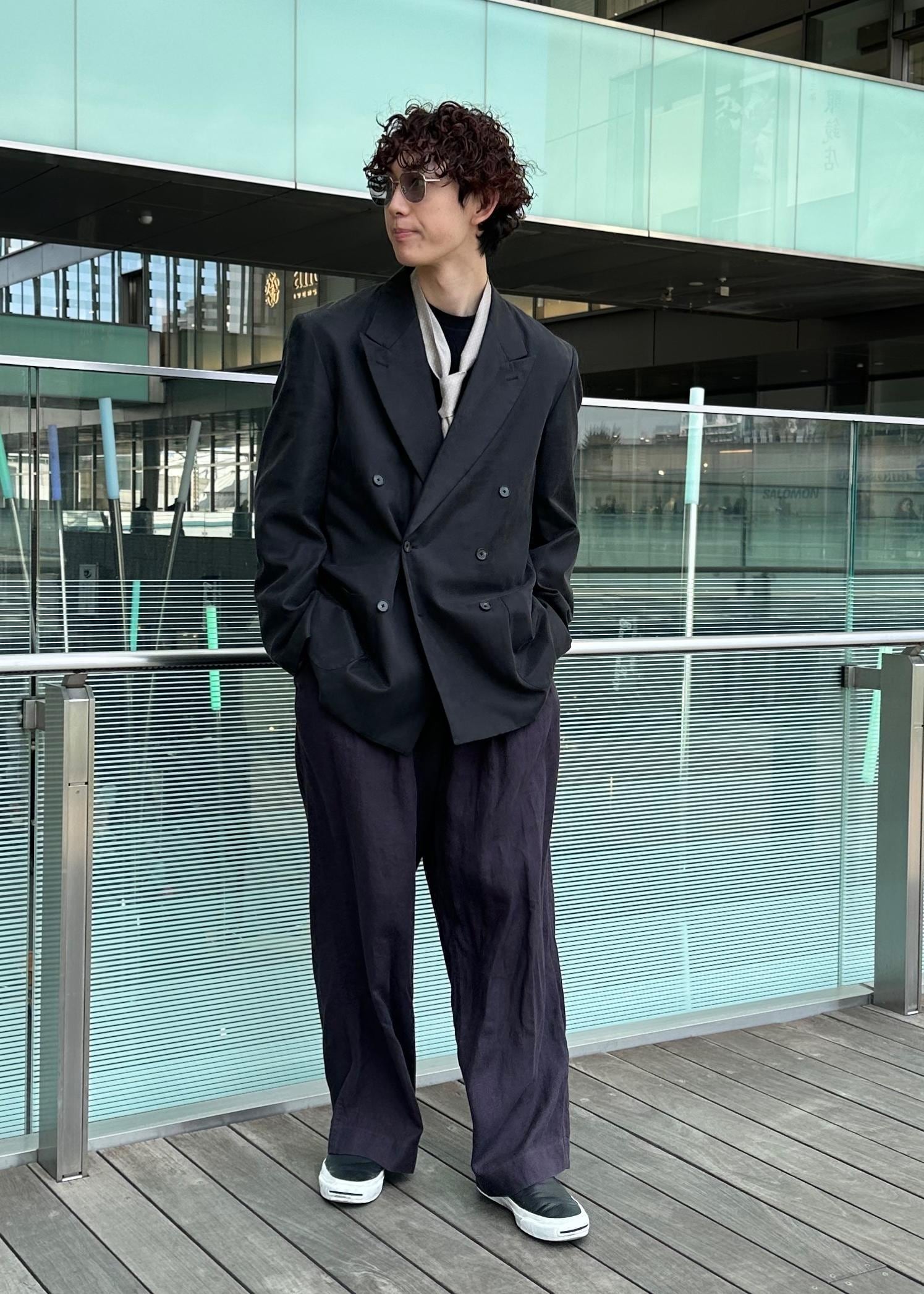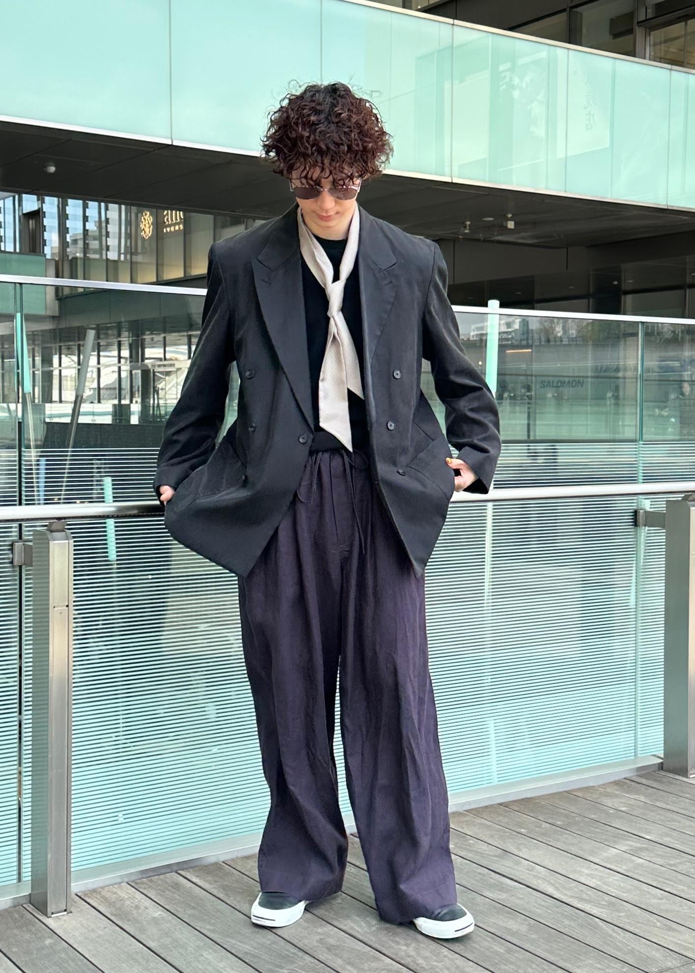 ダークトーンでまとめたモード味のあるコーデ。光沢感のあるテーラードジャケットをメインに、色味と素材感を変えて異素材感のあるコーデに仕上げました。スカーフで上品さをプラスしました。