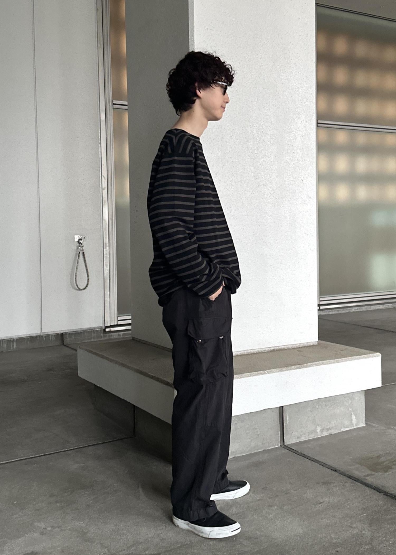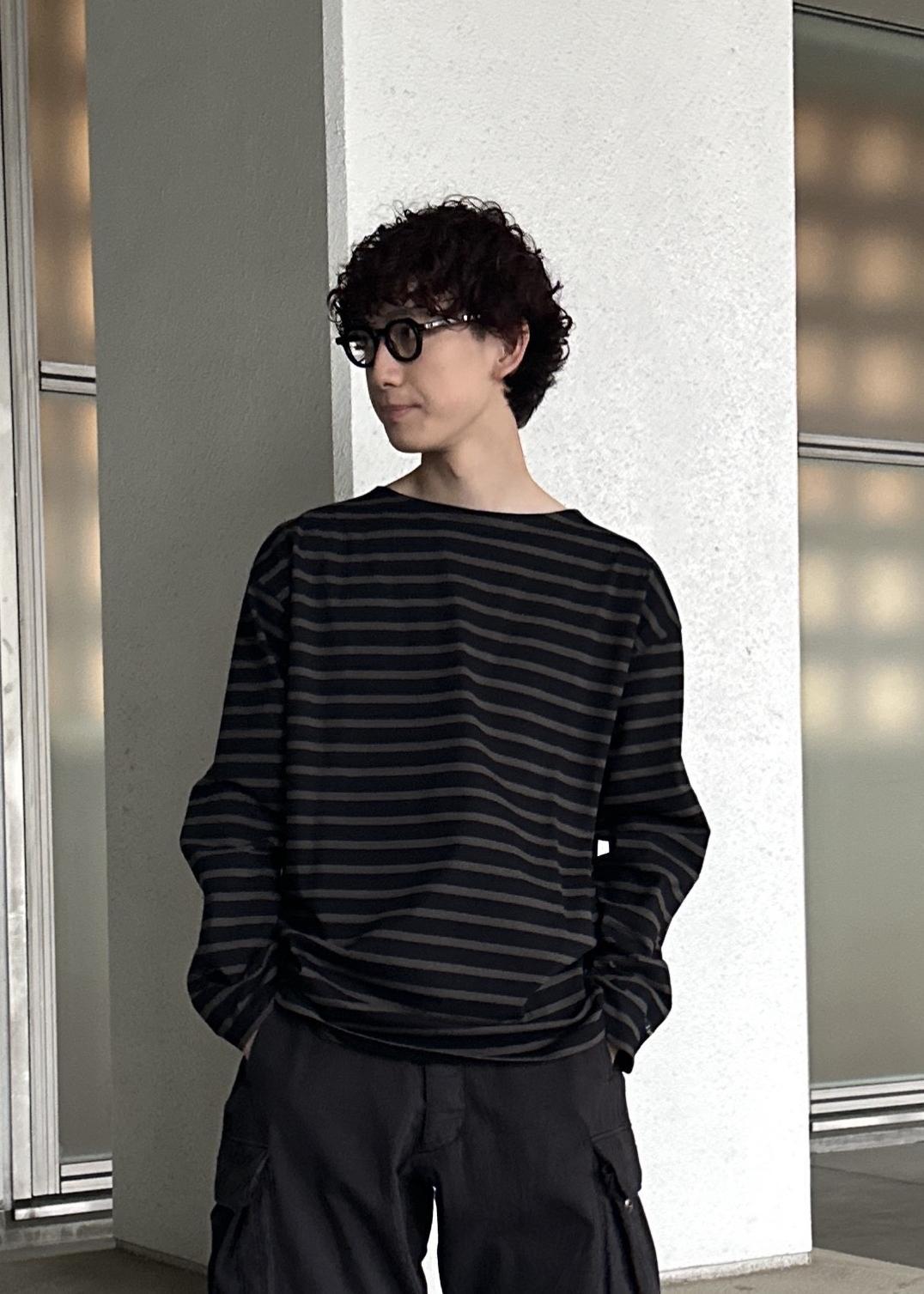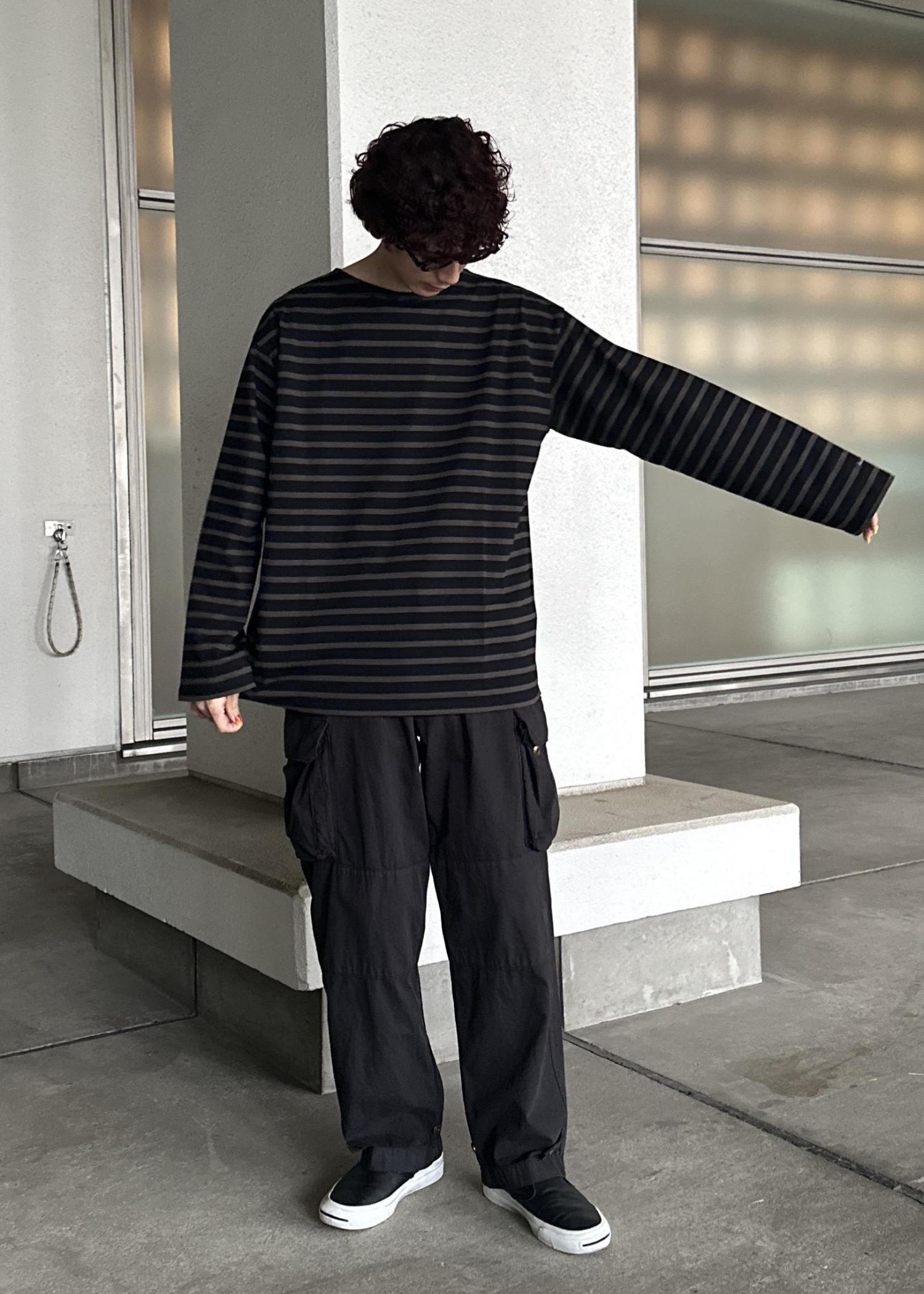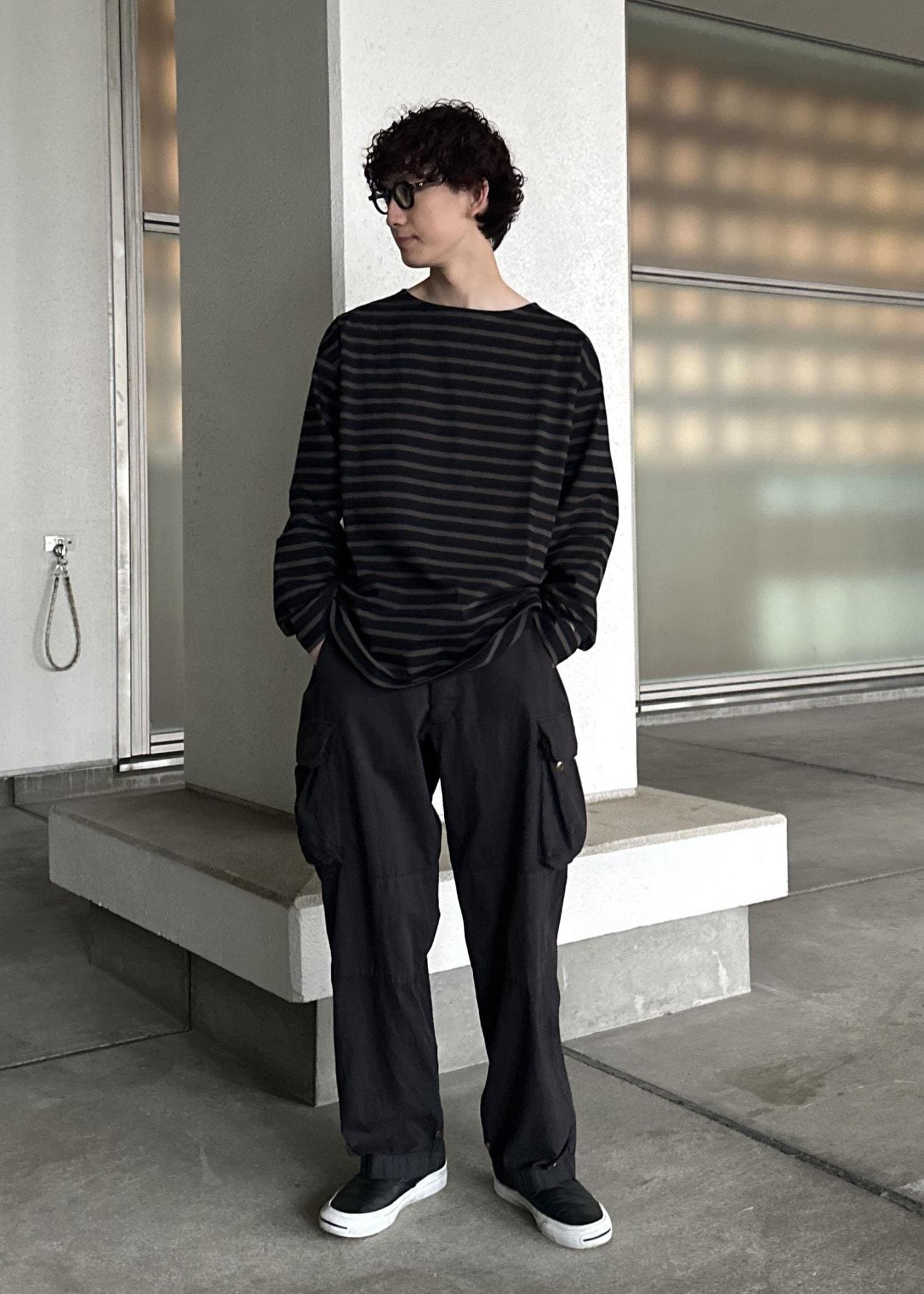 ブラックのカーゴパンツ、ダークブラウンのボーダーTの上からカネマサフィルのライトグレーのシャツを羽織ったシンプルなモノトーンコーデ。シャツが映えるように意識しました。