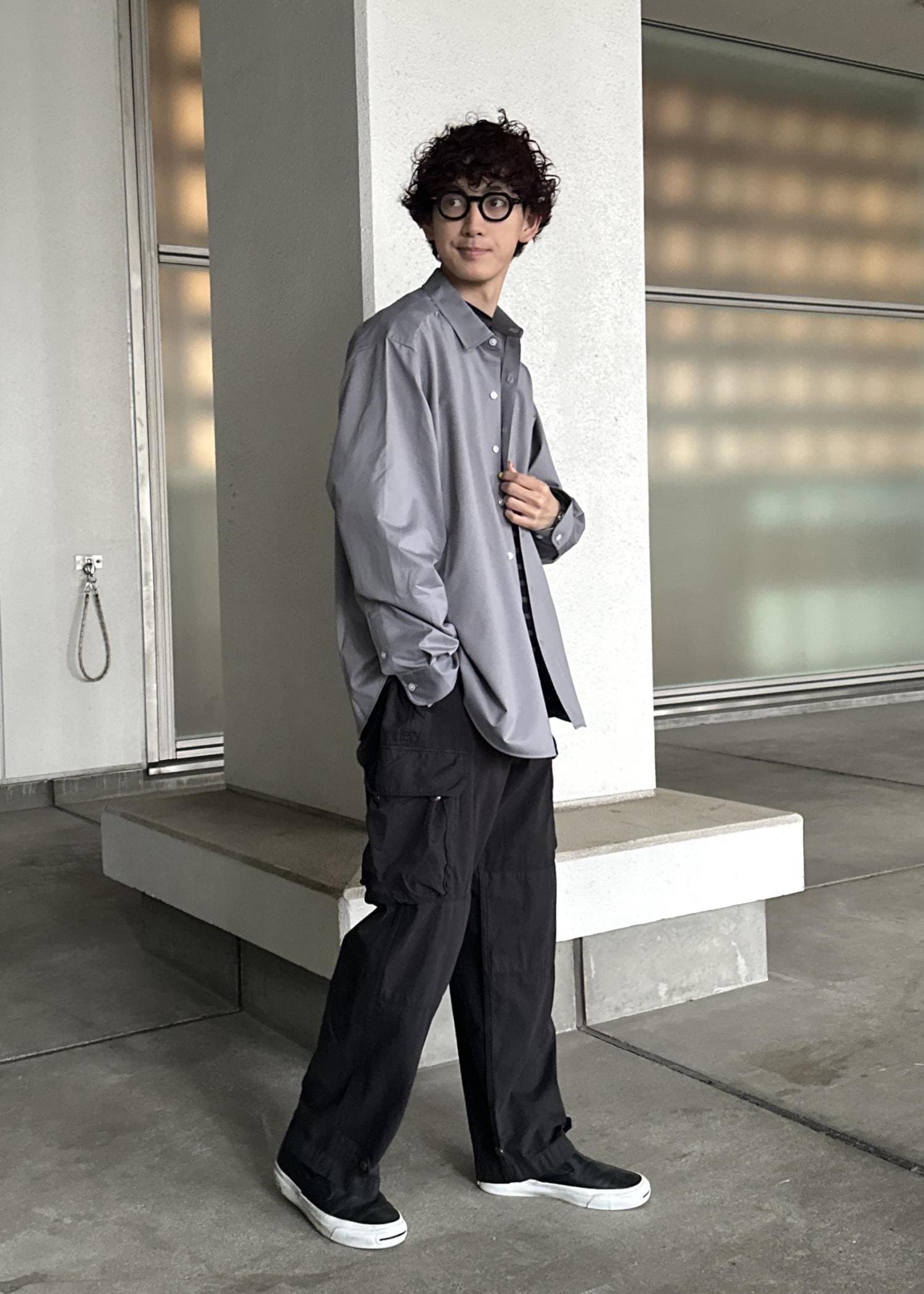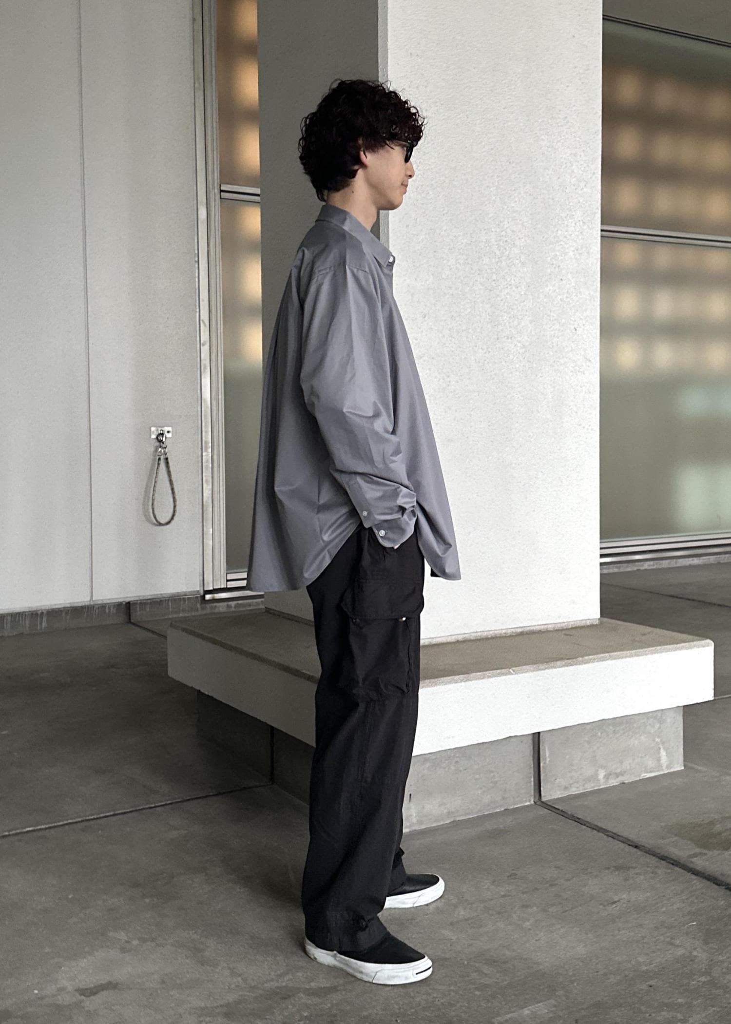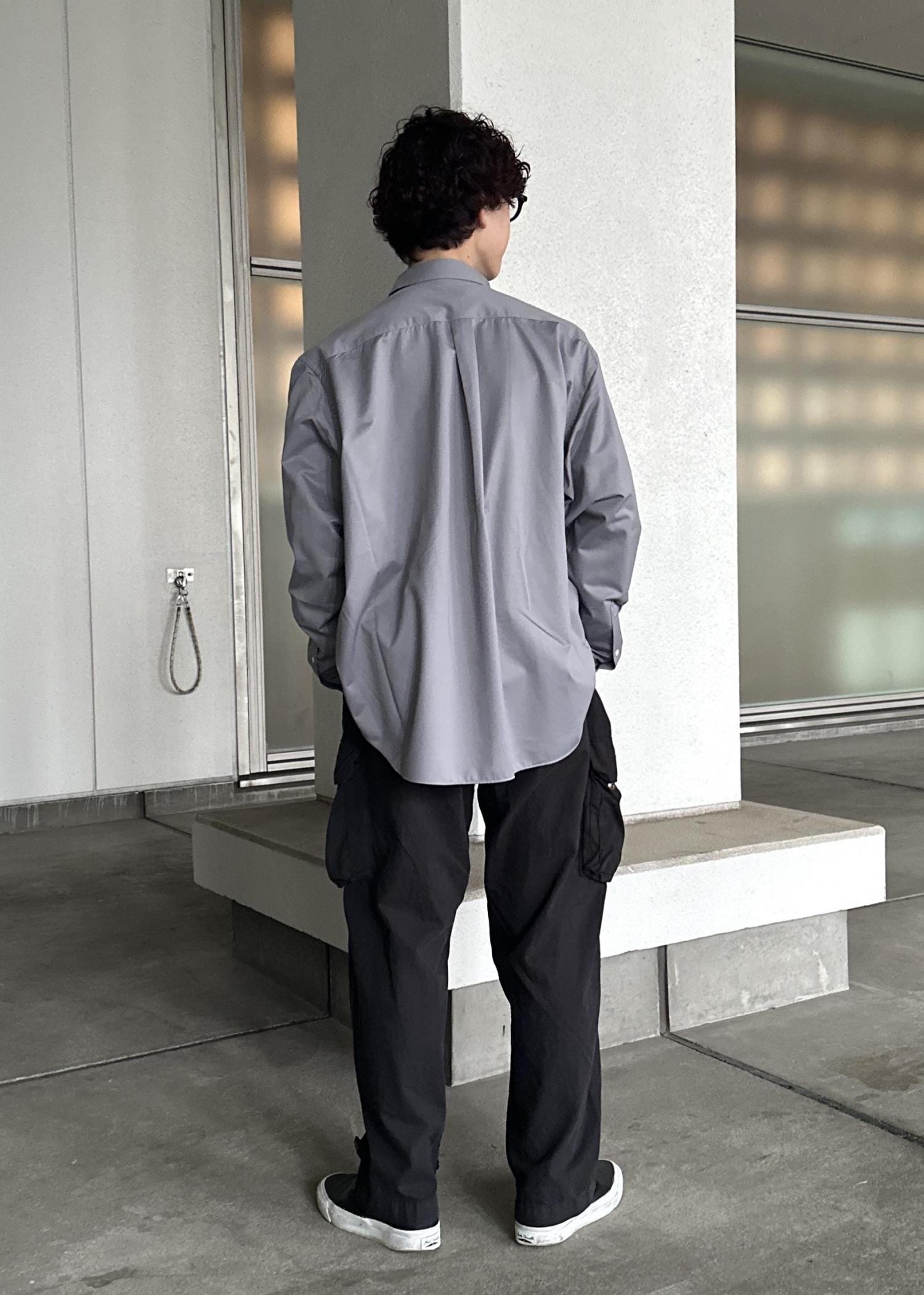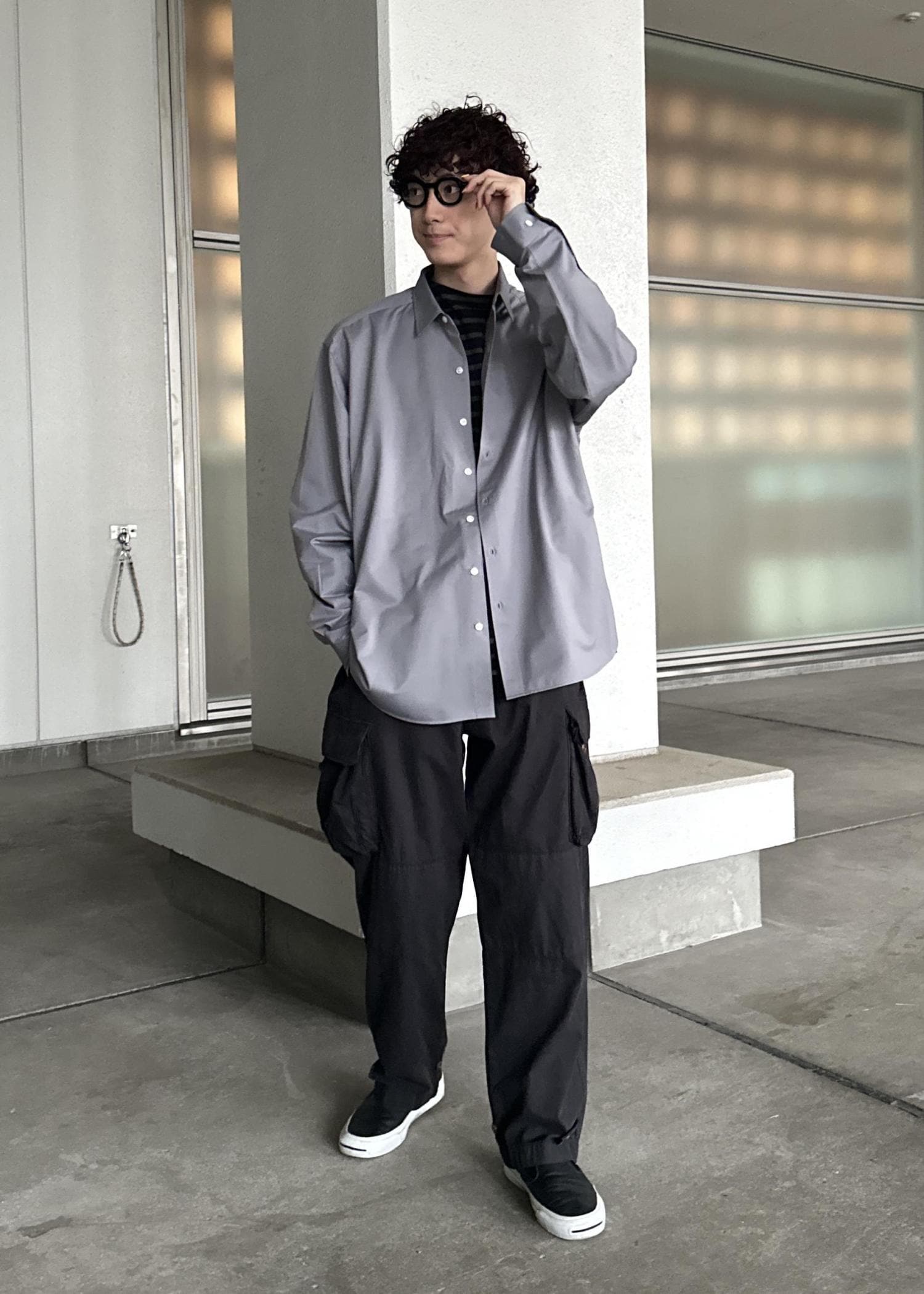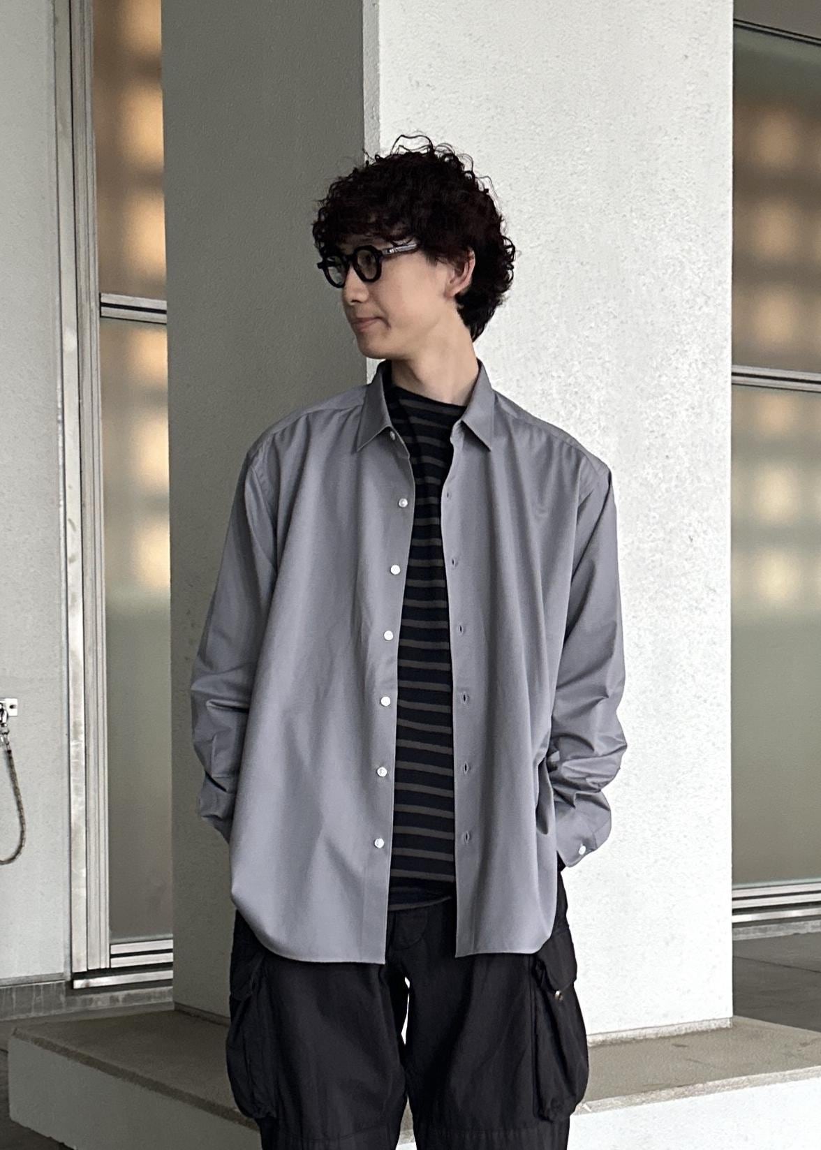 ブラックのカーゴパンツ、ダークブラウンのボーダーTの上からカネマサフィルのライトグレーのシャツを羽織ったシンプルなモノトーンコーデ。シャツが映えるように意識しました。