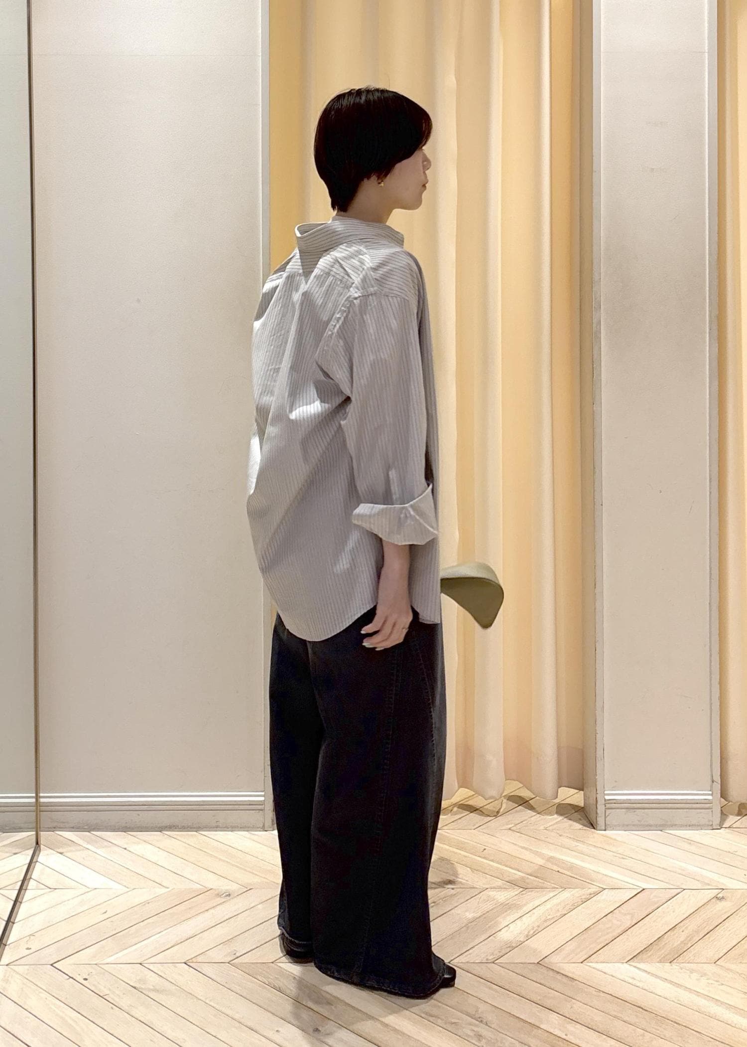 デニムのゴワっと感がないので履きやすく、着丈はアジャスト調整可能なので、小柄な方でも取り入れやすいです!