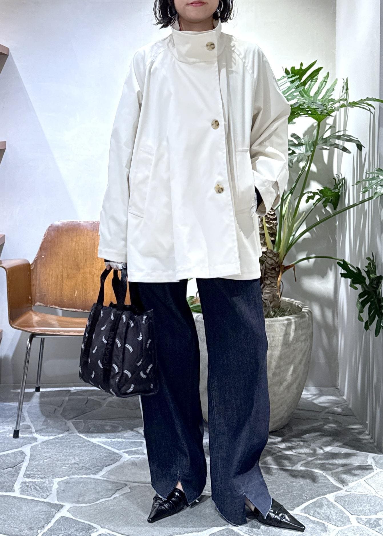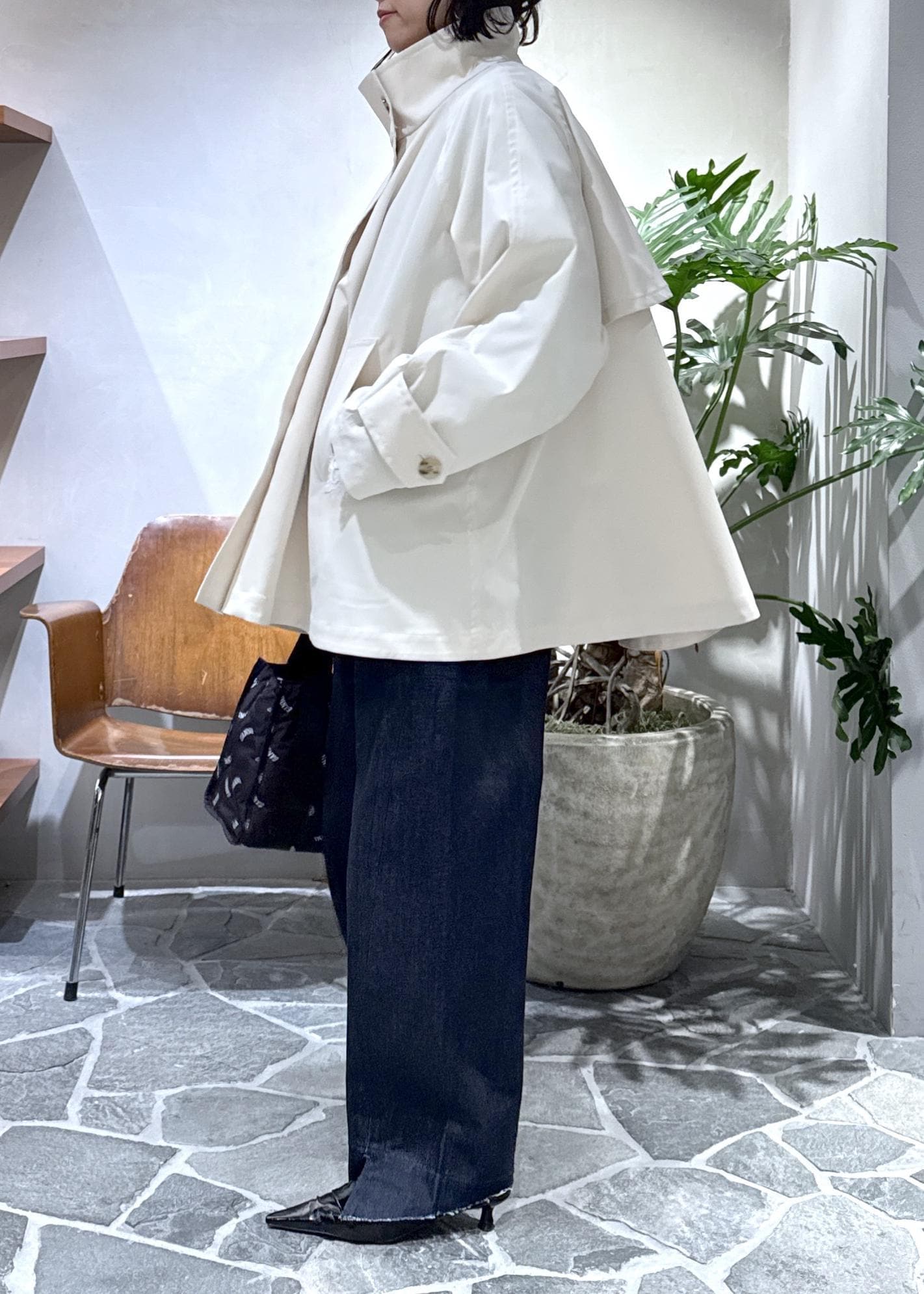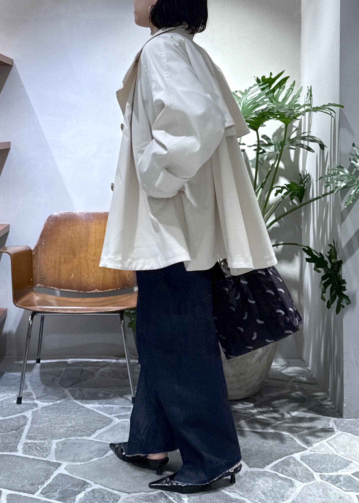 大人気のフレアミドルトレンチコートを使ったモノトーンスタイルのご紹介です。