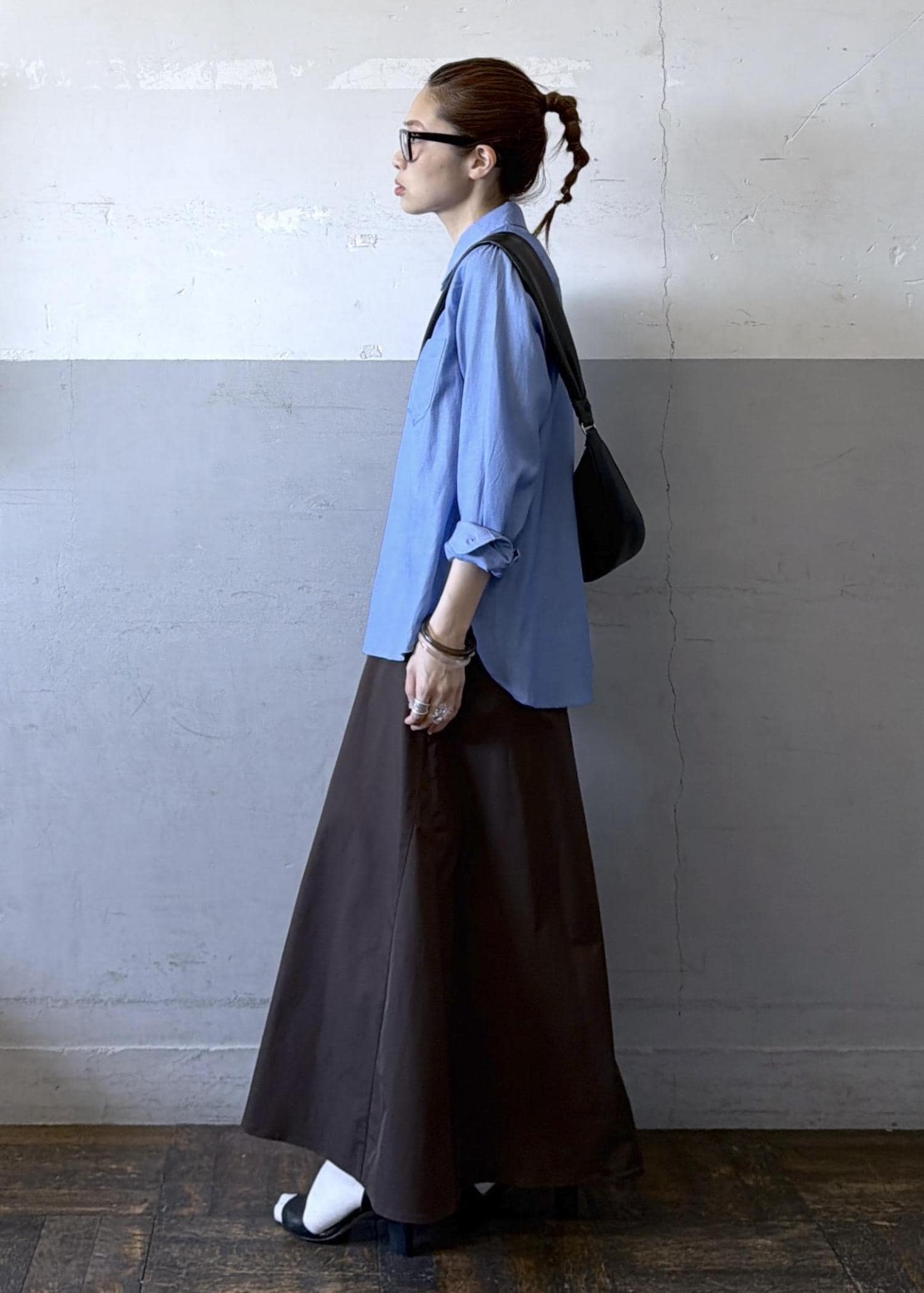 ゆったりシャツもいいけれど、すっきり細身のシャツを合わせてスッキリと。