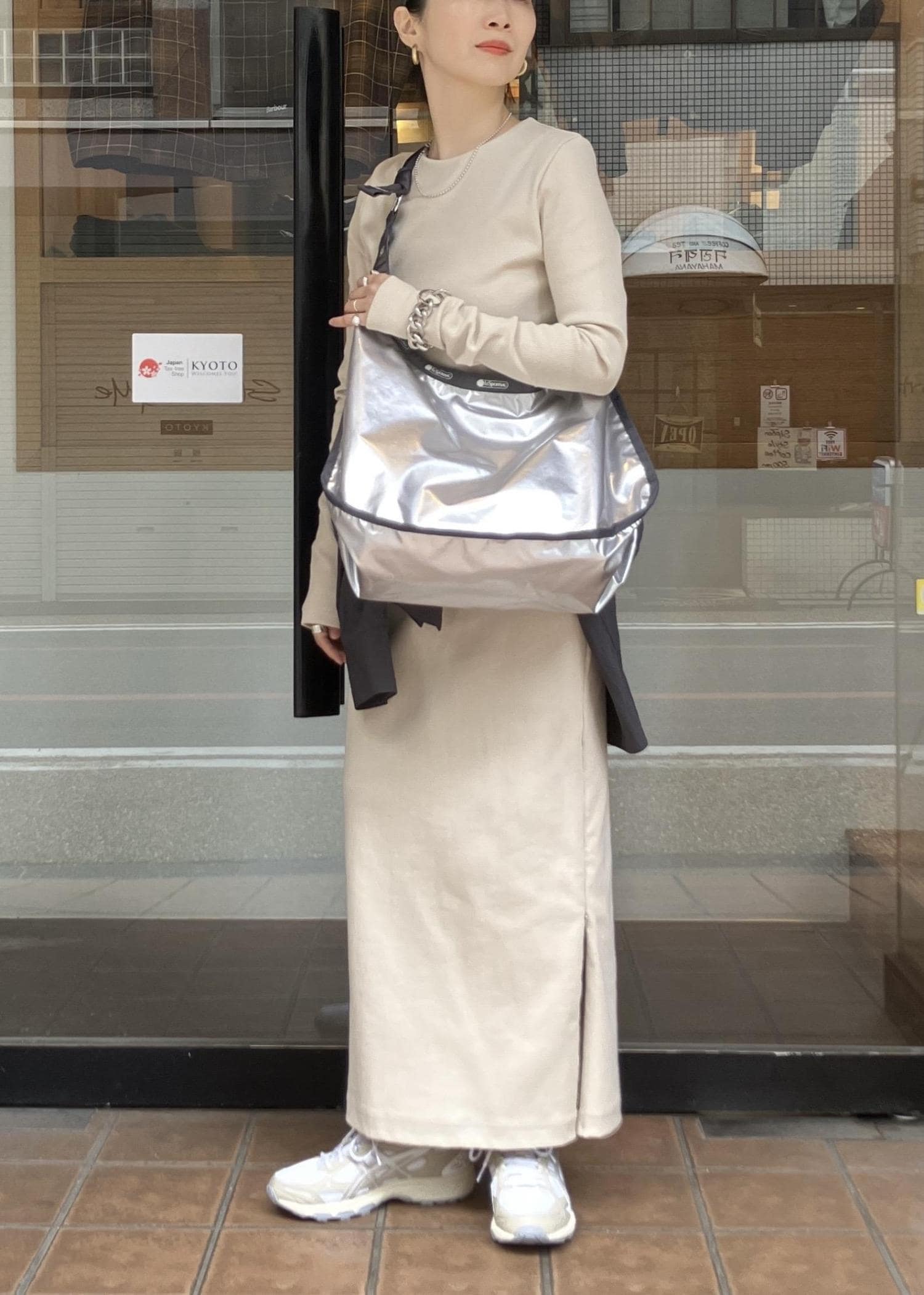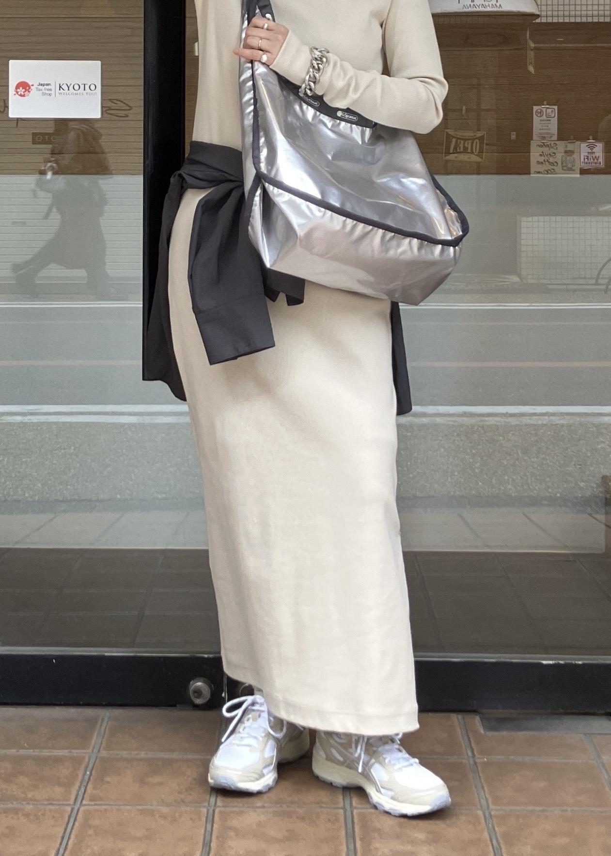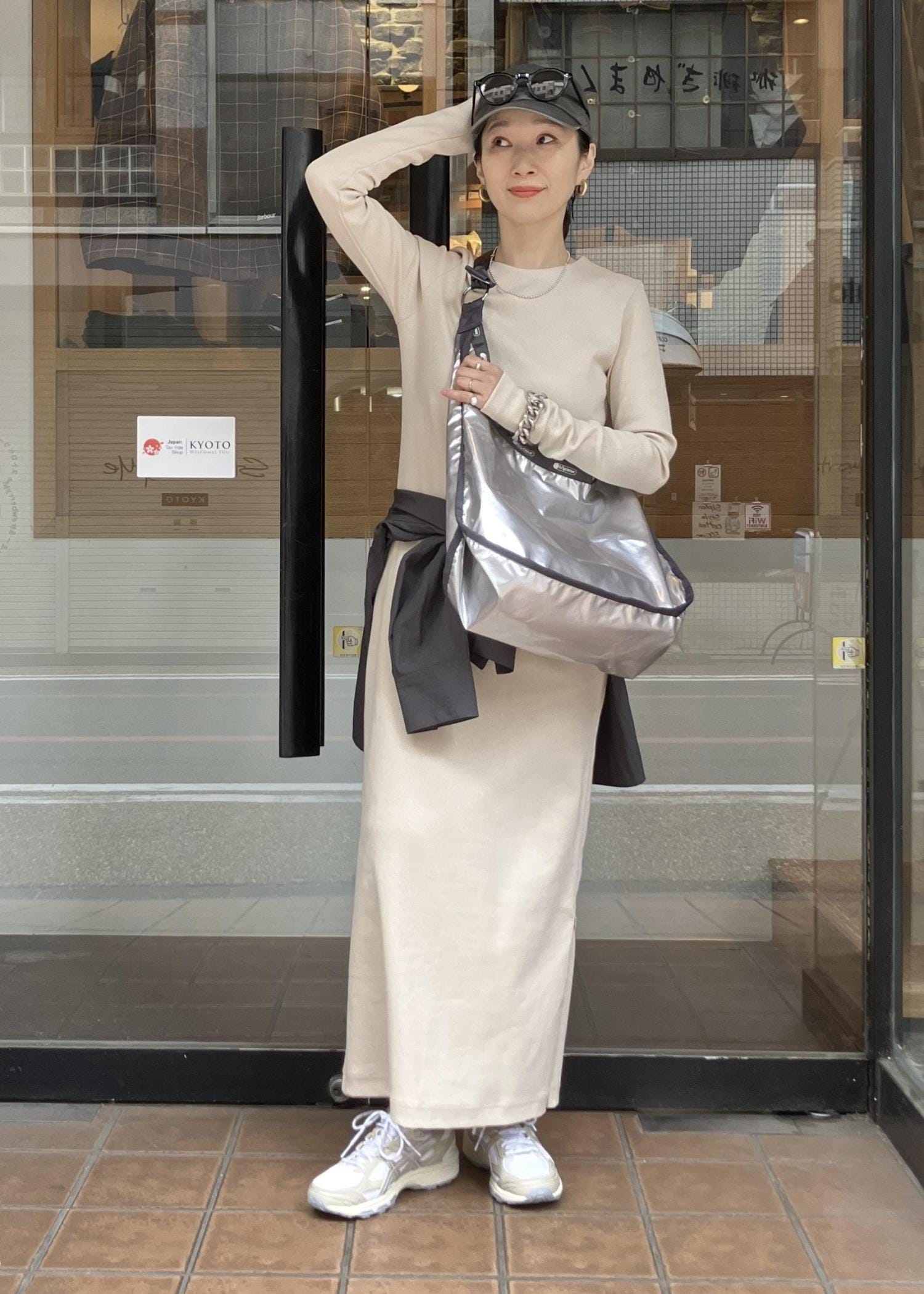 細身のシルエットで、上からマウンテンパーカーを羽織ったり、ジャケットを着たり、スウェットを重ねたり、色んな雰囲気で着れるシンプルカジュアルワンピース。