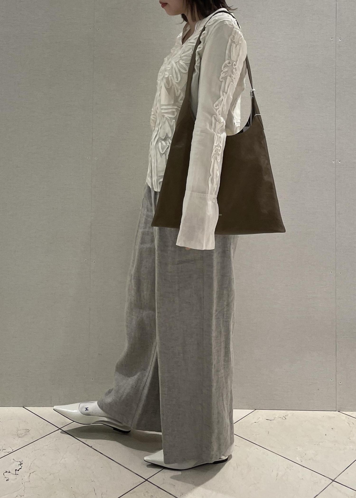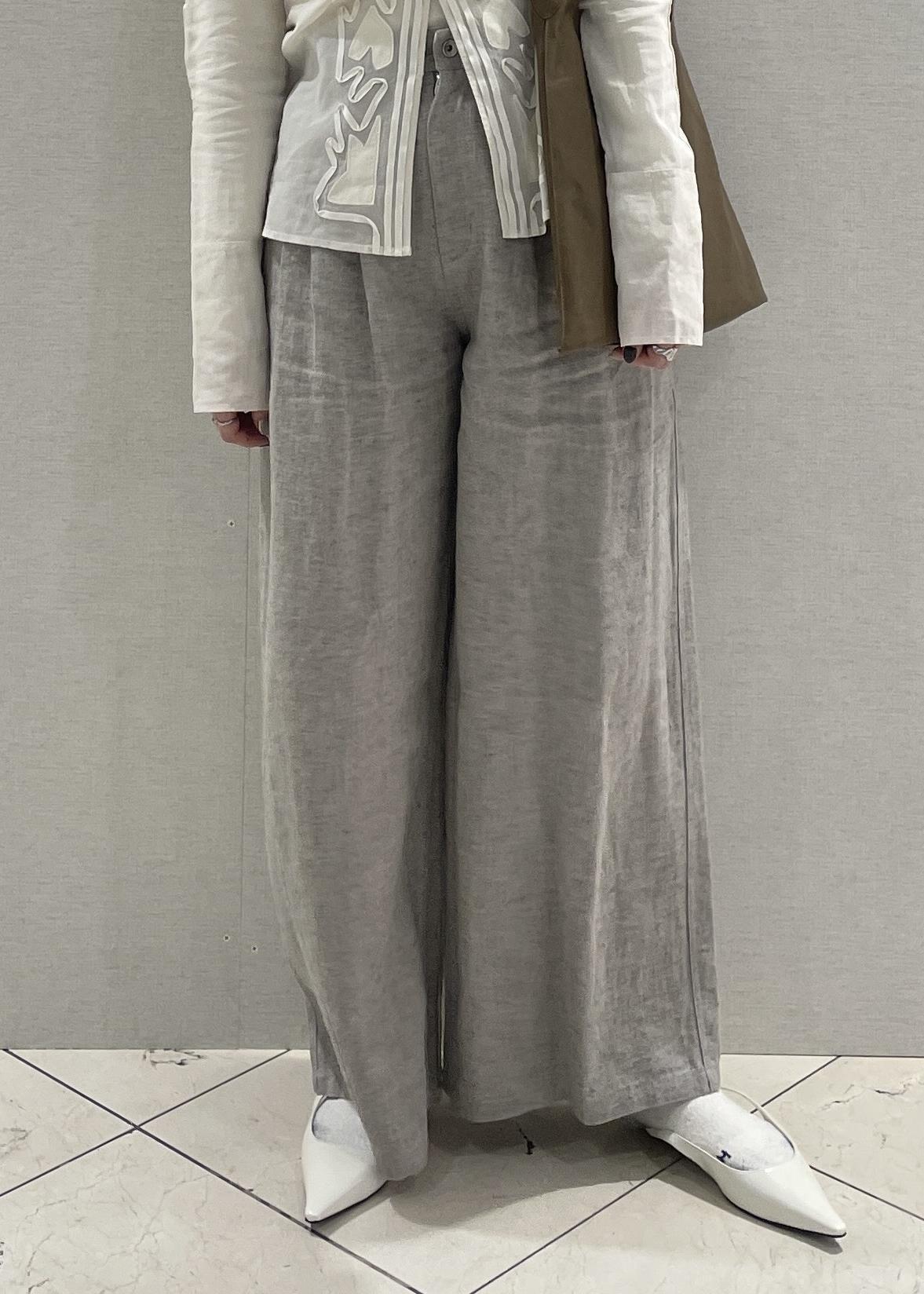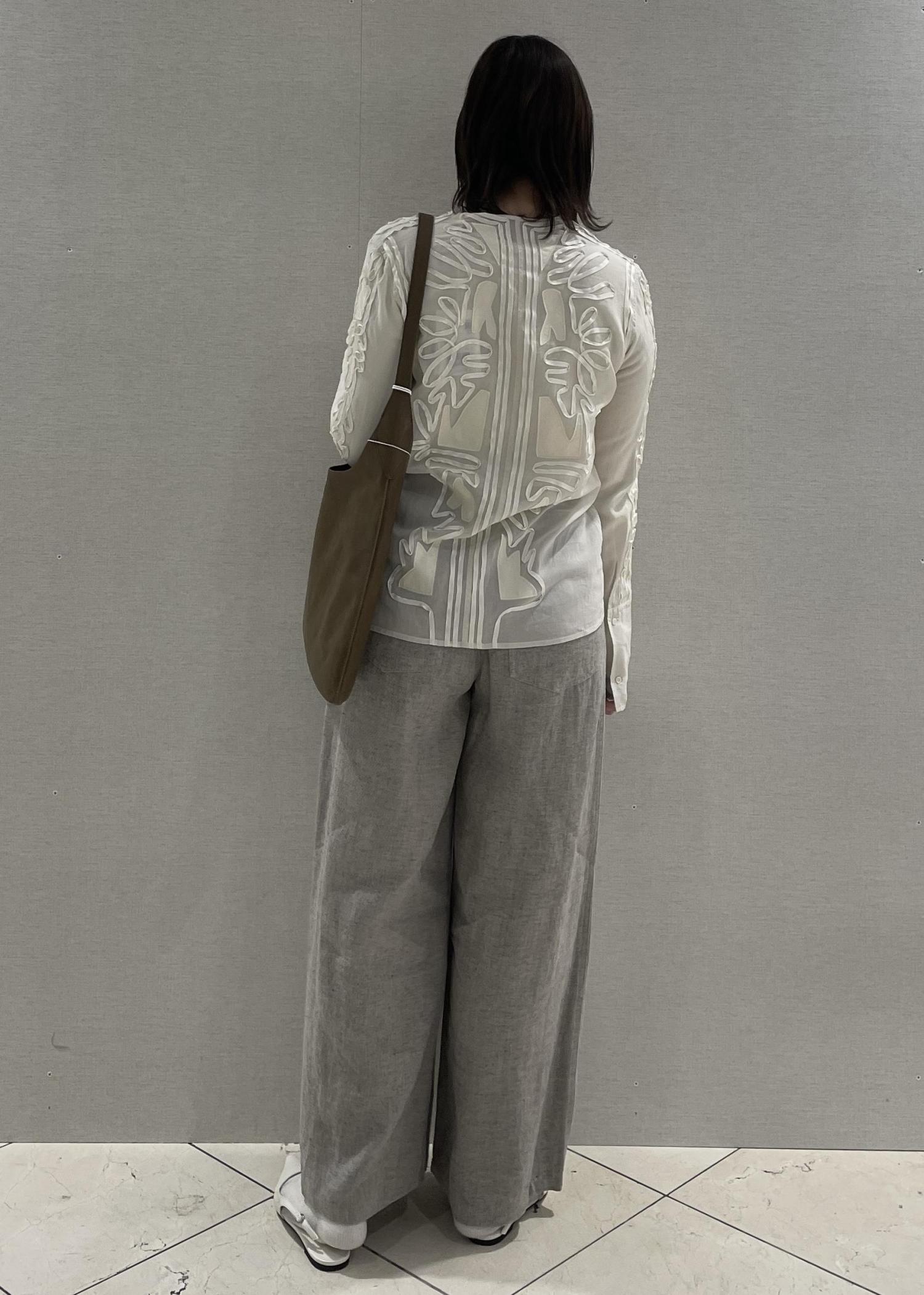 透け感のあるブラウスと、フレアスタイルの麻のパンツで上下共に軽やかな印象に!!