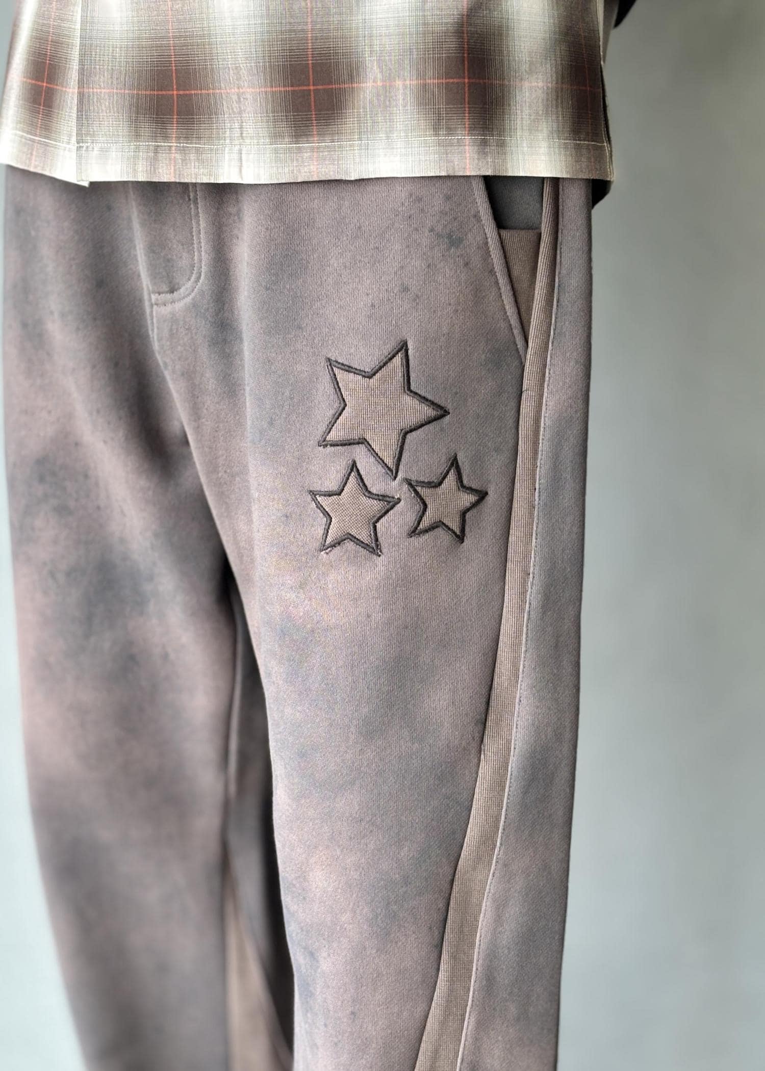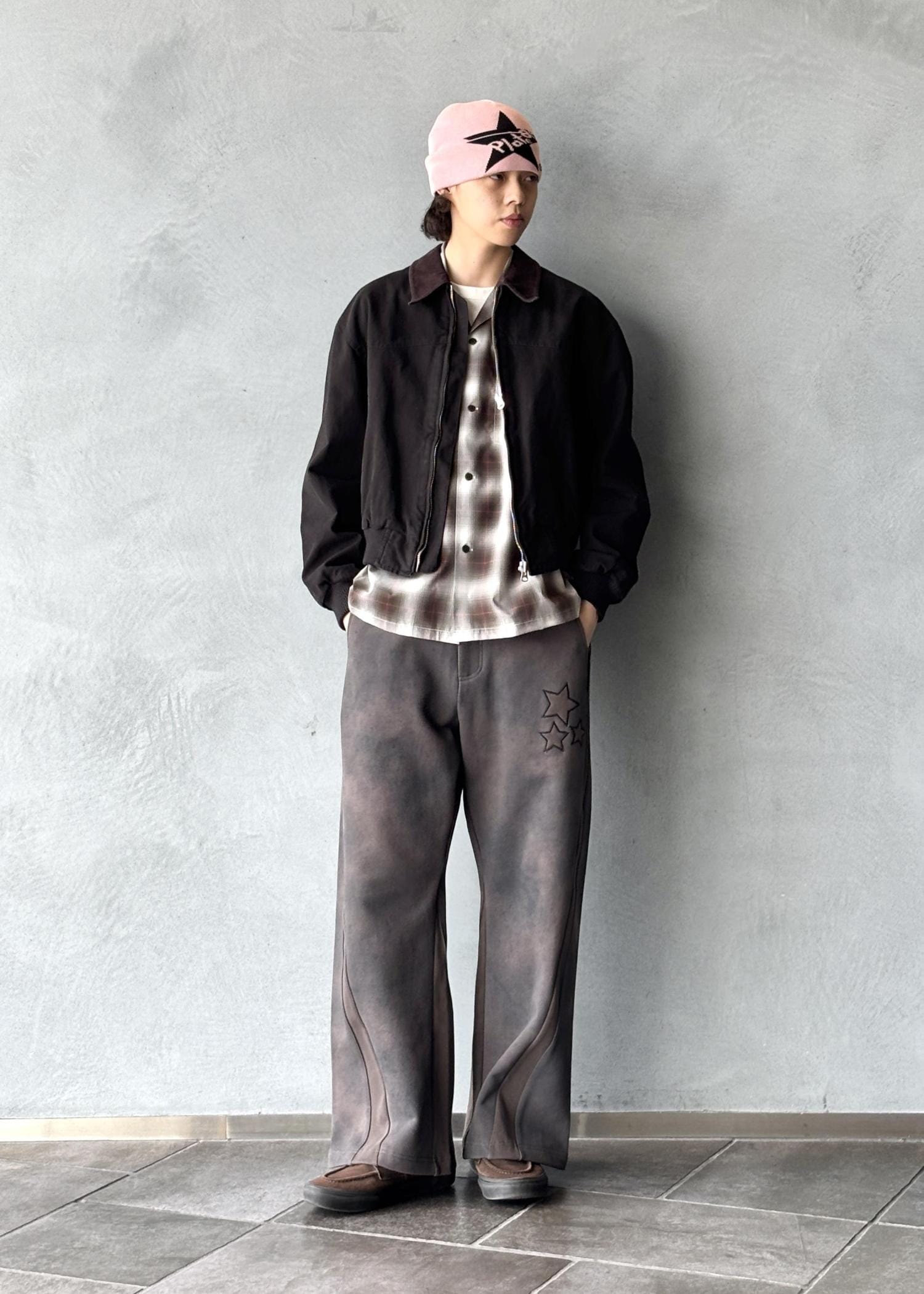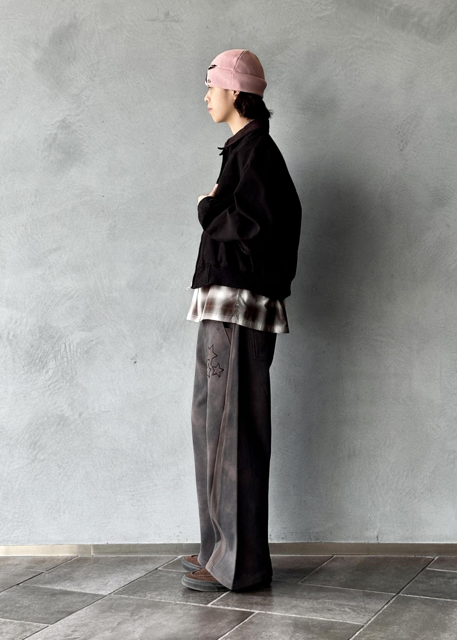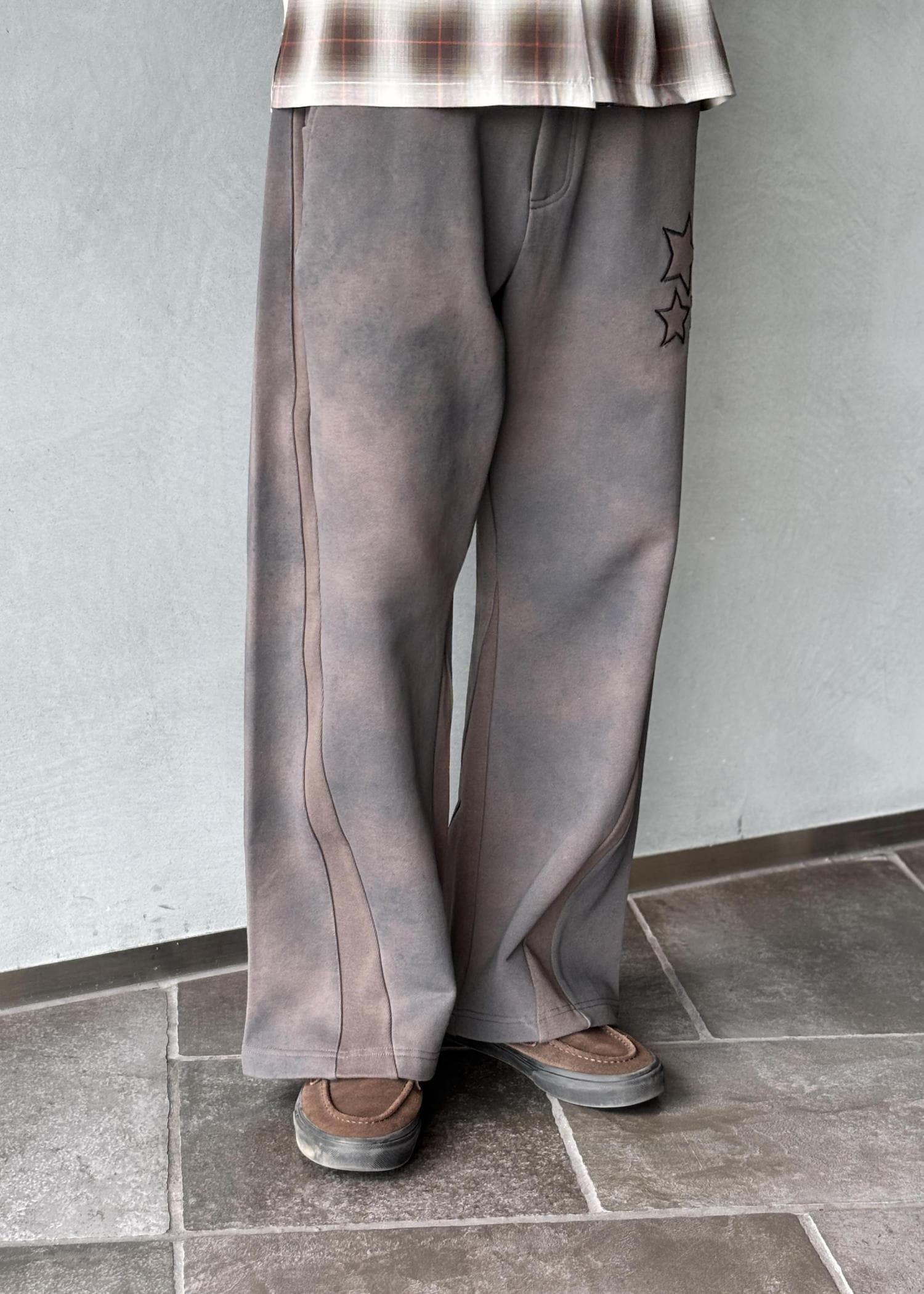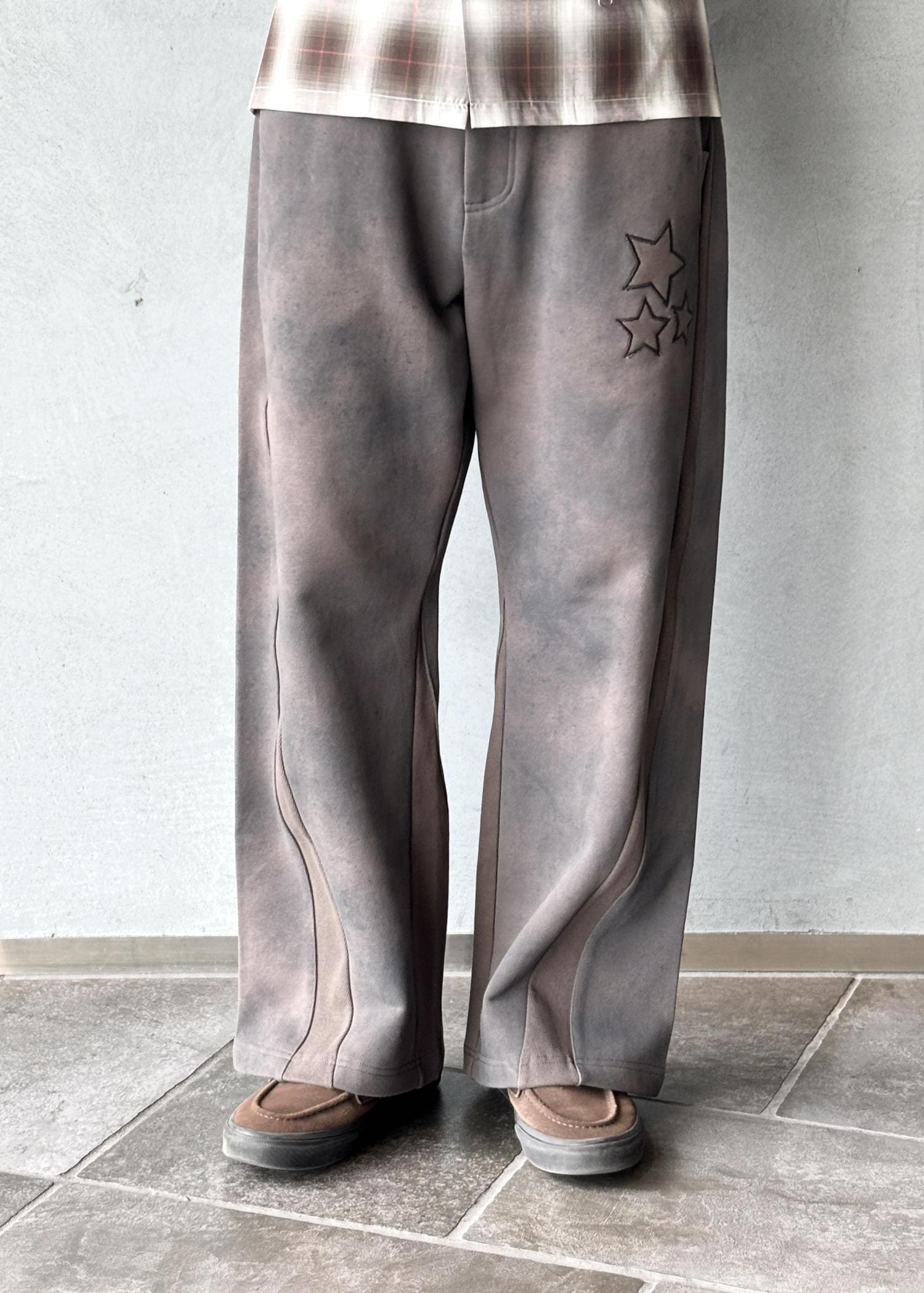 パンツはPLATEAU STUDIOのスウェットパンツで、星のワンポイントがさりげないアクセント。